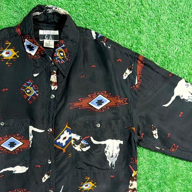 【Lady's】 90s ウエスタン イラスト シルクシャツ / 90年代 シャツ シルク 黒 ブラック オルテガ ネイティブアメリカン バッファロー 総柄 レディース 991