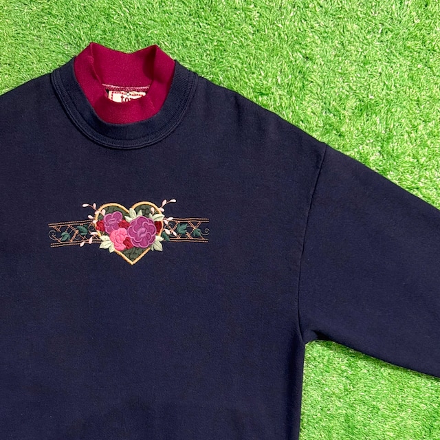【Lady's】90s ハート 刺繍 フェイクレイヤード スウェットシャツ / アメリカ製 USA製 90年代 古着 スウェット スエット トレーナー ネイビー 紺 レディース 1027
