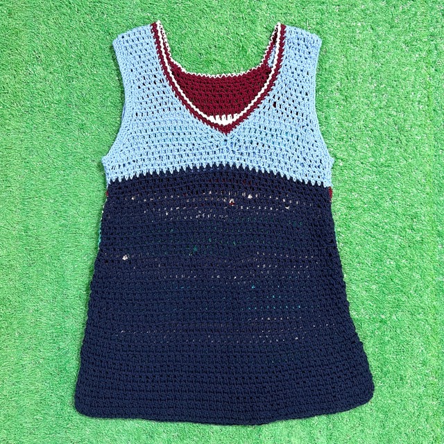 かぎ針編みで仕立てられた、クロシェのマルチボーダー ニットベストです。 編み目の立体感と、ブルー系をベースにした配色が目を引く一枚で、ハンドニットらしい温かみのある雰囲気が魅力。通気性のある編み地なので、重たく見えずレイヤードしやすいアイテムです。 【着こなし提案】 Tシャツやタンクトップに重ねるだけで、シンプルなコーデのアクセントに。 デニムやスラックスと合わせてラフに着ても、スカートと合わせて少し可愛らしくまとめるのもおすすめです。 季節の変わり目には、シャツの上からレイヤードしても楽しめます。 着用画像のご希望やご質問は、画面下の「ショップに質問する」ボタンよりどうぞ◎ ---------- <SIZE> 肩幅34cm / 身幅39cm / 袖口21cm / 着丈55cm サイズ表記なし(S相当) <CONDITION> 編み目が大きい部分が点々とあり (全て画像参照) 着用に支障のあるダメージはございません。 ※一点ものです。気になる方はお早めに。 「ショップに質問する」より最長1週間のお取り置きも可能です。 ---------- 【配送方法について】 こちらの商品はレターパック(全国一律600円)でお届けいたします。 ※3着以上ご購入の方は、商品オプションの「3着以上購入の方はこちら」をご選択ください。 ---------- 【クーポン情報】 初回限定500円OFFクーポン適用可能! ご購入時にクーポンコード【PEACEFUL500】を入力してください。 【ショップフォローのご案内】 Pay IDアプリでフォローいただくと、新作やキャンペーンを最速でお届けします。 ▶︎ フォローはこちら https://thebase.com/to_app?s=shop&shop_id=pcefulvalley-base-ec&follow=truehttps://thebase.com/to_app?s=shop&shop_id=pcefulvalley-base-ec&follow=true ---------- 【ご購入前にご確認ください】 USEDのため小さなシミ・ほつれ等がある場合がございます。 色味は実物と異なる場合がございます。サイズ計測は多少の誤差があります。 店頭販売と在庫を共有しているため、売切れの場合があります。 返品・交換は承っておりません。 ご質問は「ショップに質問する」またはInstagram DMよりお気軽にどうぞ。