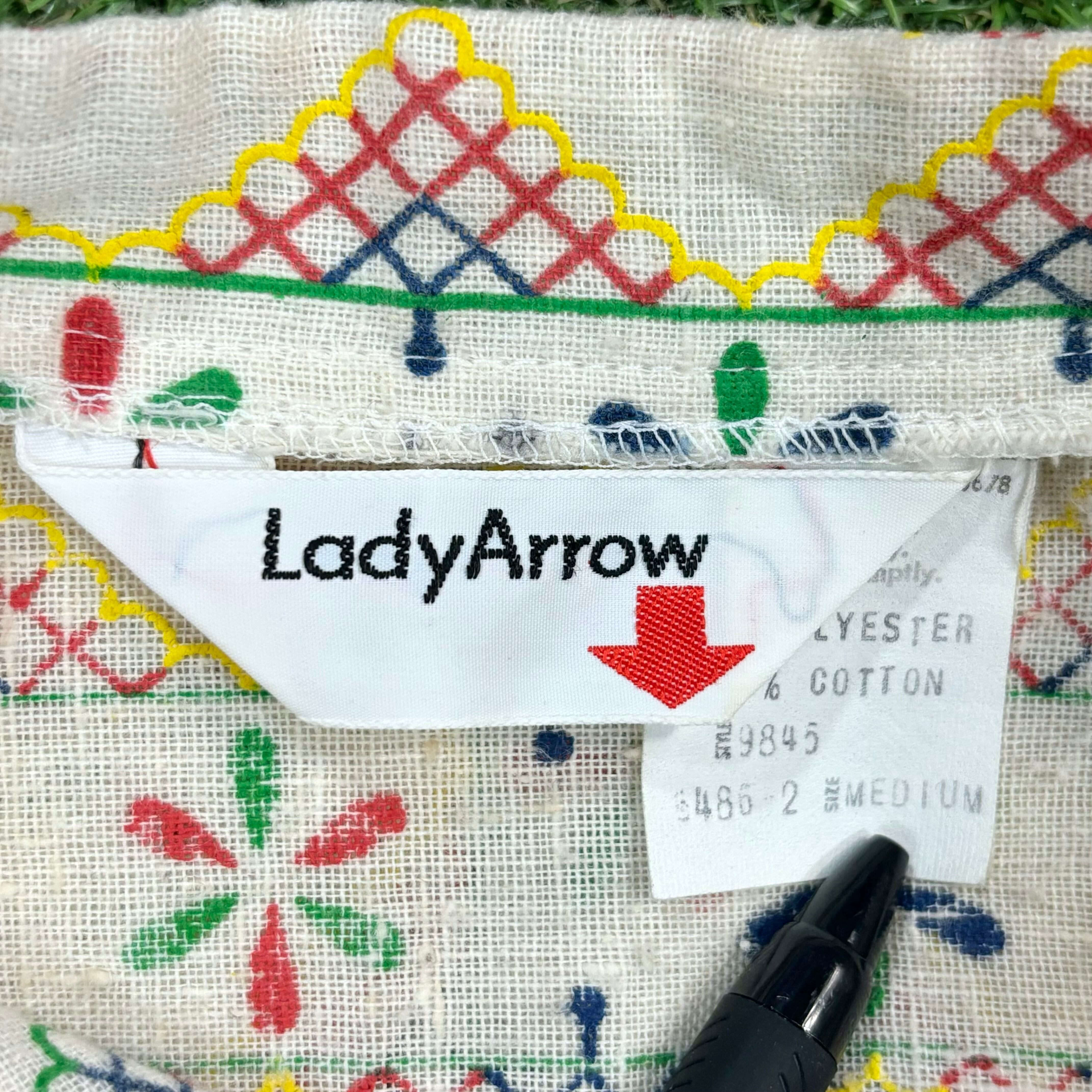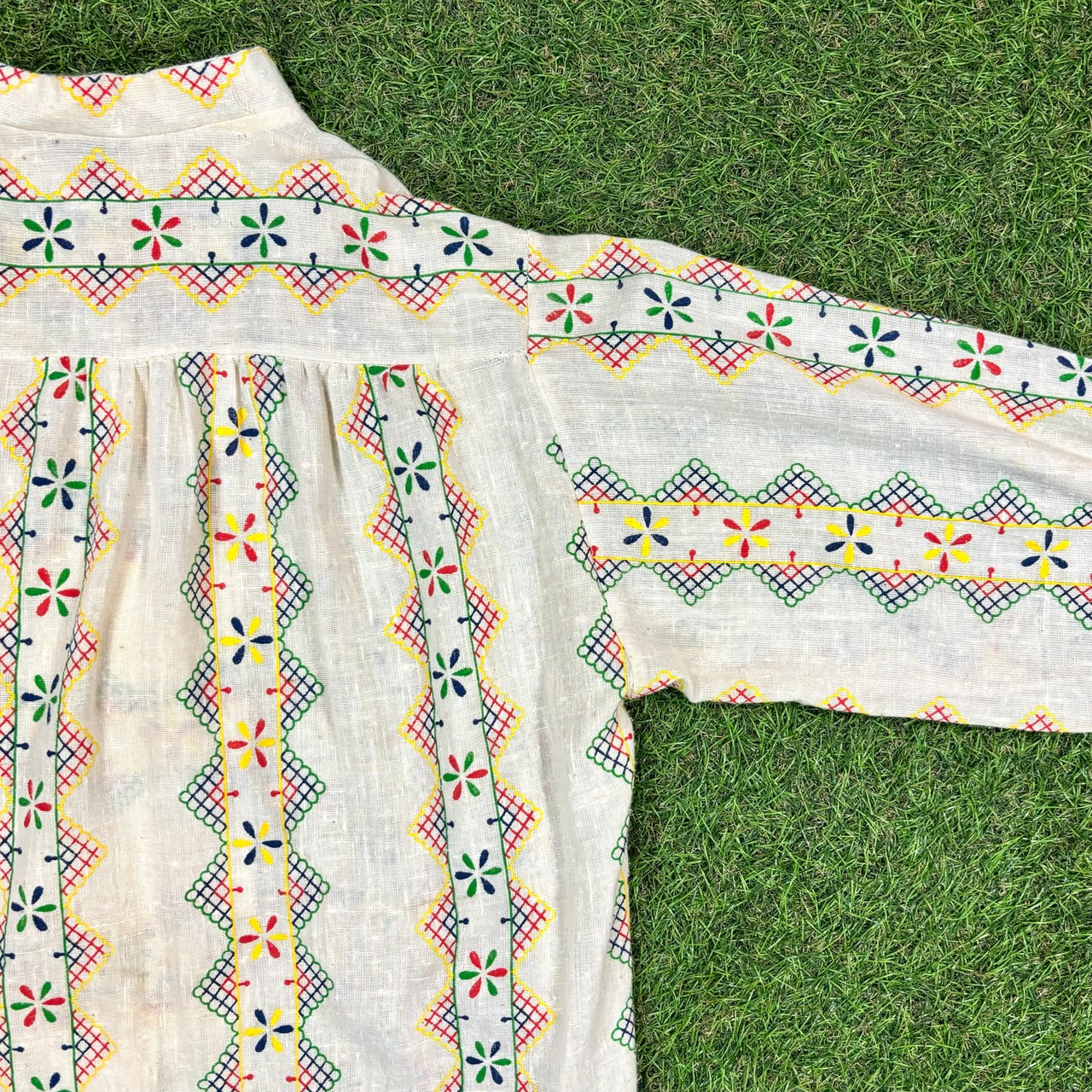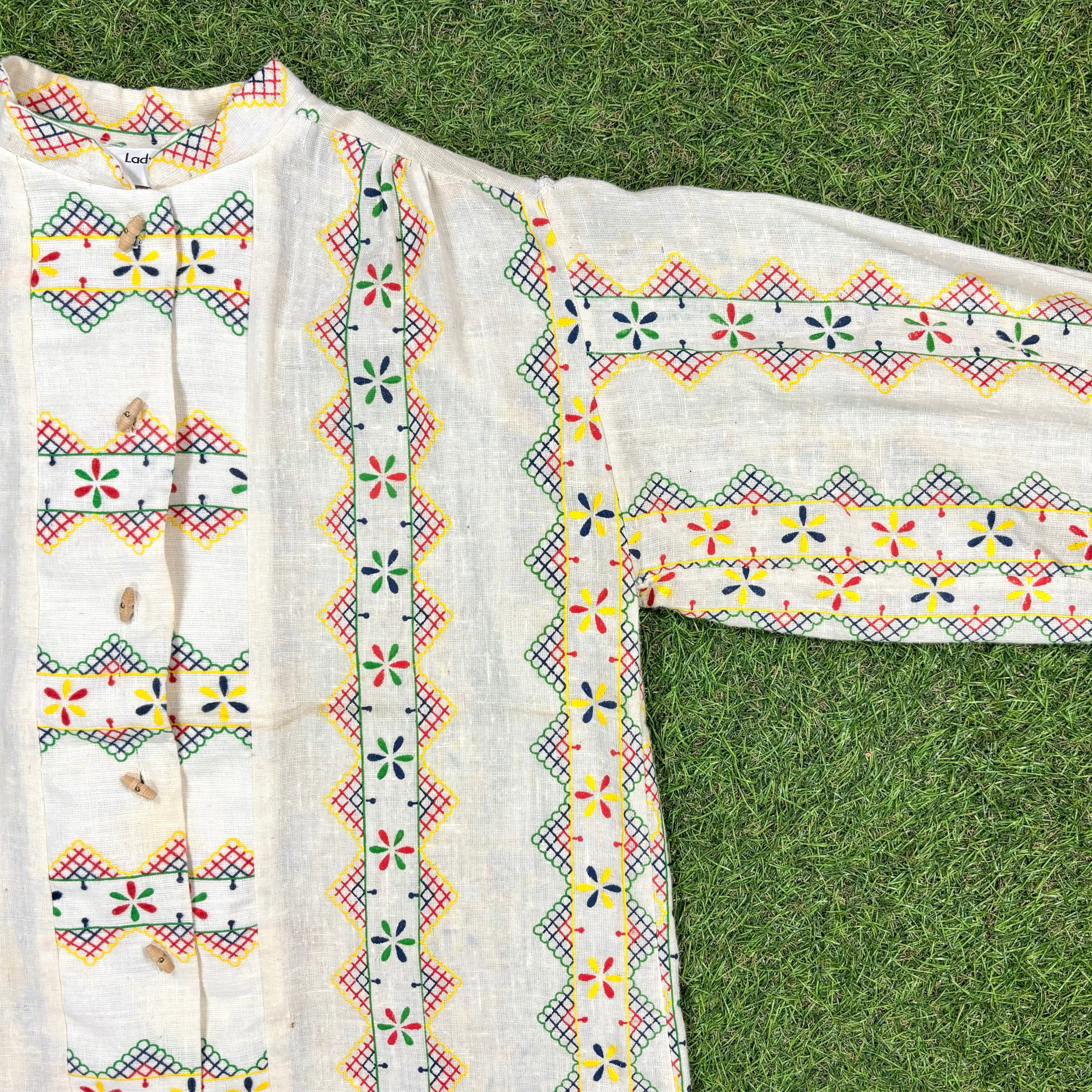 【Lady's】 70s ボヘミアン デザイン ノーカラー シャツ / 70年代 古着 レディース 柄シャツ 生成 アイボリー