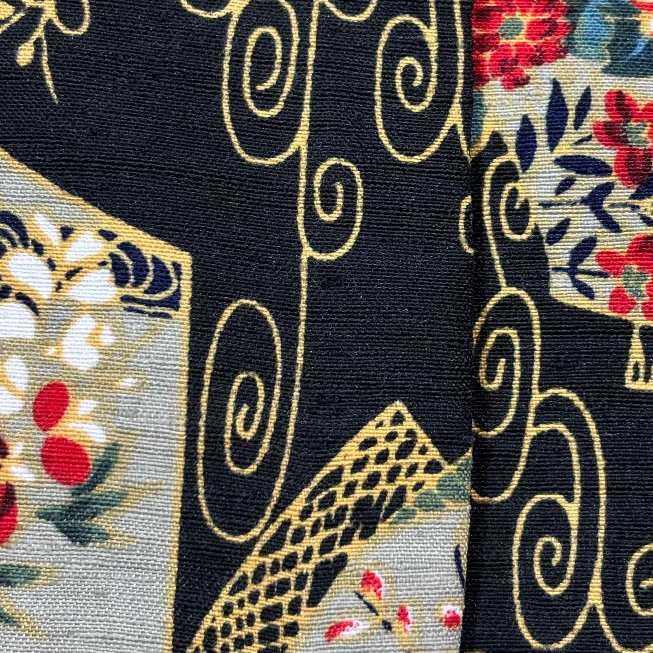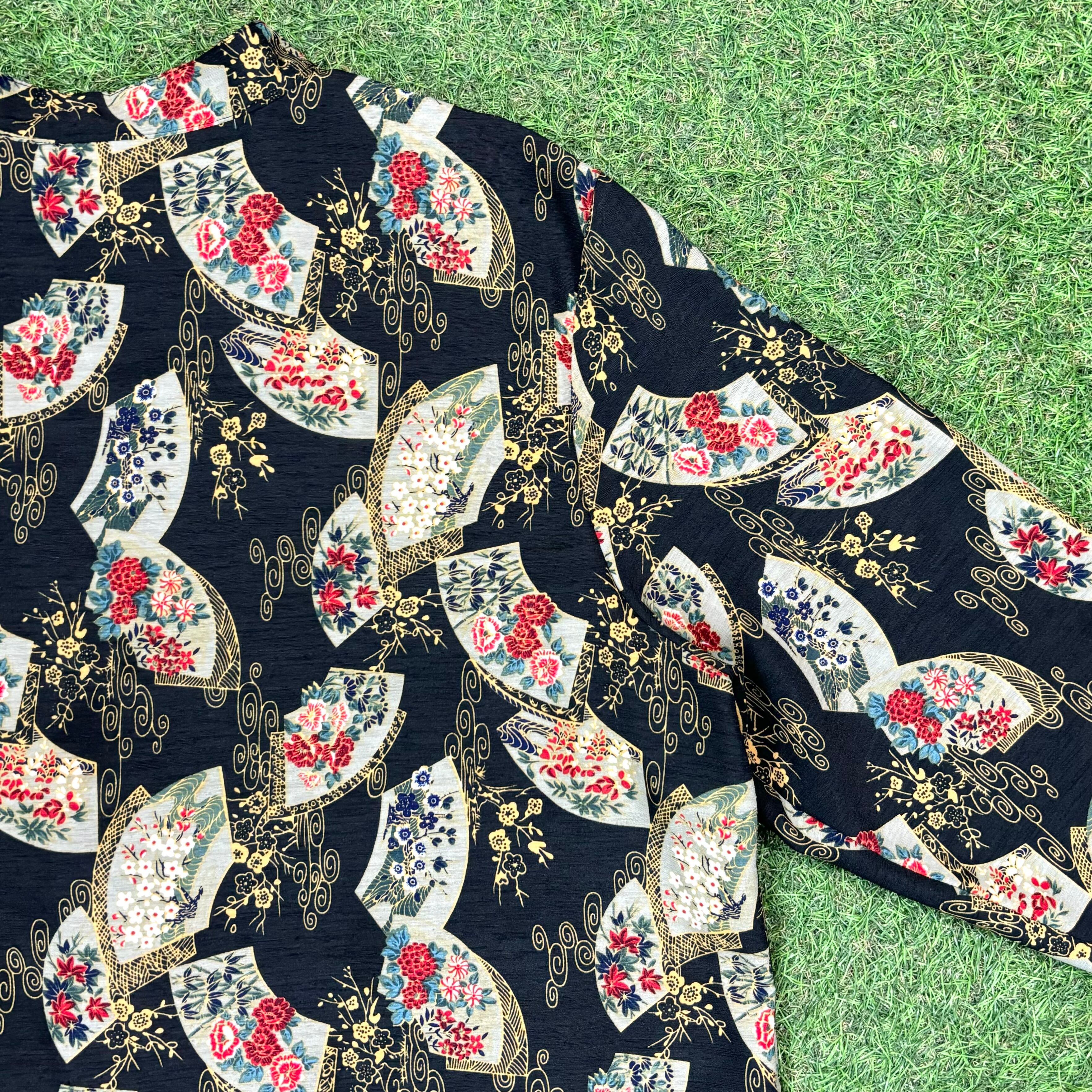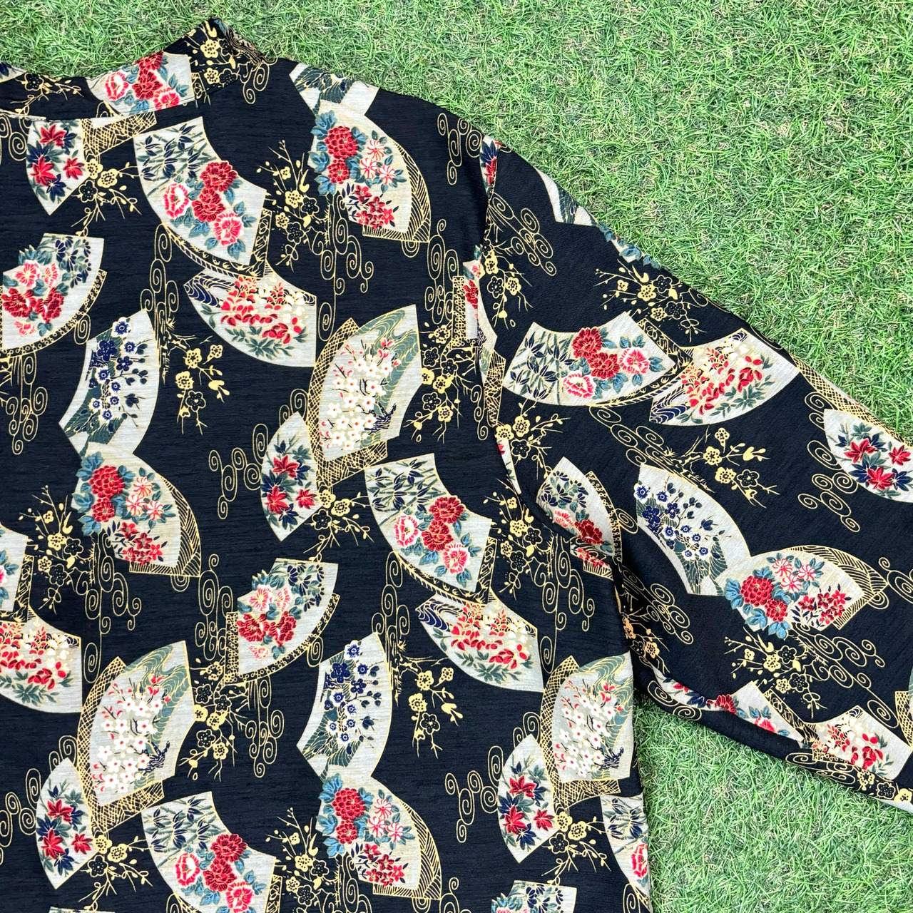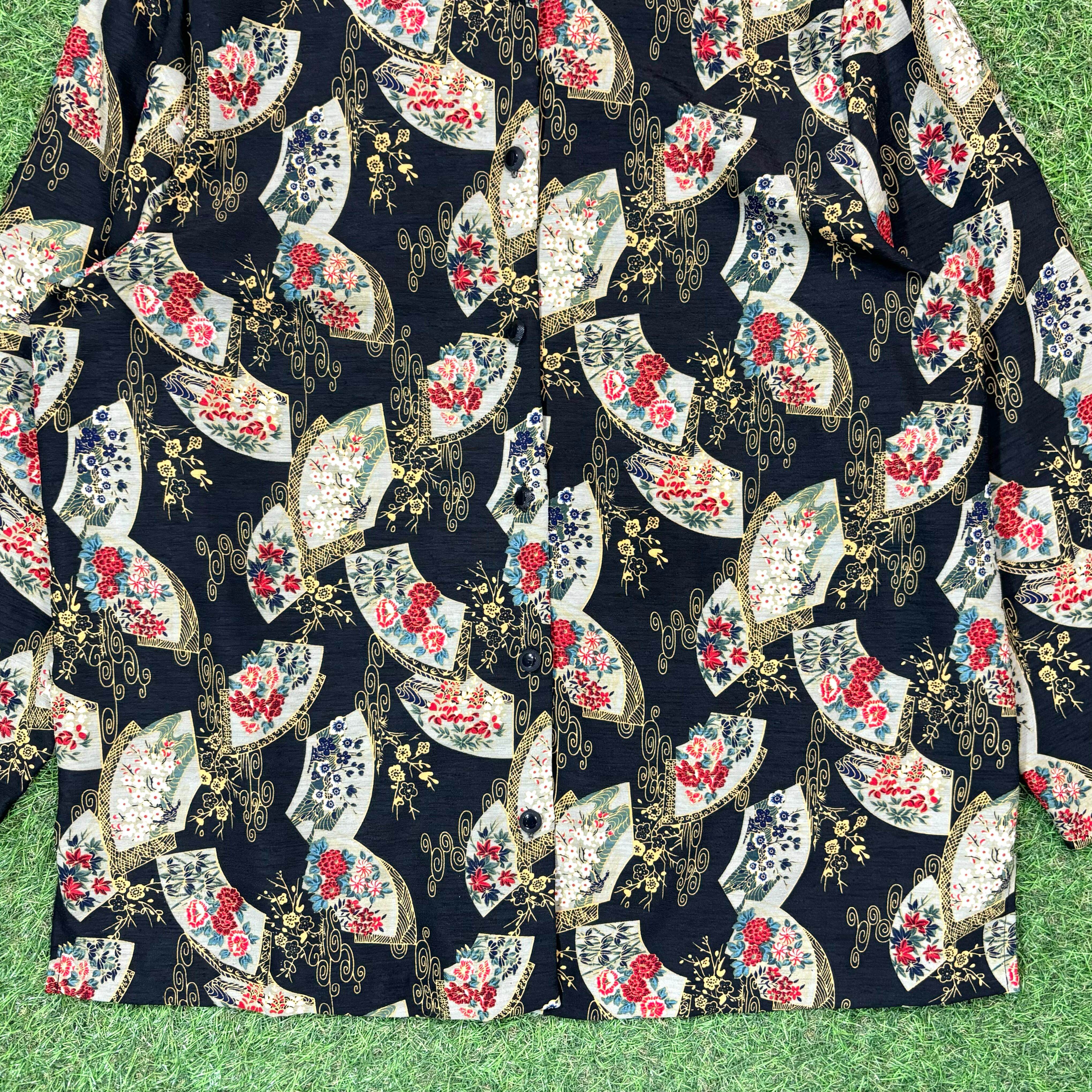 【Unisex】 90s 和柄 スタンドカラー 長袖 シャツ / Made In Mexico 90年代 古着 和風 黒 ブラック 総柄 柄シャツ ノーカラー スタンドカラー 襟なし