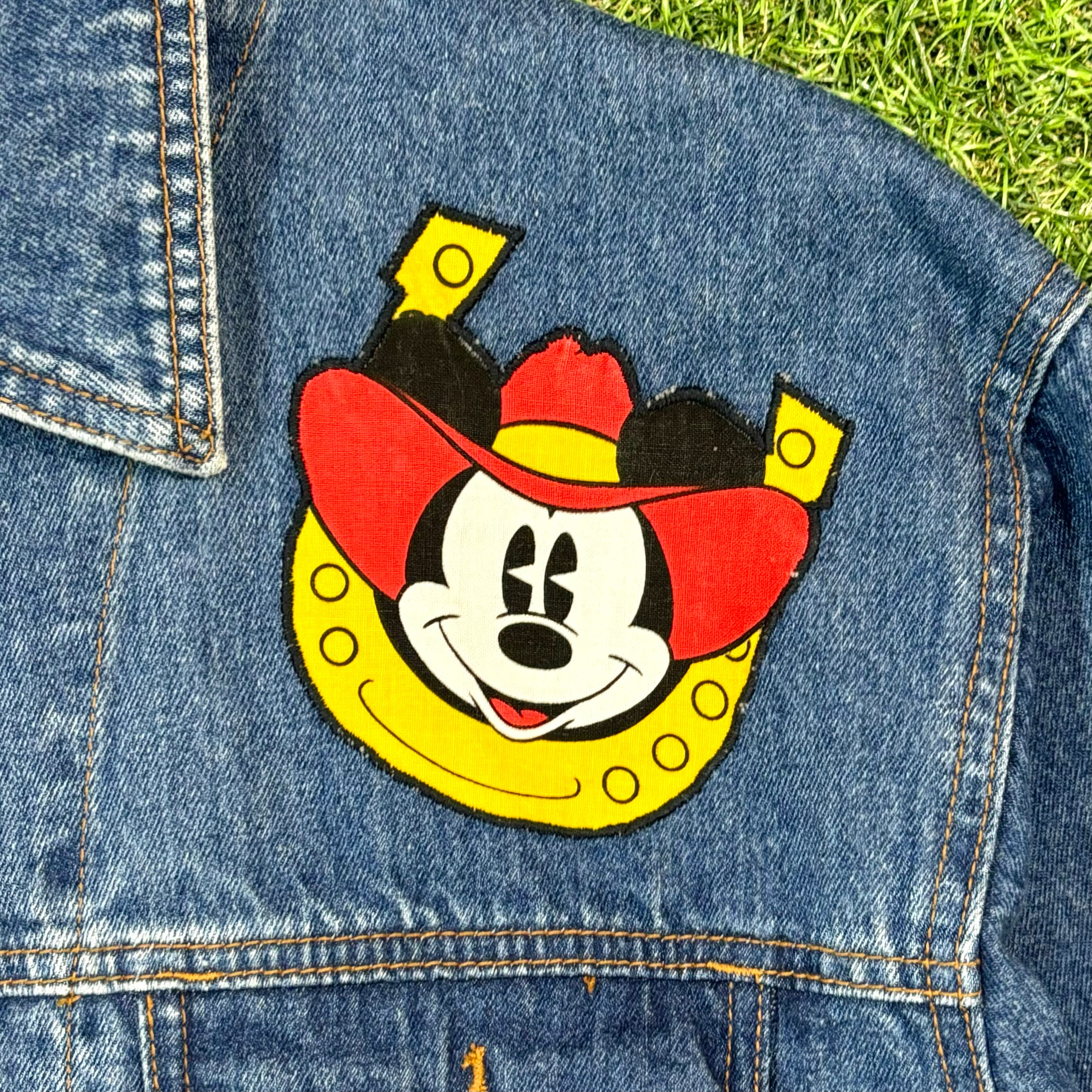 背中には、何とカウボーイに扮したミッキーがプリントされた布がドカンと縫い付けられています。ミッキーの持っているロープは刺繍になっていて更に星型のスタッズまで◎