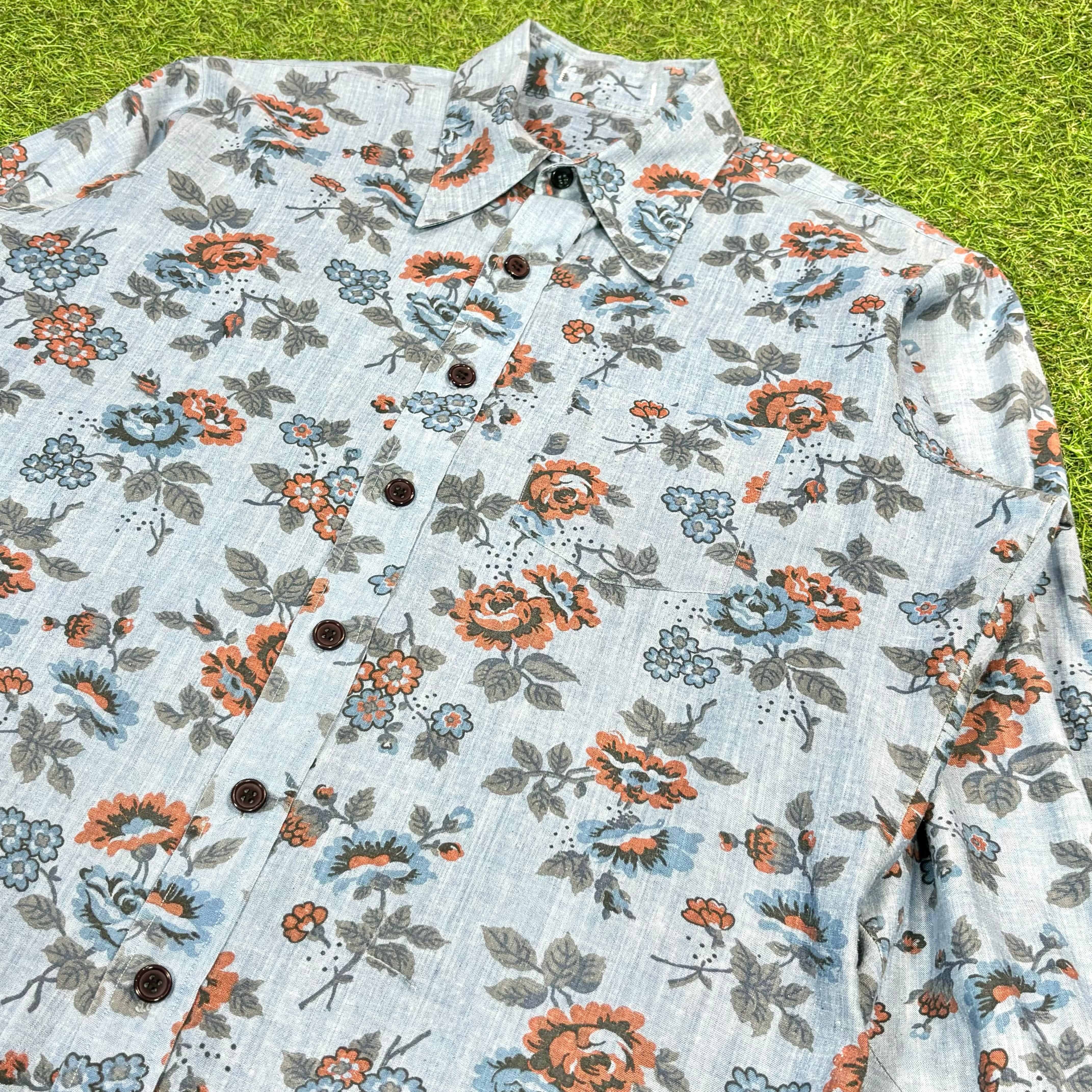 【Men's】 70s 薔薇 総柄 イラスト シャンブレーシャツ / 70年代 古着 シャツ シャンブレー 柄シャツ 長袖