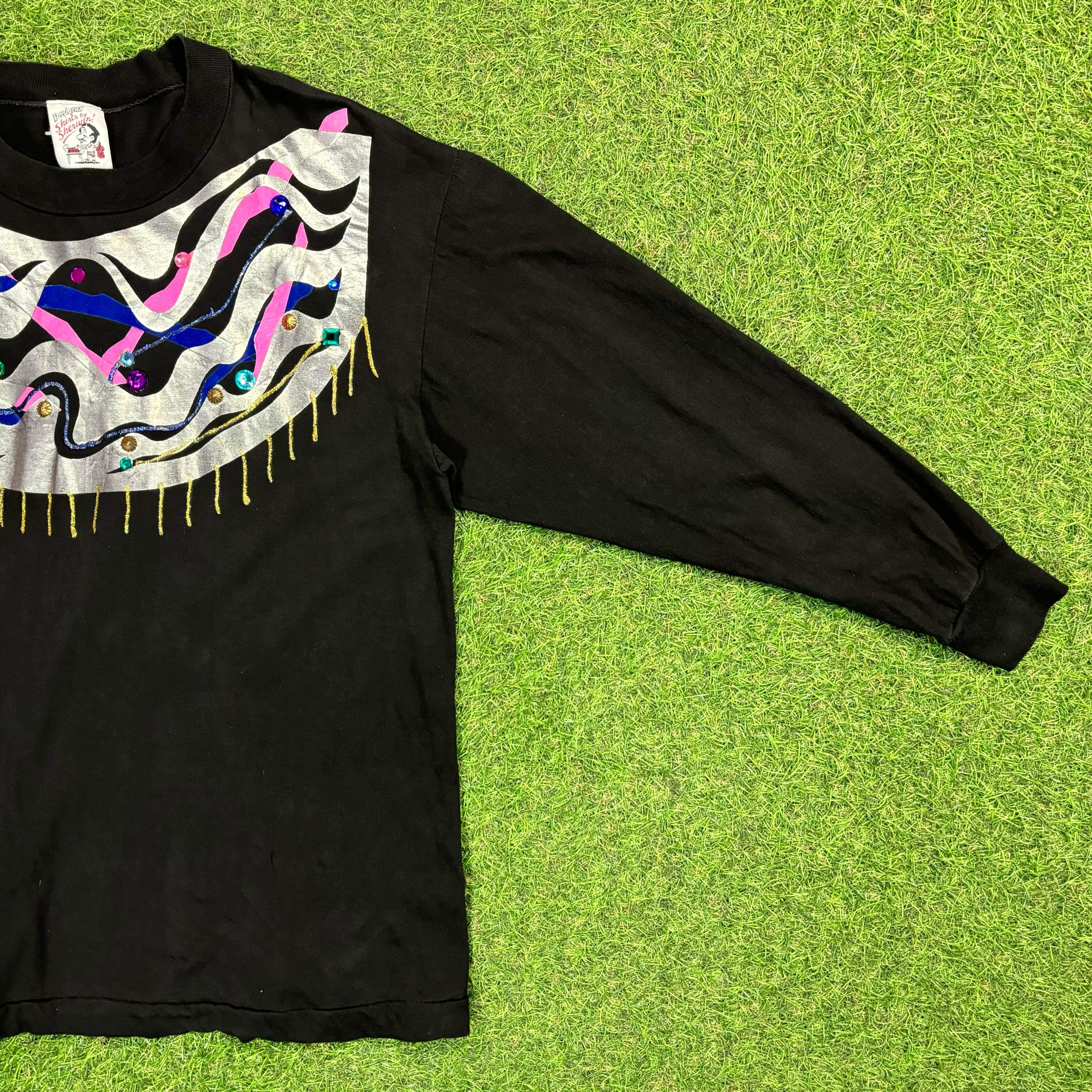 【Unisex】 80s - 90s ネイティブ モチーフ シャイニー プリント 長袖 Tシャツ / Made In USA ティーシャツ T-Shirt ロンティー ロンT 80年代 90年代 アメリカ製 黒 ブラック