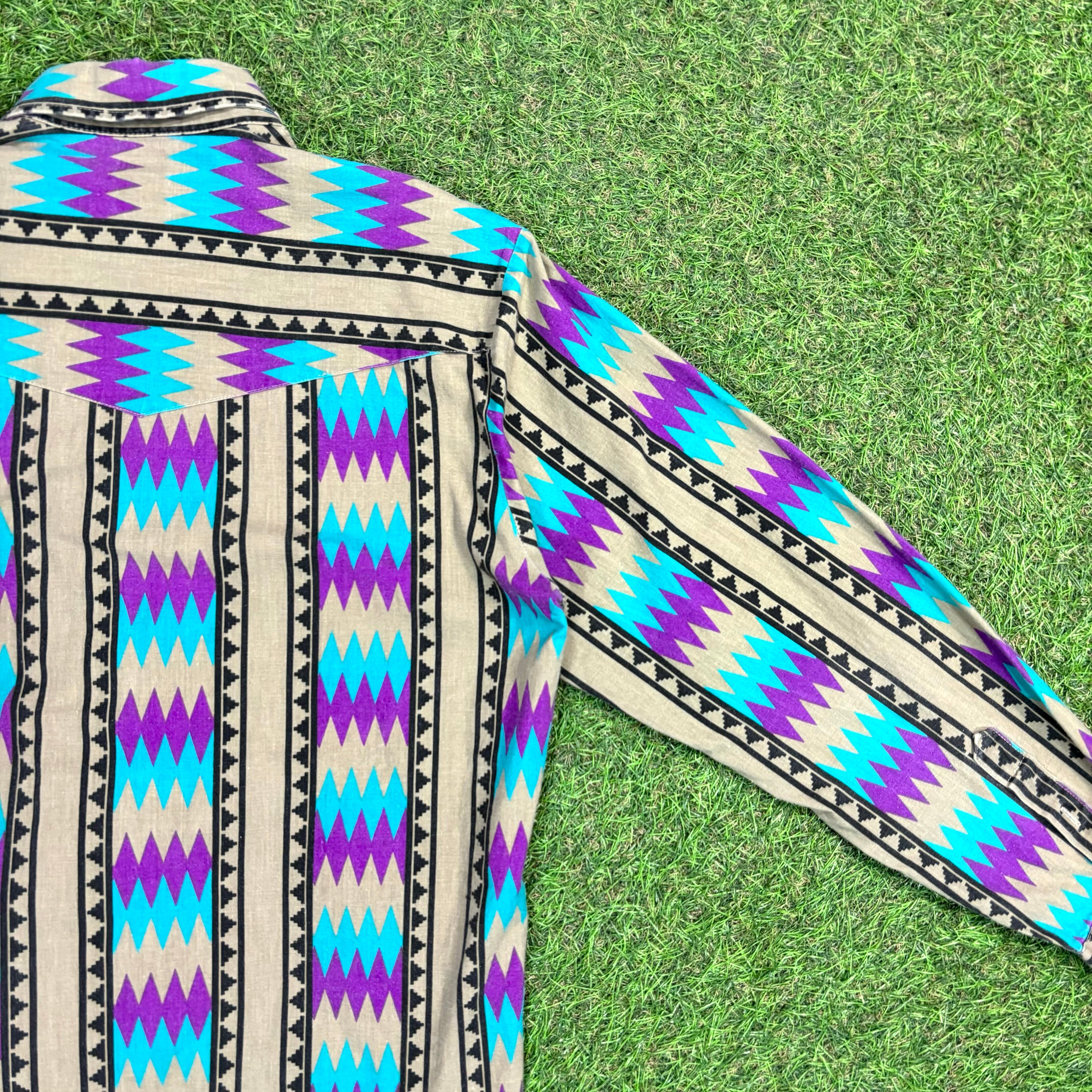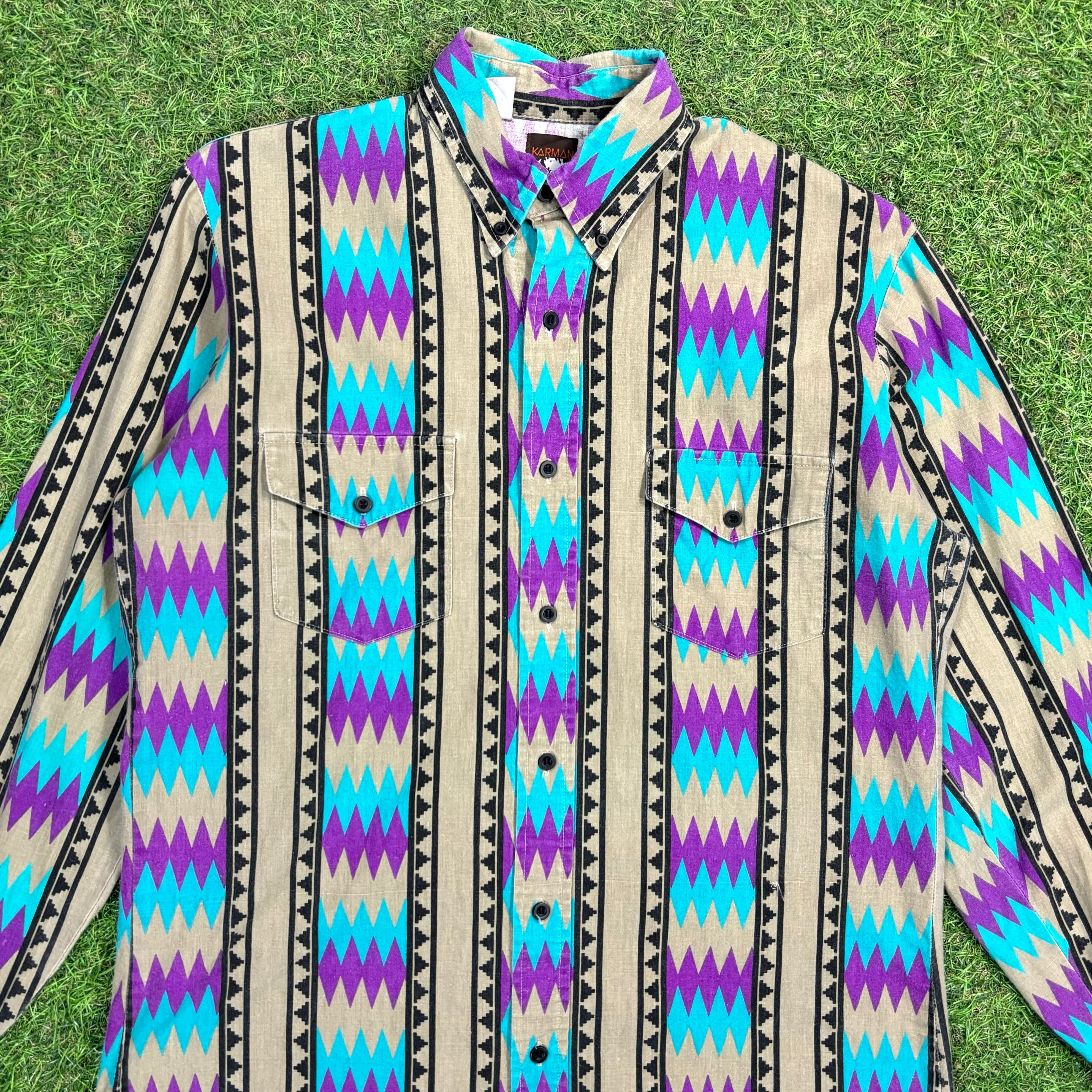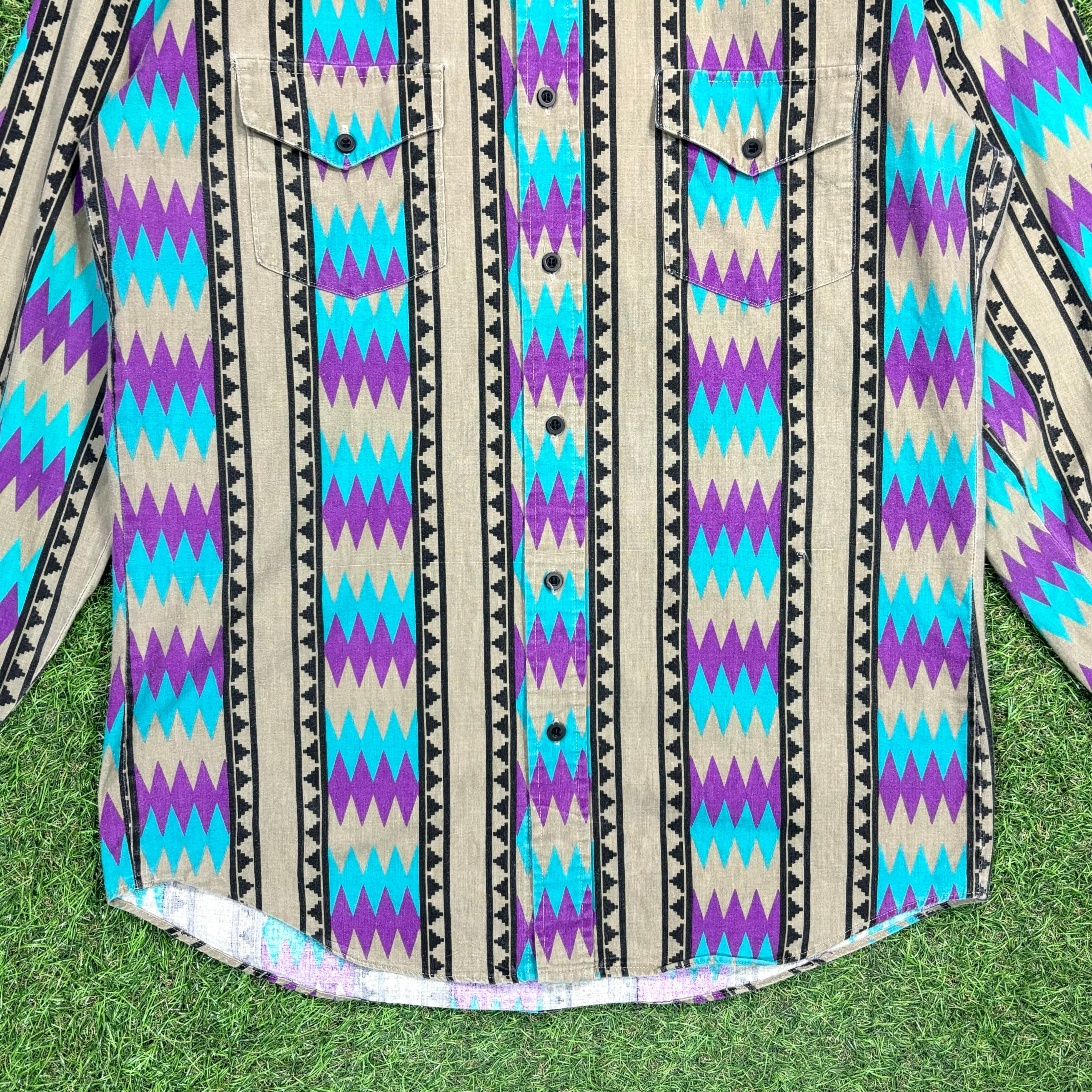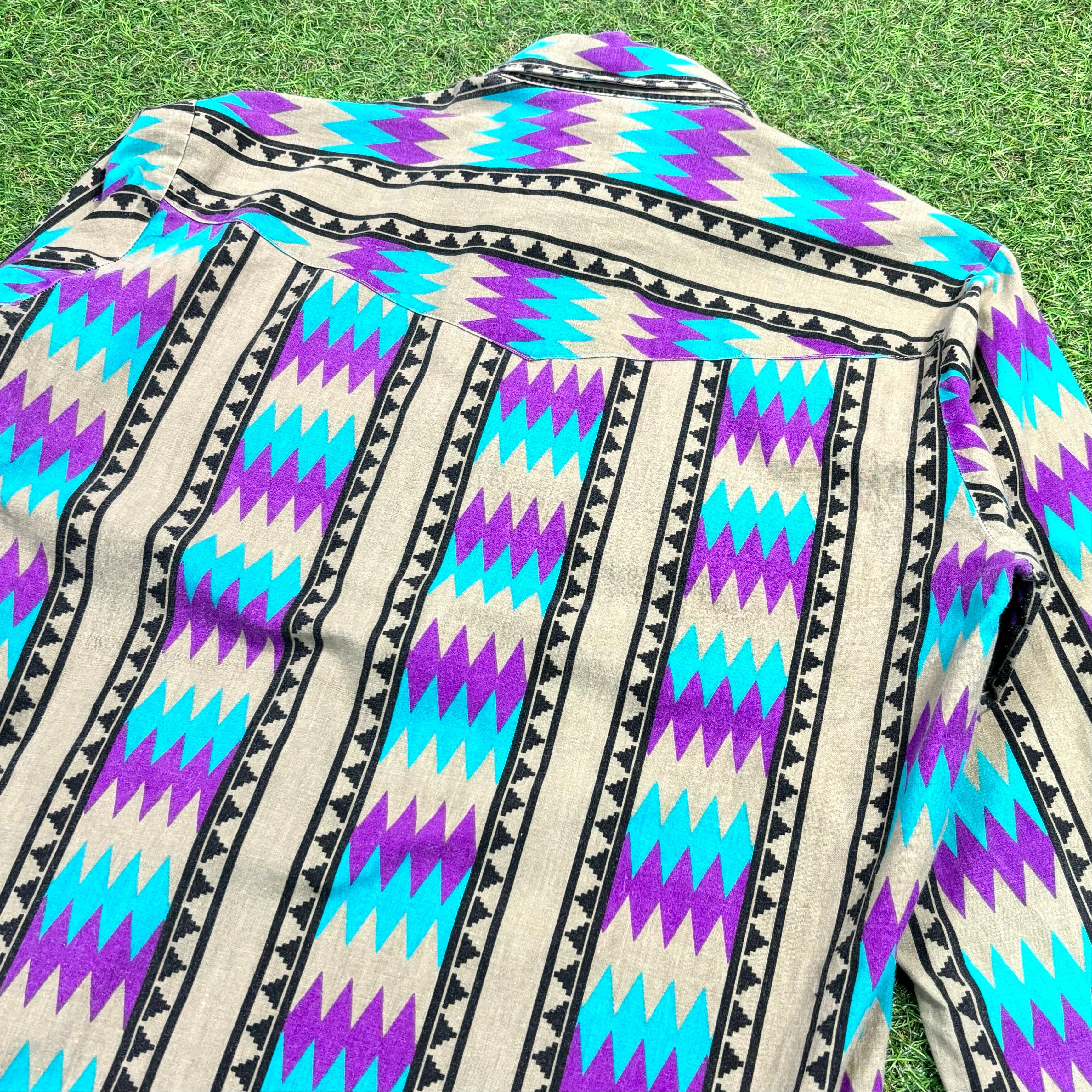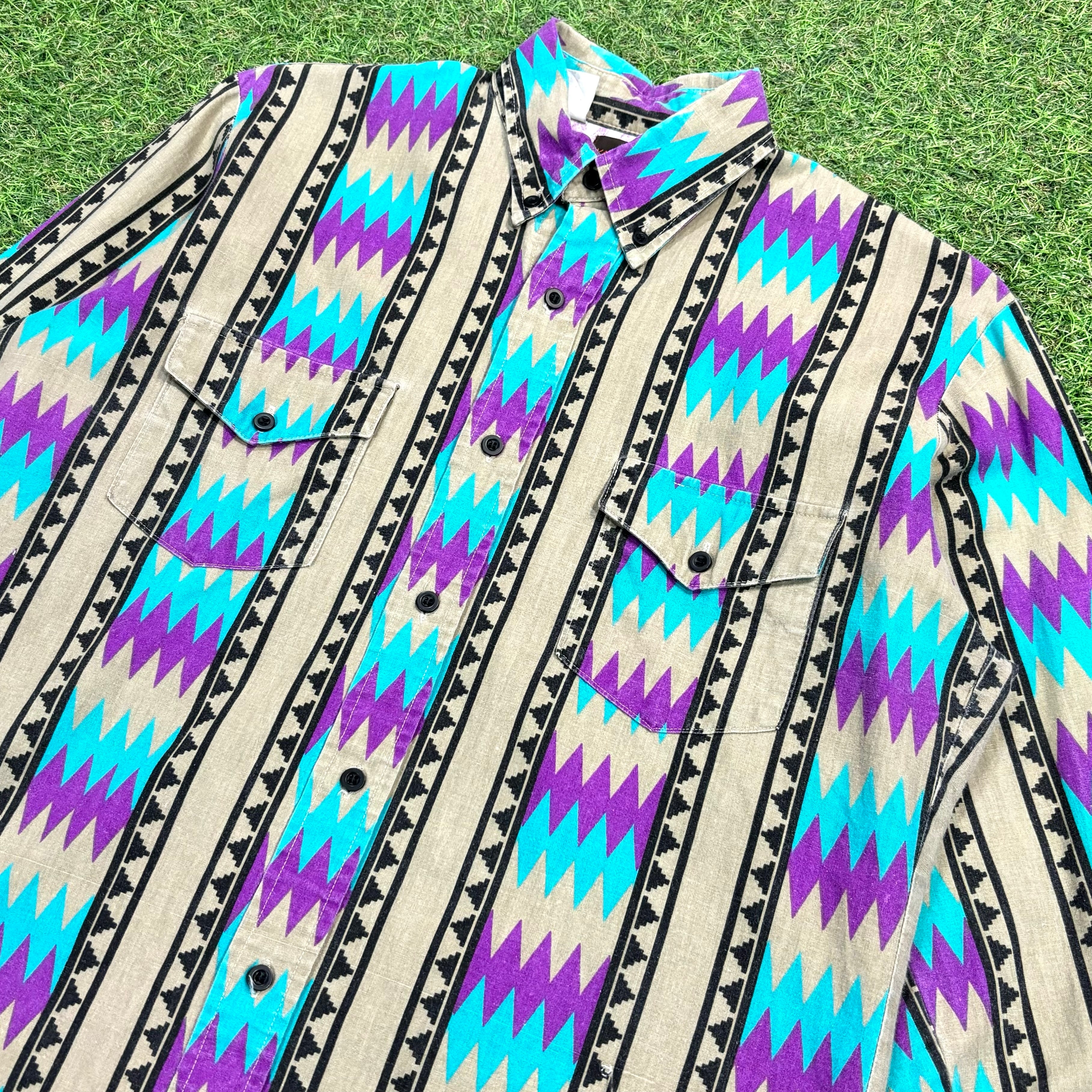 【Men's】 90s ネイティブ ストライプ 長袖 シャツ / 90年代 古着 総柄 柄シャツ ウエスタン