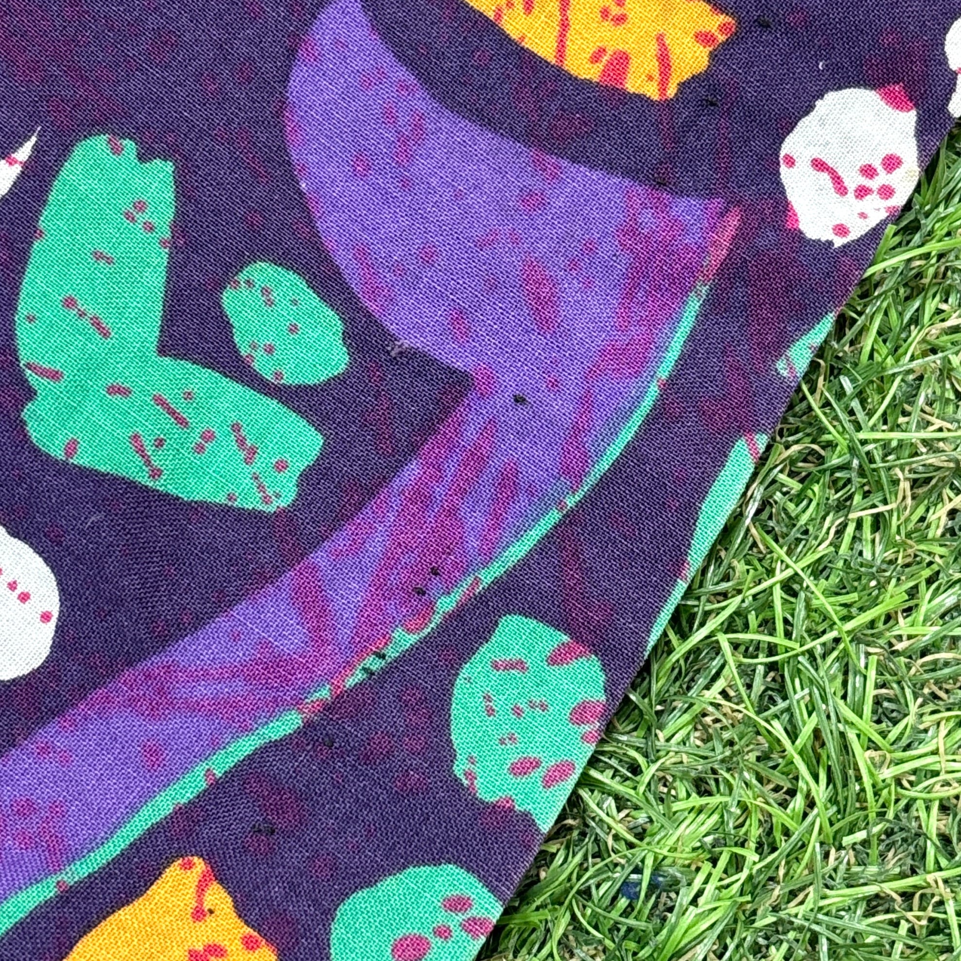 パープルベースに大胆なネイティブ柄が広がる、存在感たっぷりの一枚。丸みのあるラウンドカットの裾が、程よい抜け感を演出してくれます。開襟デザインで首元もすっきり。