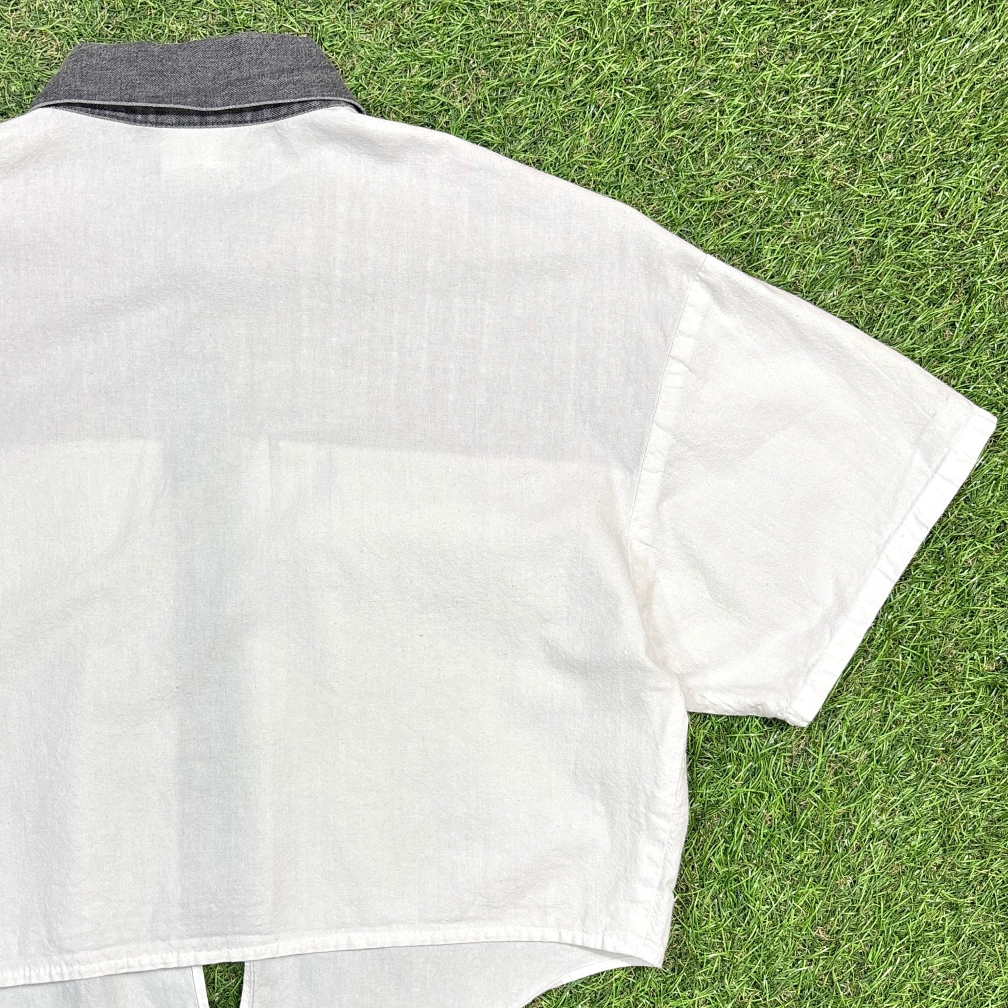 裾が縛れるタイフロントのショート丈デザインが可愛らしい1枚。