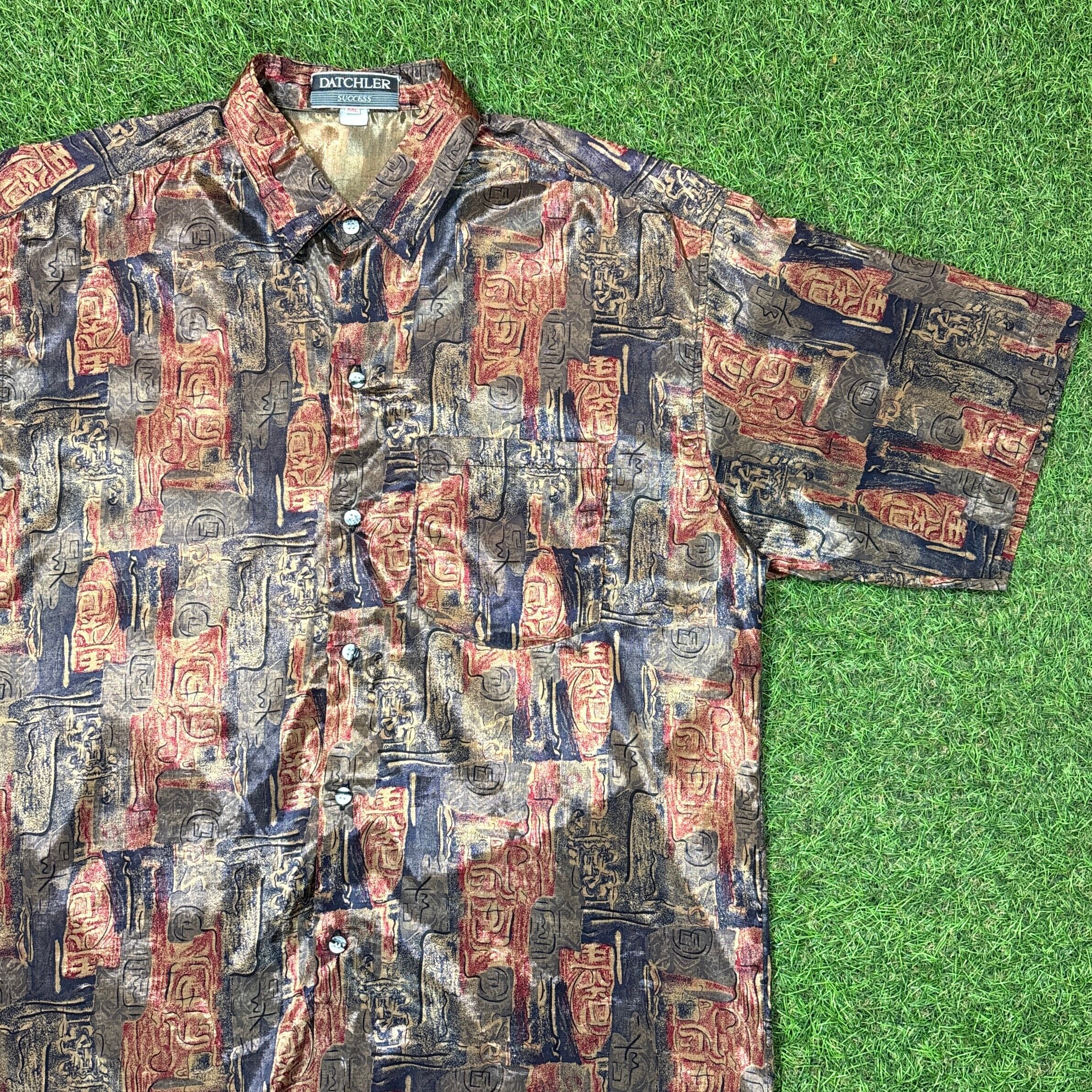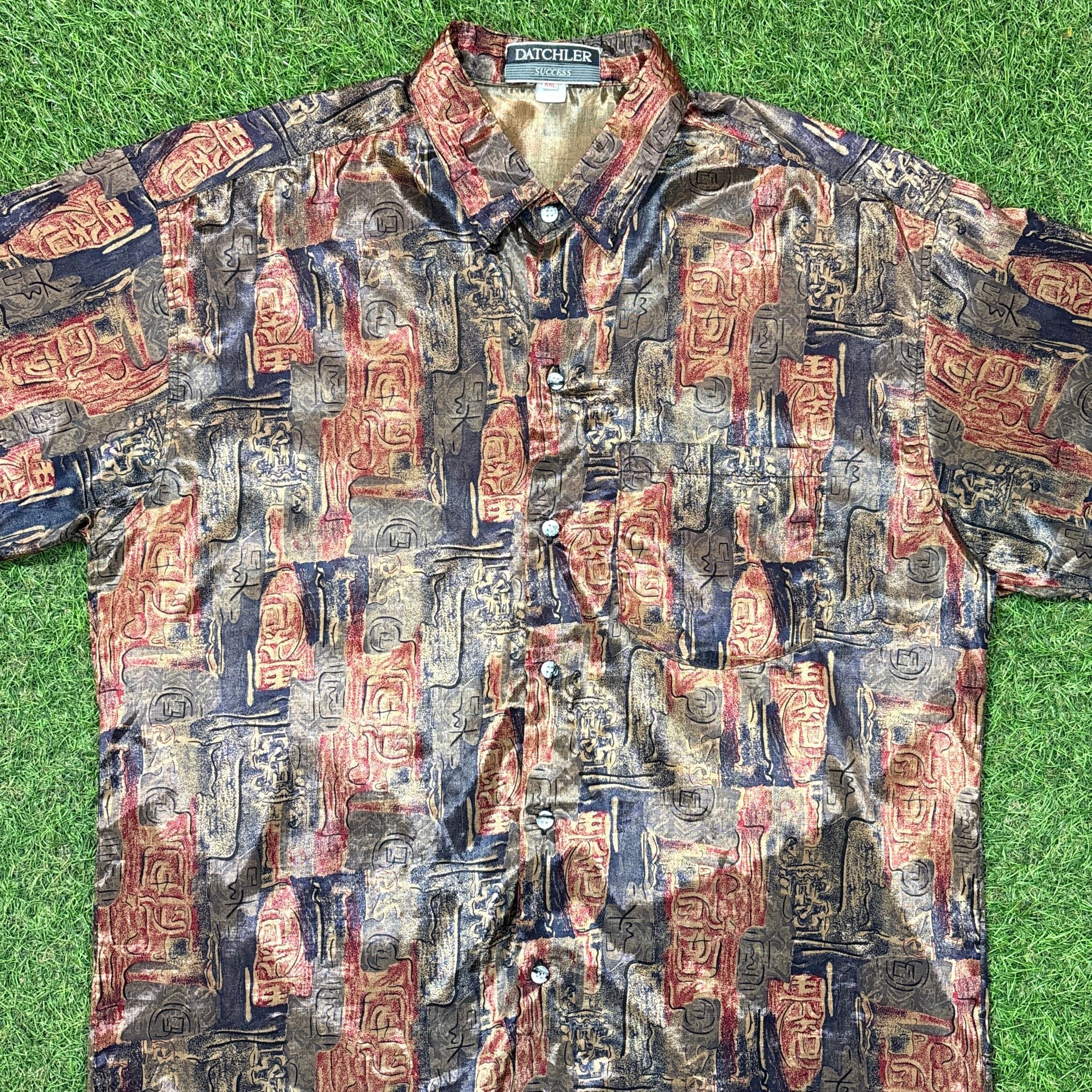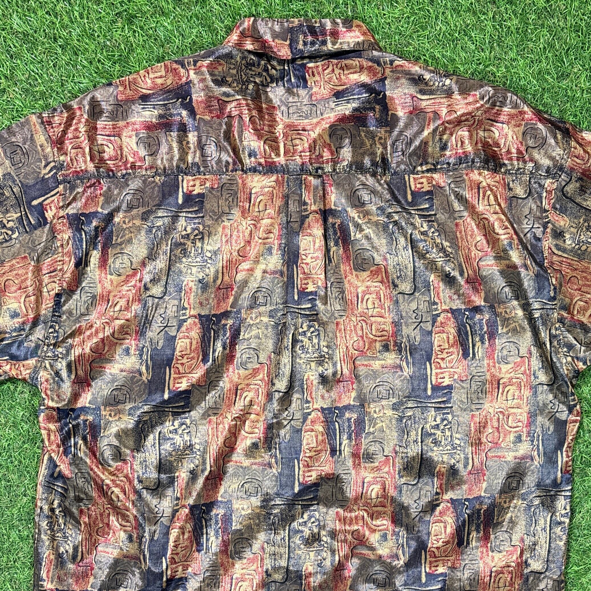 【Men's】 エスニック柄 シャイニー 総柄 半袖 シャツ / 古着 メンズ 夏 柄シャツ