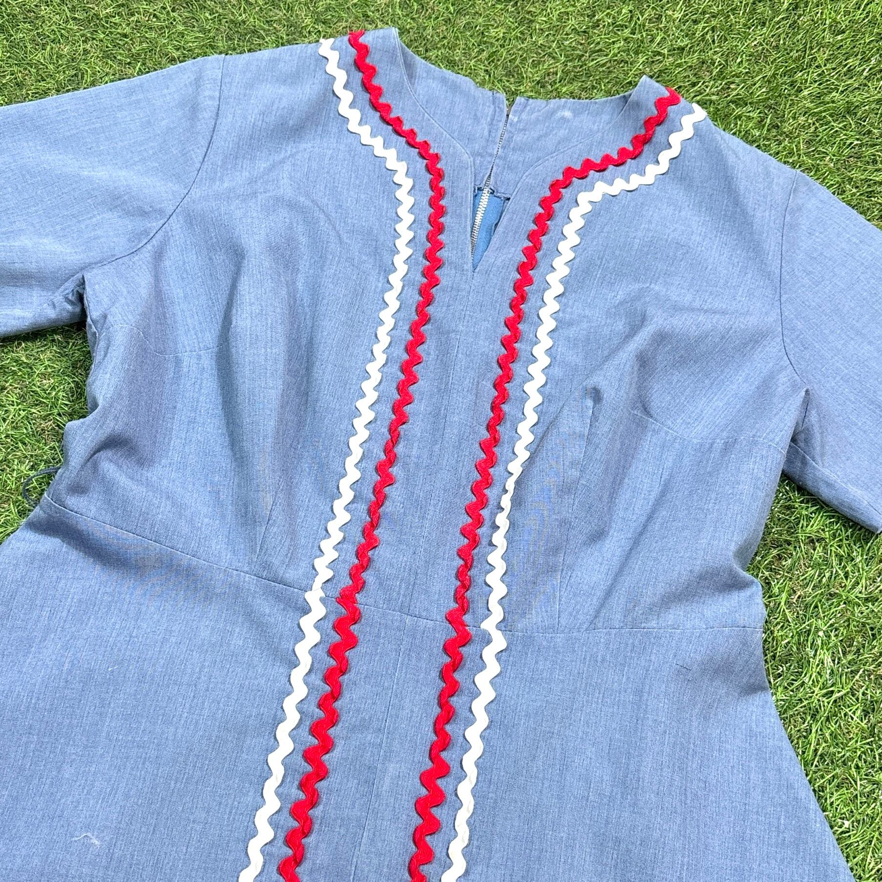 ライトブルーのボディに、赤と白のリックラックテープが映えるレトロなデザイン。