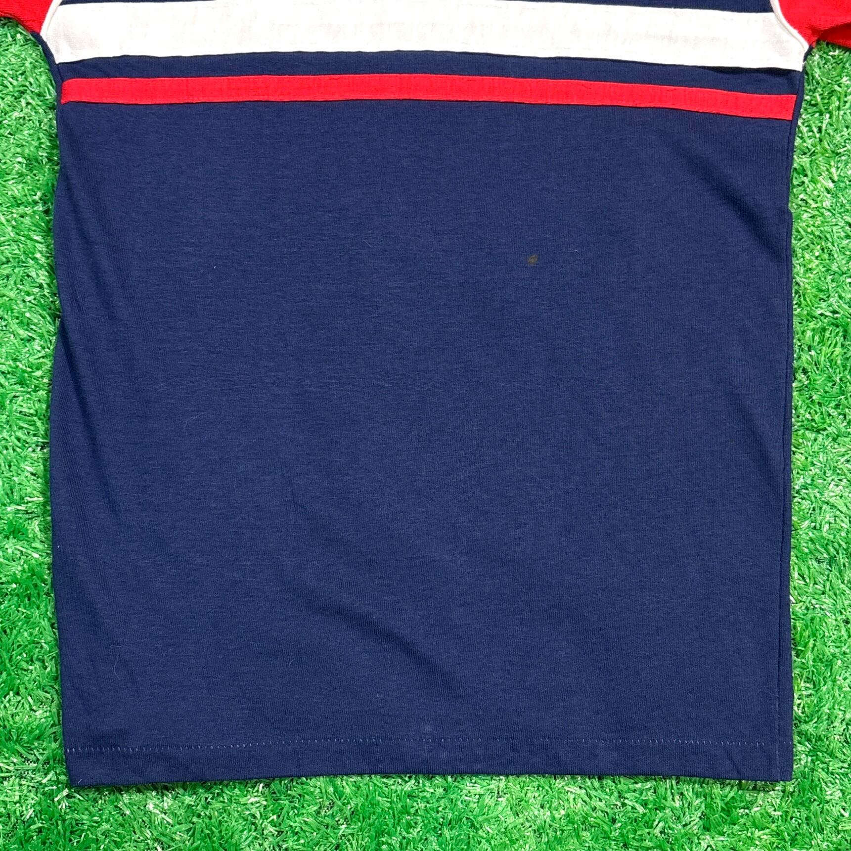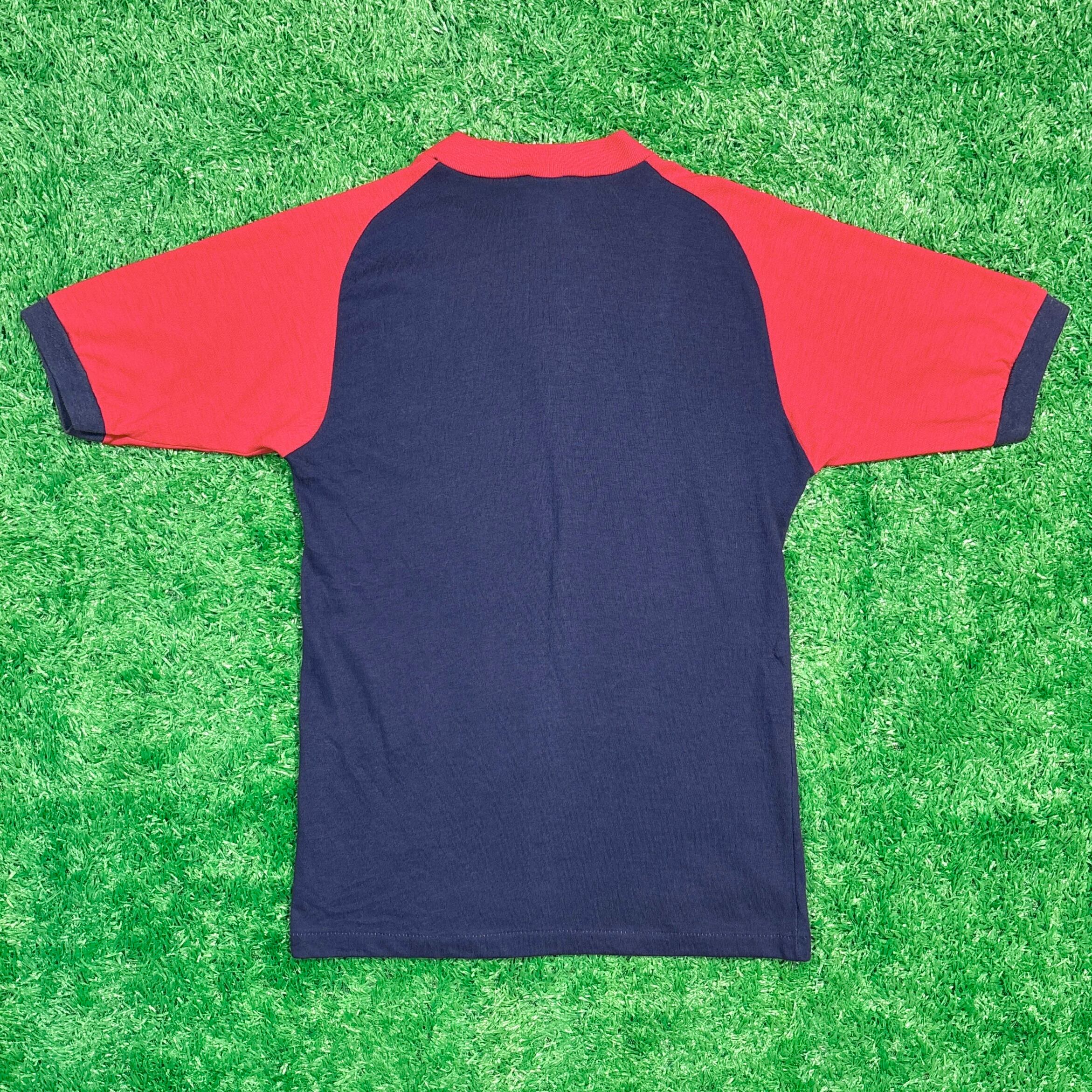ネイビーボディに赤×白の切り替えデザインが効いた、レトロな雰囲気の1枚。