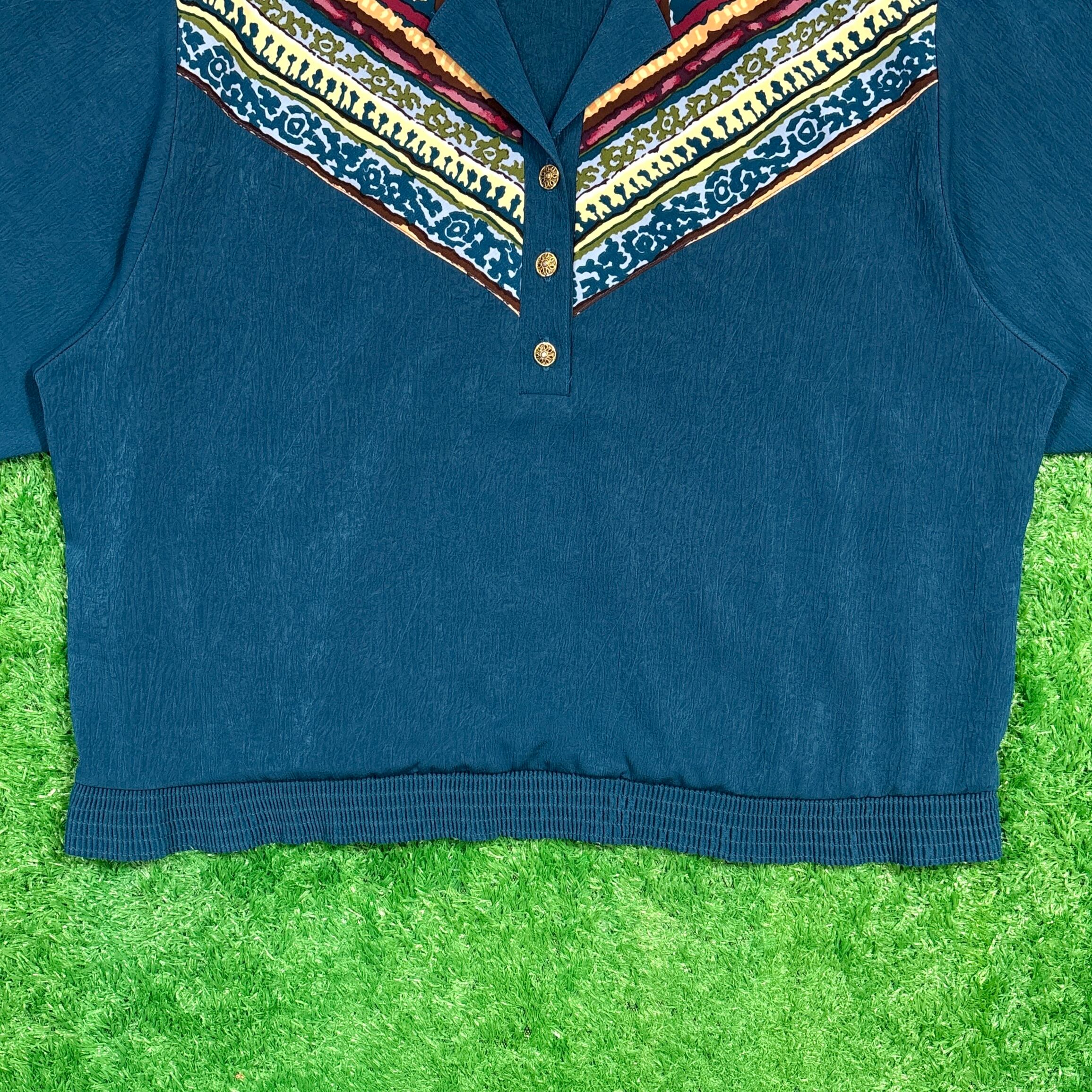 【Lady's】 80s エスニック柄 ポリエステル プルオーバーシャツ / アメリカ製 USA製 80年代 古着 レディース トップス グリーン 総柄 シャツ 044