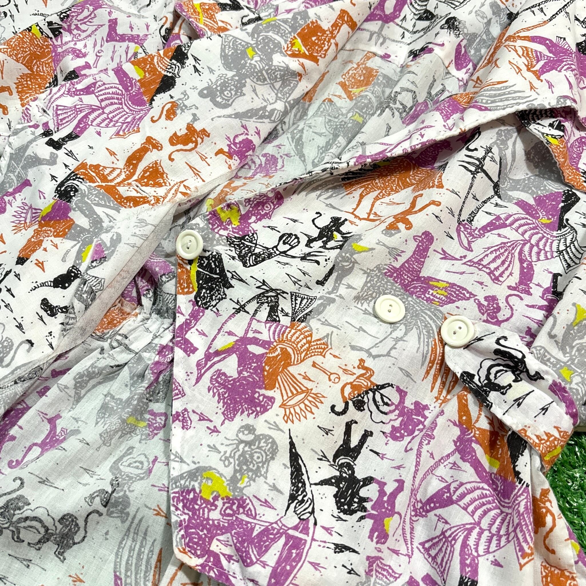 鮮やかな色使いと神話の世界を連想させる総柄が特徴で、夏にぴったりな一枚。