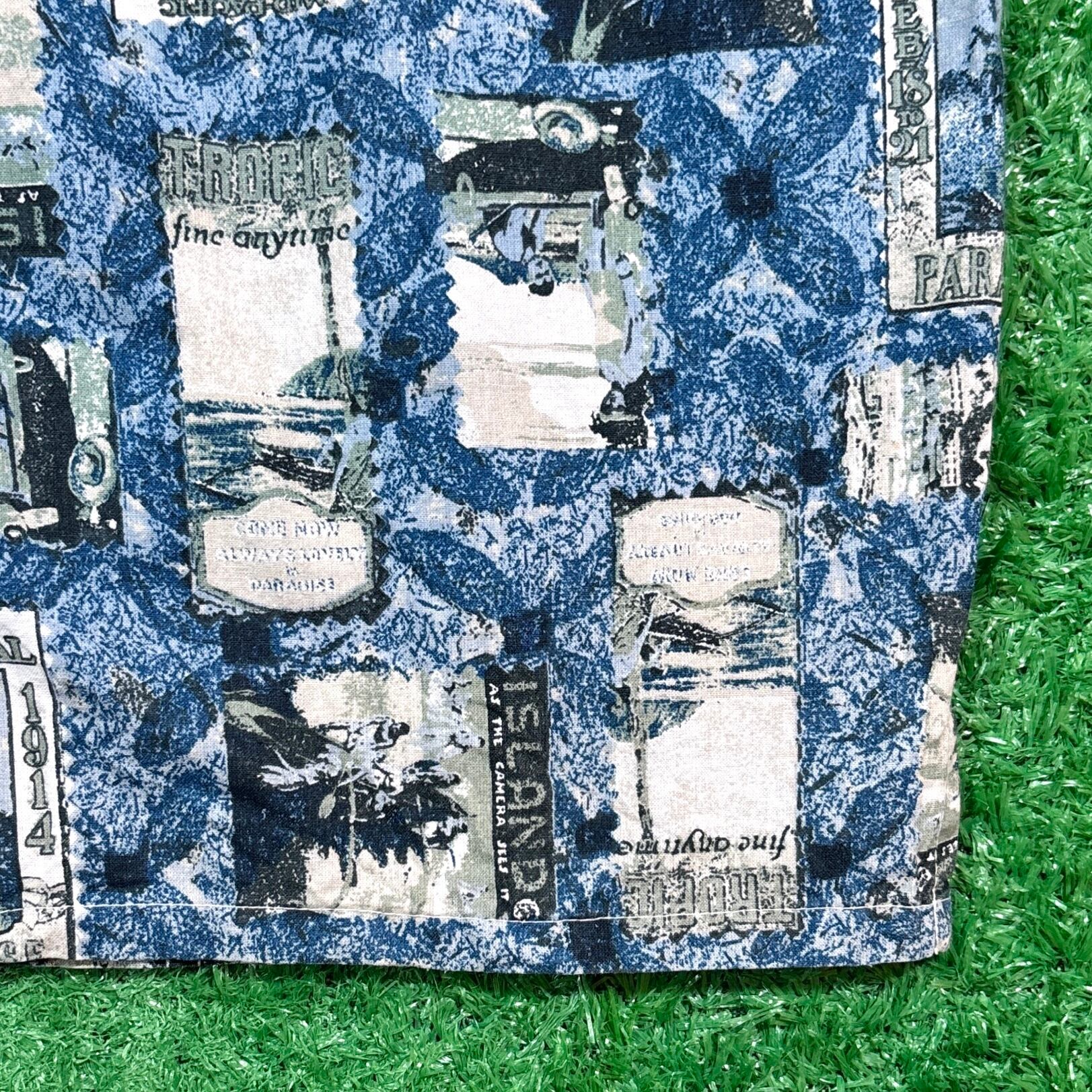 オールドハワイ風のサーフィンやビーチの風景が描かれたデザインが特徴的で、夏らしい爽やかな印象を与えるアイテムです。軽やかな素材感と開襟シャツのデザインが、リラックスした雰囲気を作り出します。