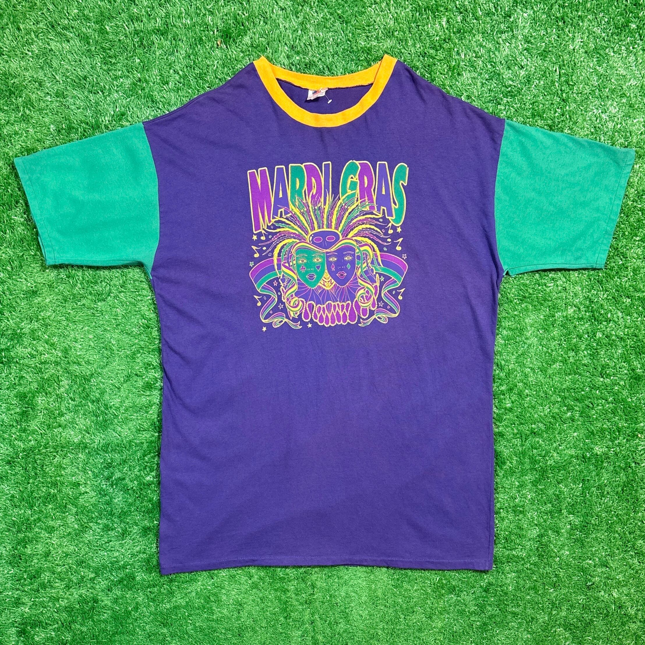 アメリカ・ルイジアナ州ニューオーリンズのカーニバルイベント「MARDI GRAS」をテーマにしたアイテム。色鮮やかな紫、緑、黄色の切り返しデザインが特徴で、イベントの賑やかで楽しい雰囲気を伝えています。
