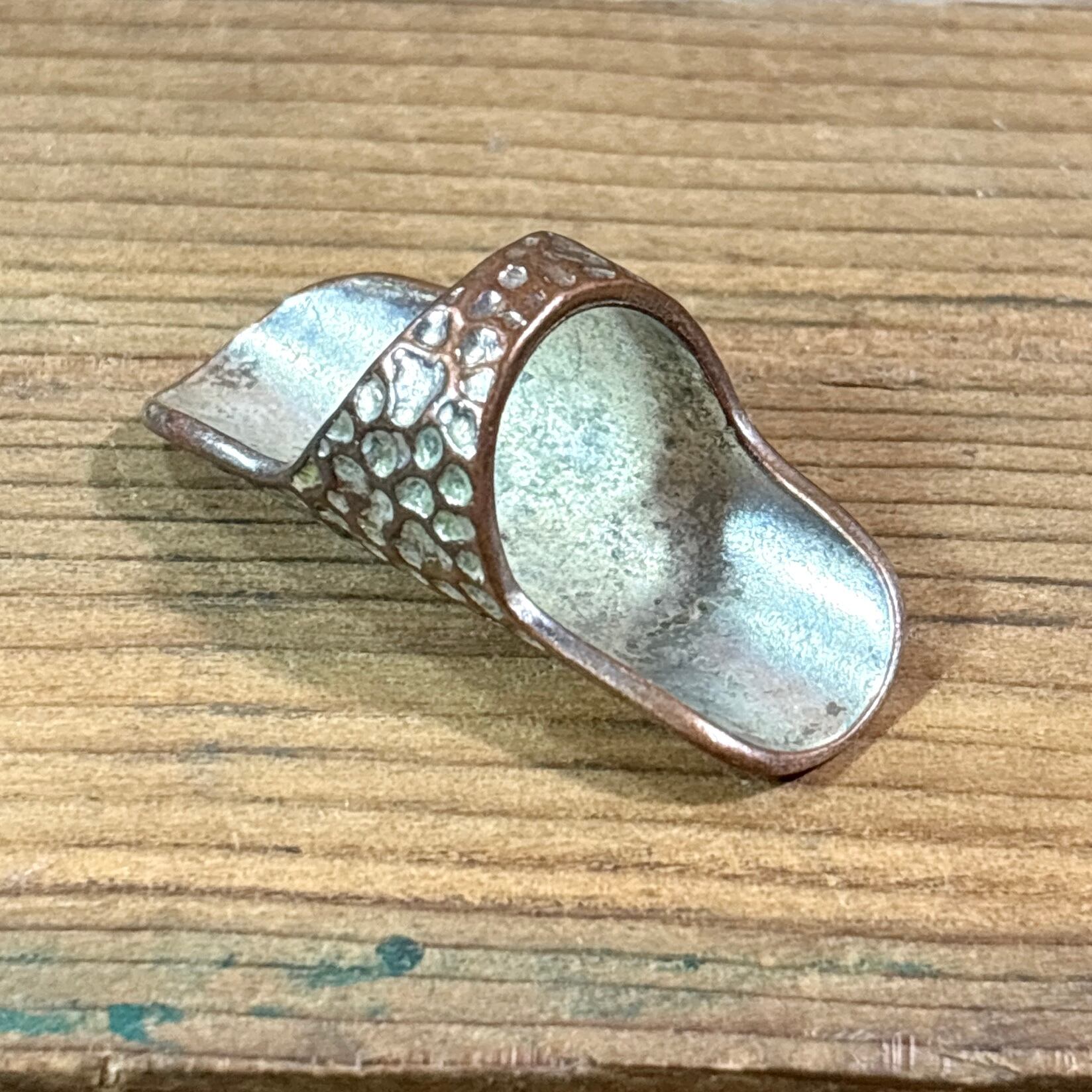 立体的なパターンが表面に彫り込まれており、メタリックな質感と合わせてインパクトのあるデザインが特徴。指に沿ったカーブで、指全体を包み込むようなフォルムが印象的です。