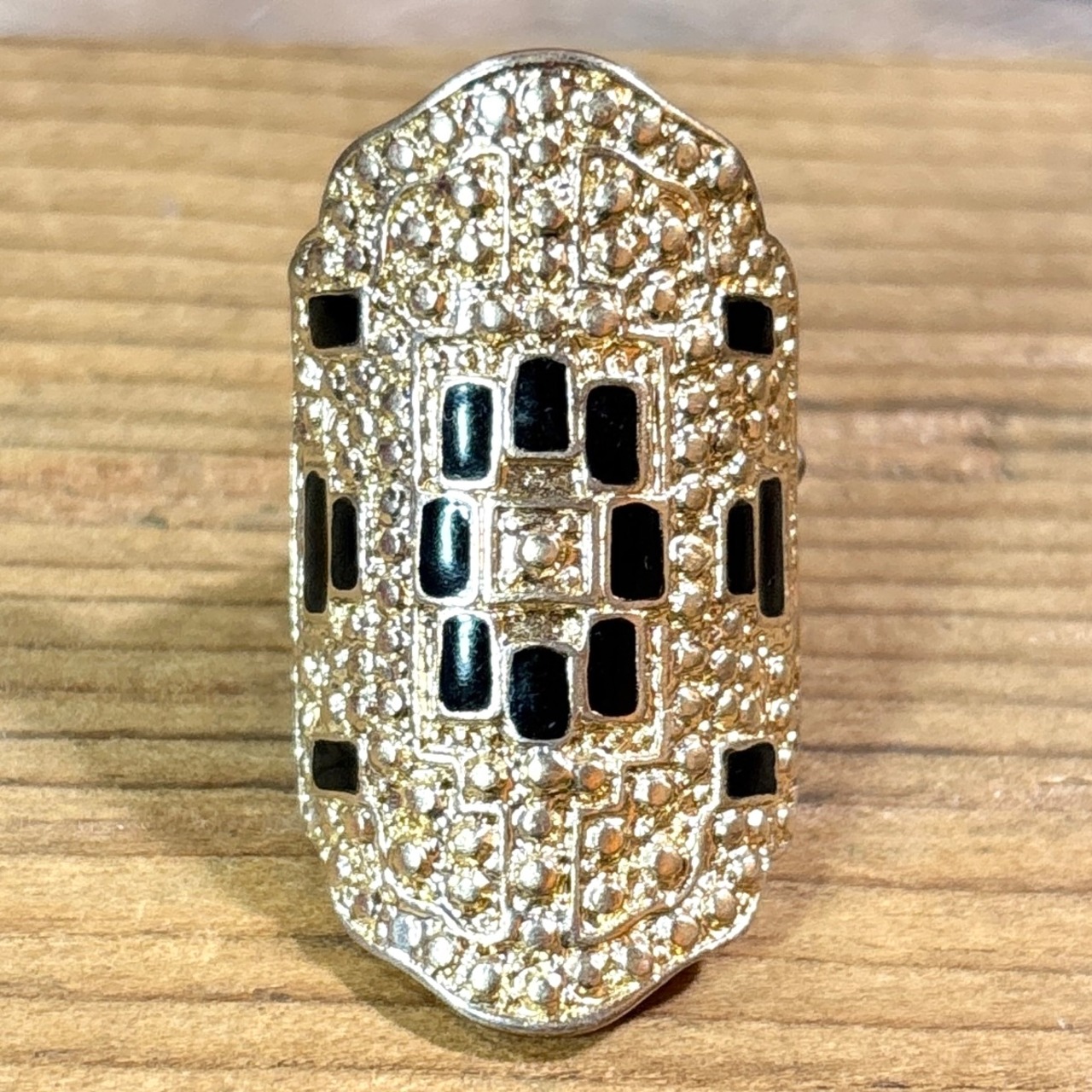 存在感のある大ぶりのモチーフに、ブラックのラインストーンを組み合わせたアール・デコ風のデザインが印象的。リング部分はゴム仕様になっており、幅広いサイズにフィットします。