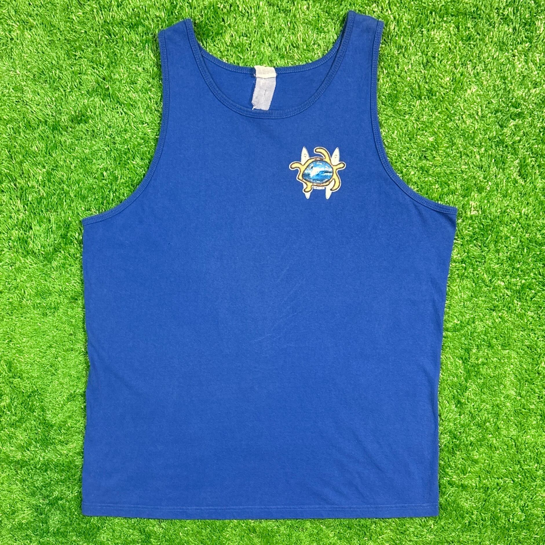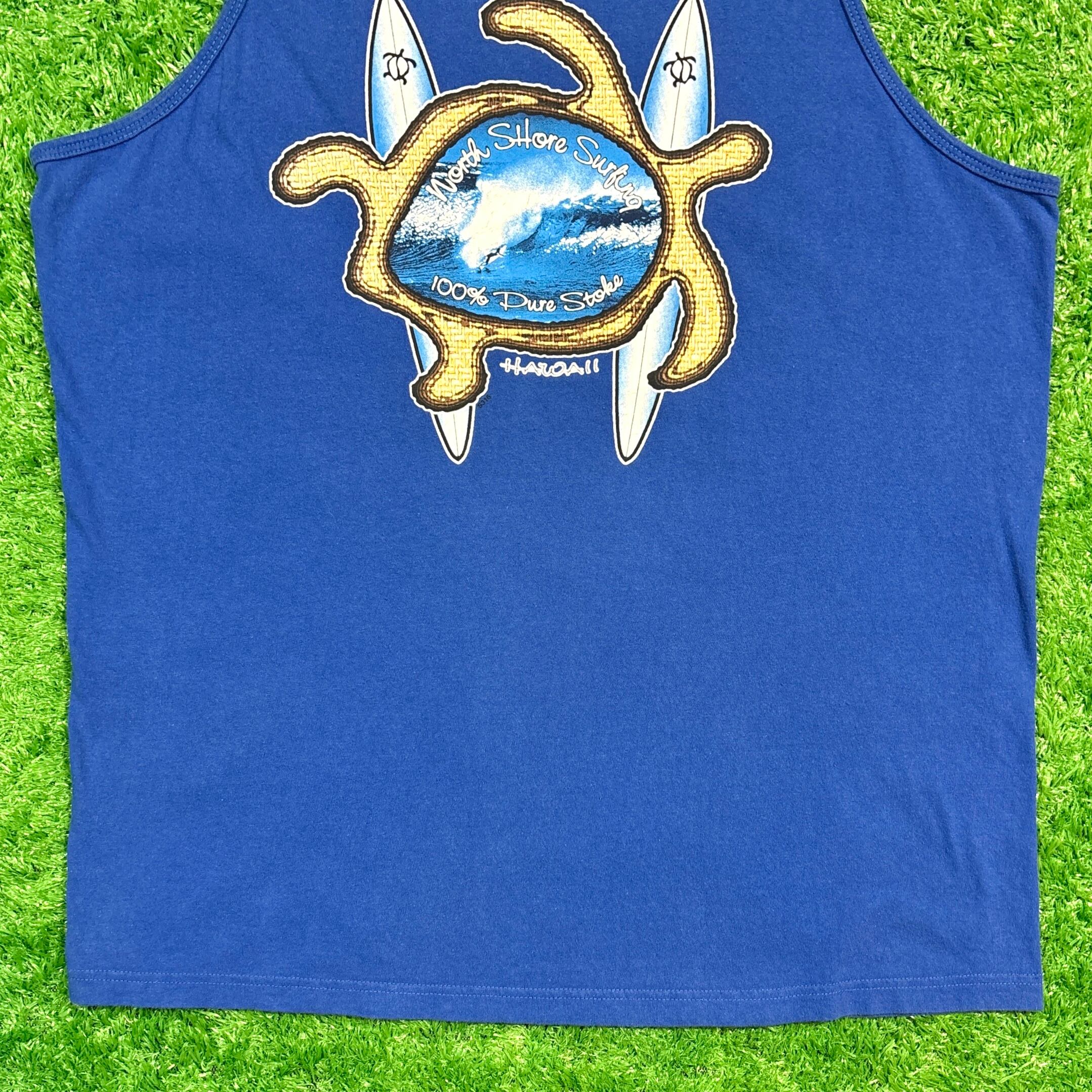 フロントにはシンプルなロゴ、バックには大きなホヌ(ウミガメ)とサーフボードのデザインがプリントされています。ハレイワは、オアフ島北部に位置し、美しいビーチとサーフィンで有名な観光地です。このタンクトップはそのビーチカルチャーを象徴しています。
