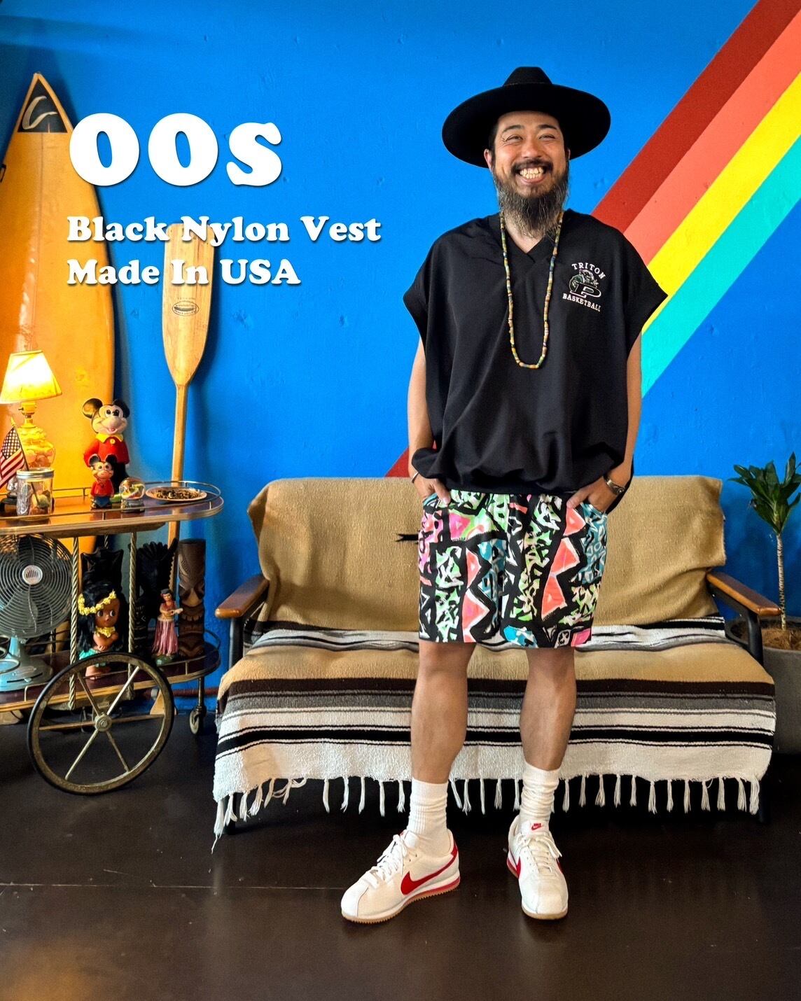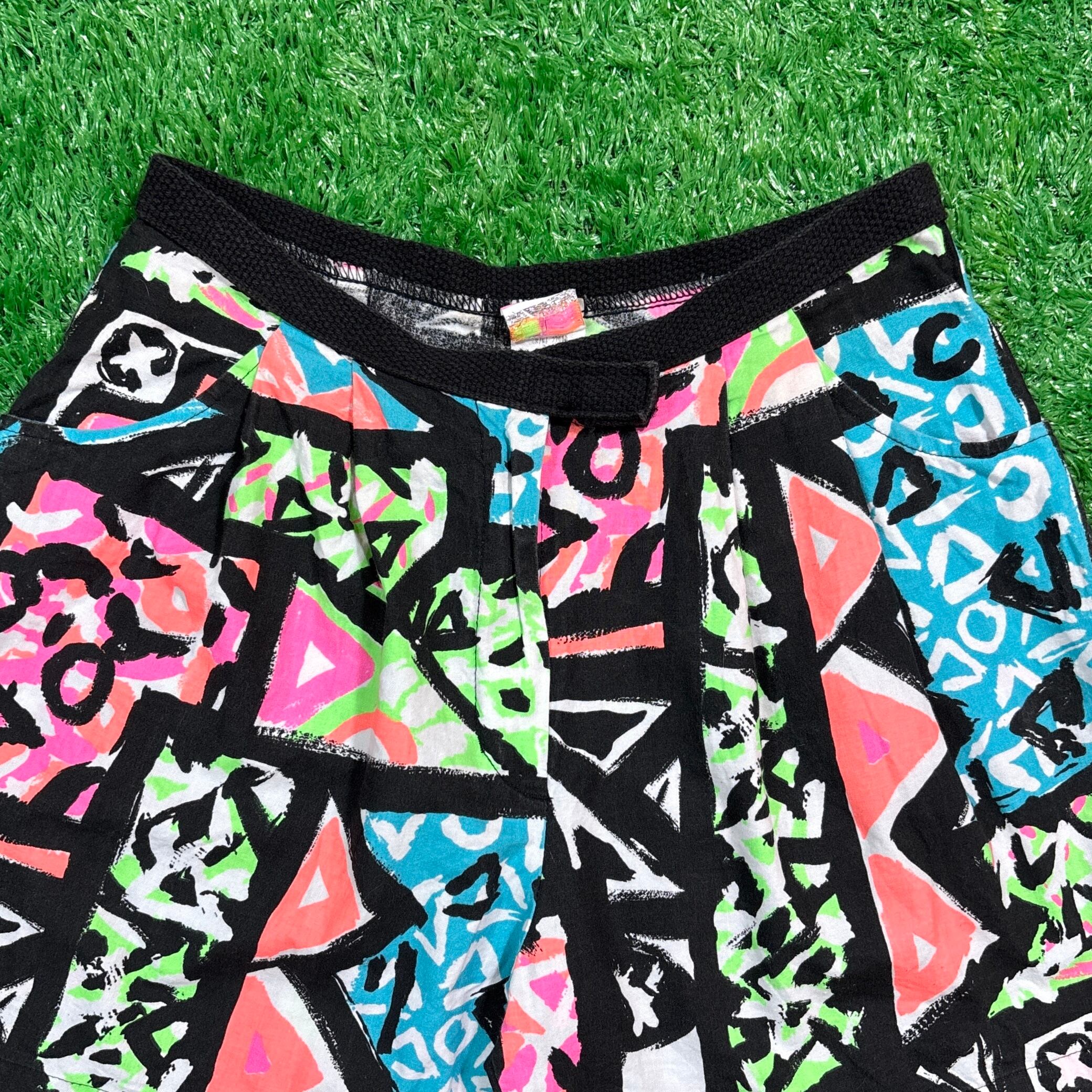 カラフルでポップな幾何学模様が全面にプリントされ、視線を引きつけるインパクトのあるデザイン。ブラックベースにネオンカラーが映え、80sのヴィンテージ感とストリートスタイルを同時に楽しめます。