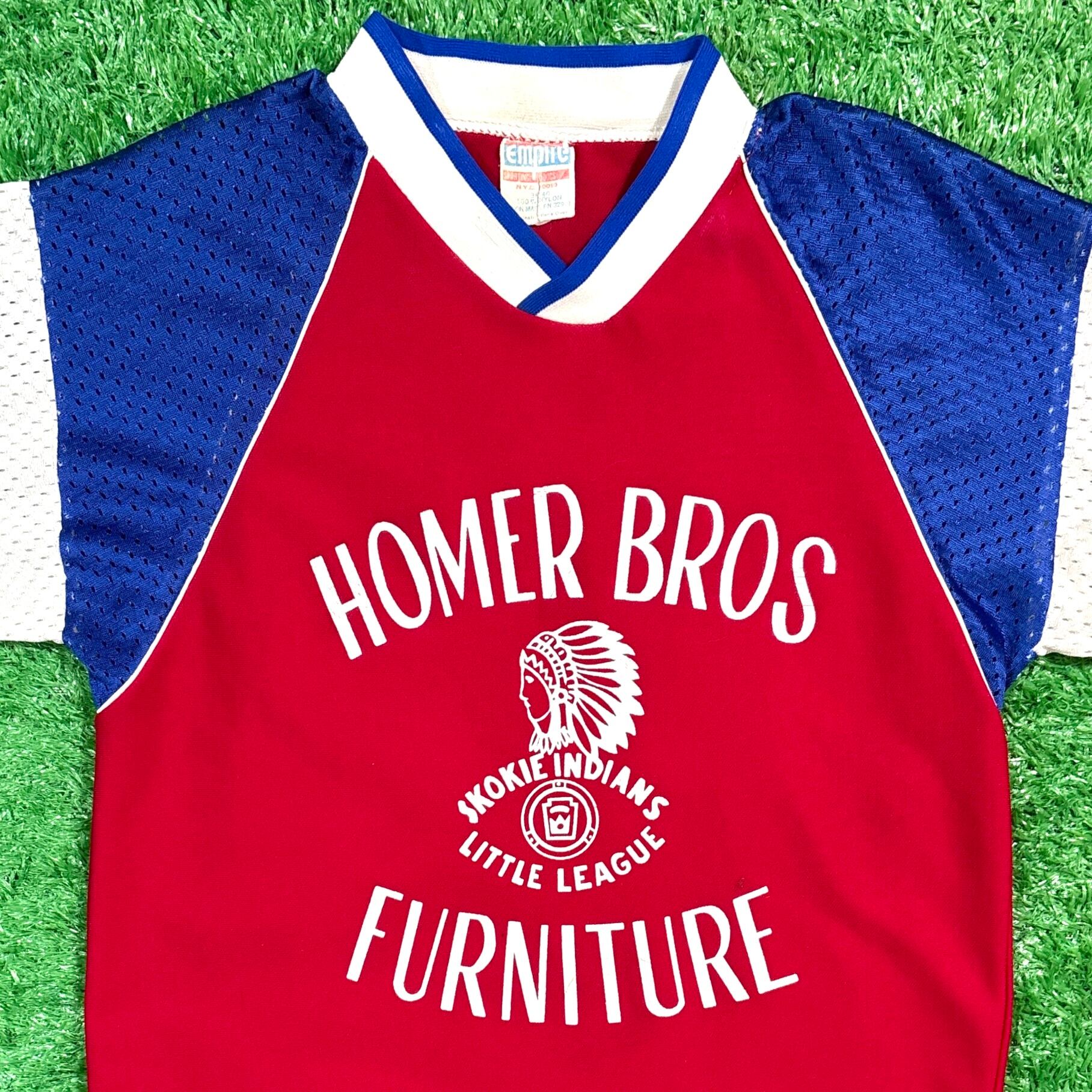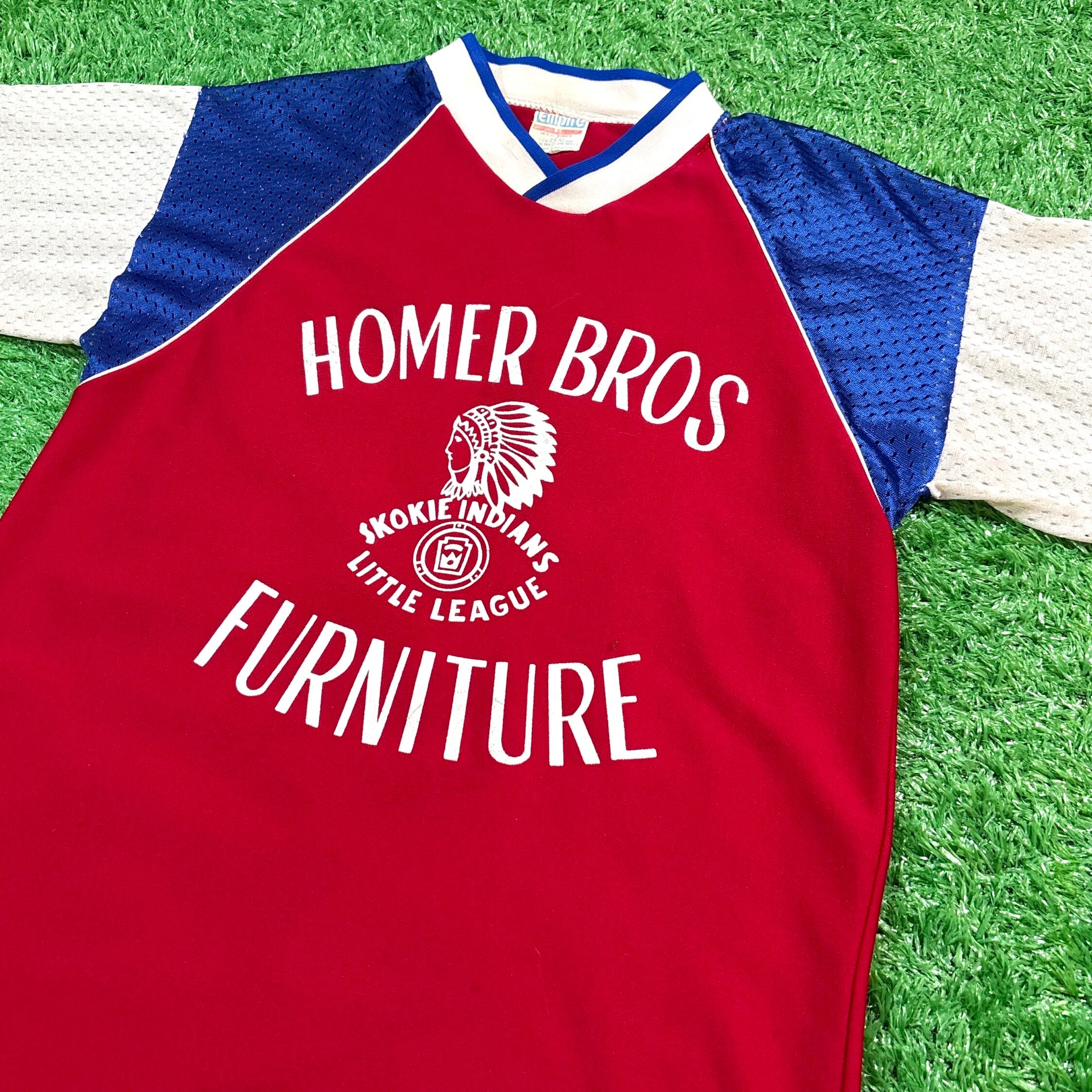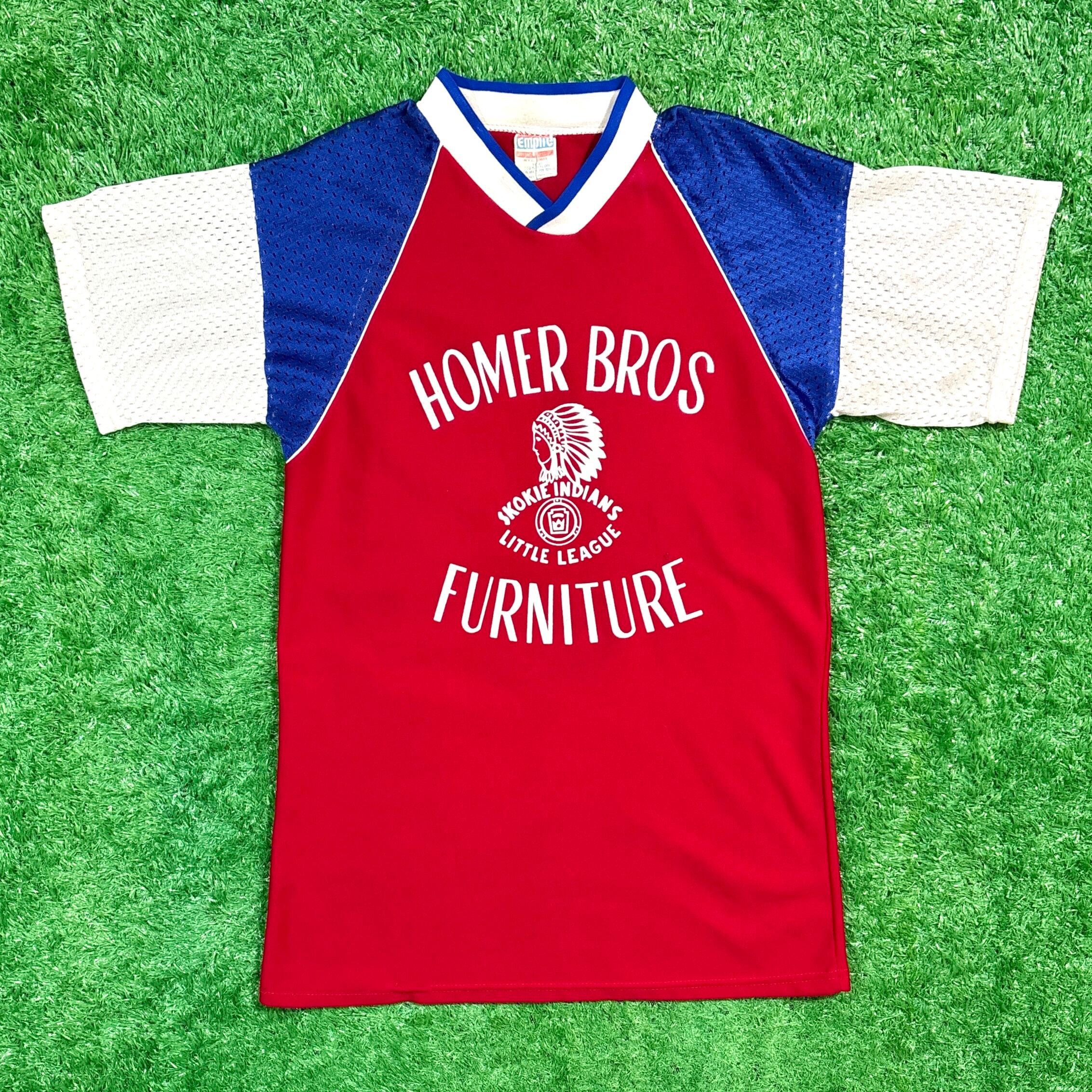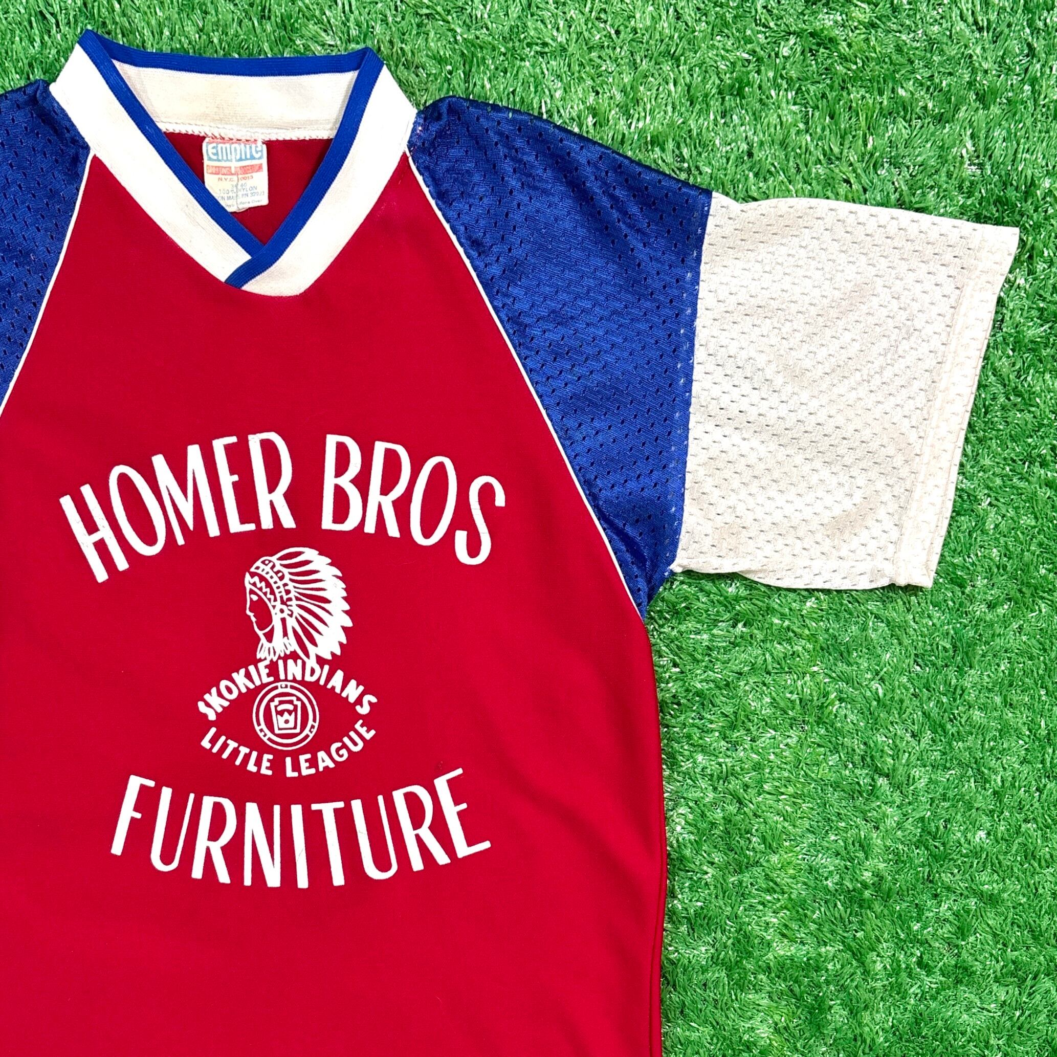フロントにはネイティブアメリカン風の横顔イラストと企業名「HOMER BROS FURNITURE」のロゴ、背面には大きな背番号「1」がプリントされたデザイン。
