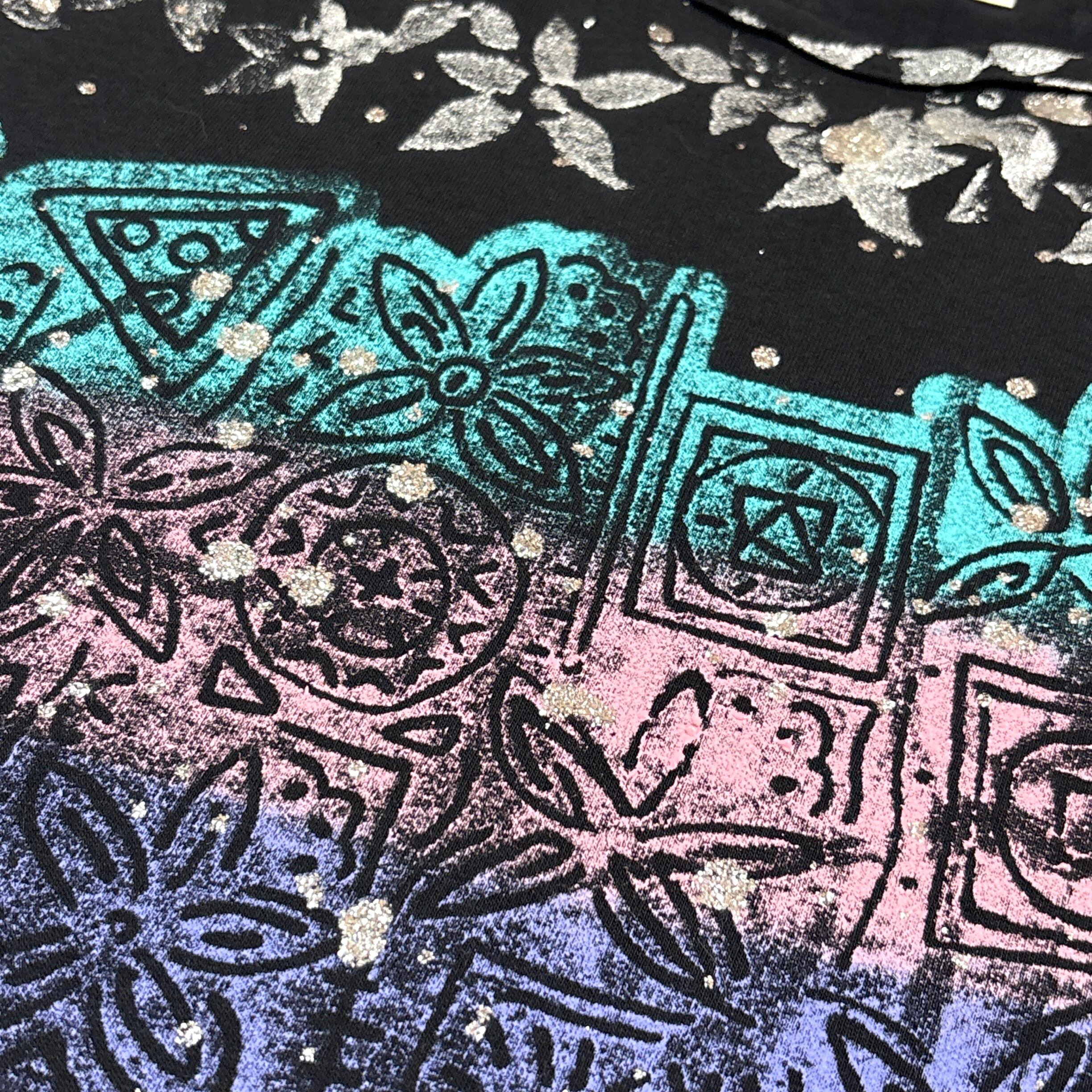 【Men's】 90s エスニック モチーフ 総柄 ラメ Tシャツ / アメリカ製 USA製 90年代 ティーシャツ T-Shirts 古着 黒 ブラック 203