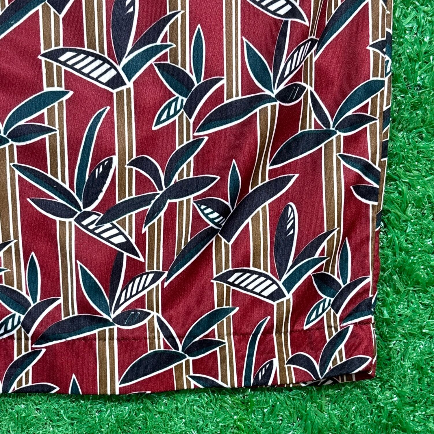 深みのある赤をベースに、竹(バンブー)を図案化したストライプ状の総柄デザインが印象的な一枚。このような竹モチーフは「竹文様(たけもんよう)」とも呼ばれ、日本の伝統的な意匠をモダンにアレンジしたパターンとして人気があります。