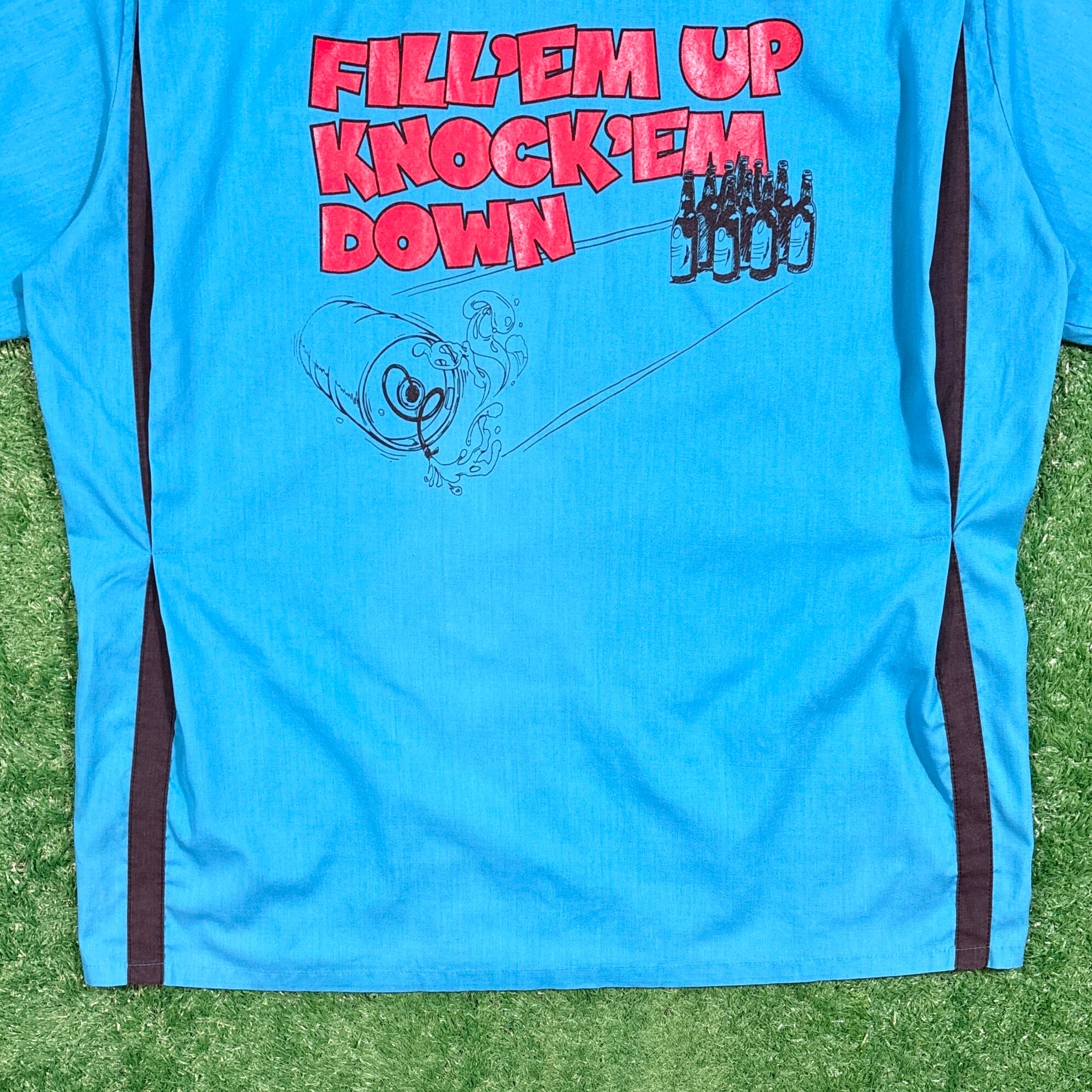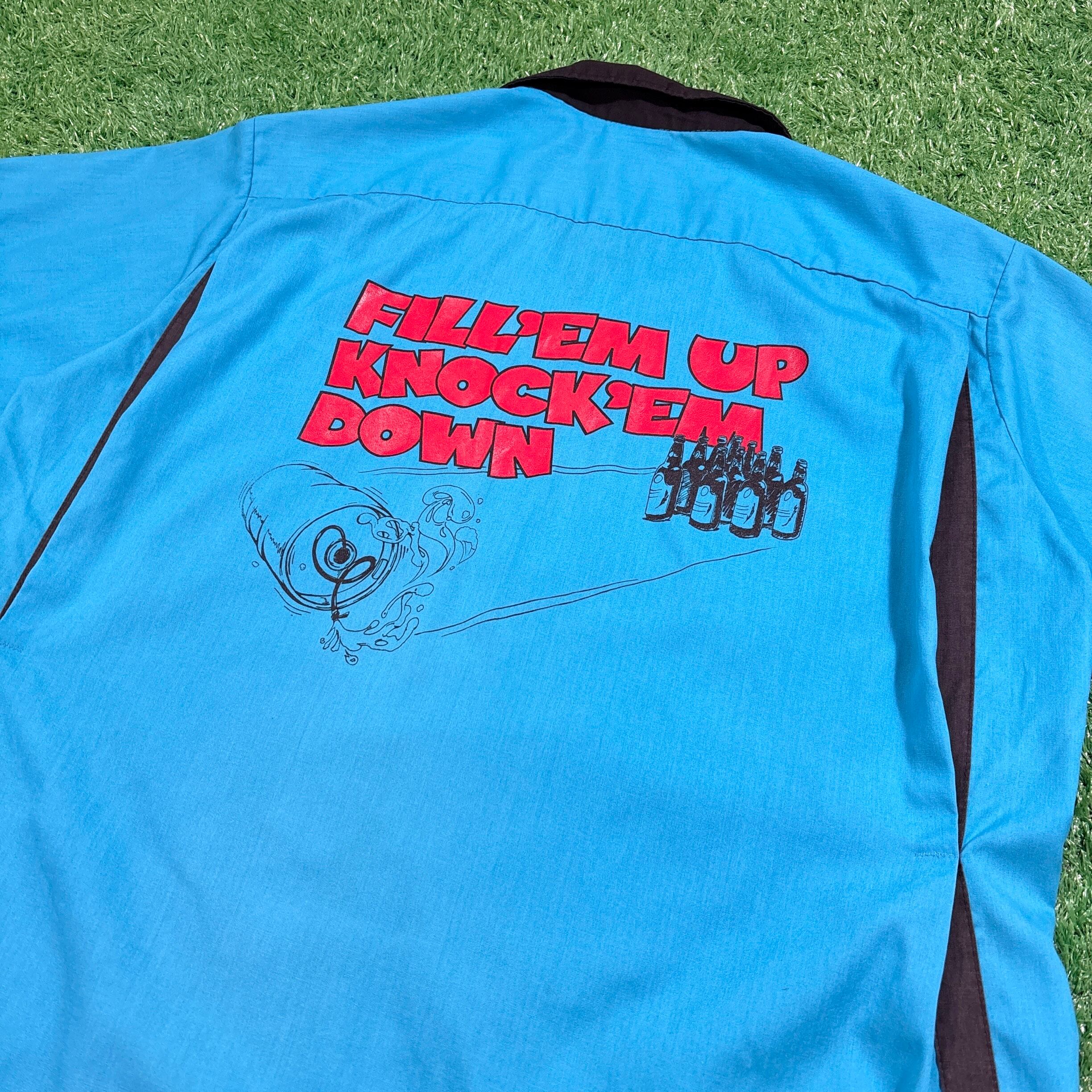 鮮やかなターコイズブルーにブラックの切り返しが映える配色で、バックには「FILL 'EM UP, KNOCK 'EM DOWN(満タンにして、全部倒せ!)」というユーモラスなメッセージとビール瓶&ボウリングのピンを掛けたアートがプリントされています。