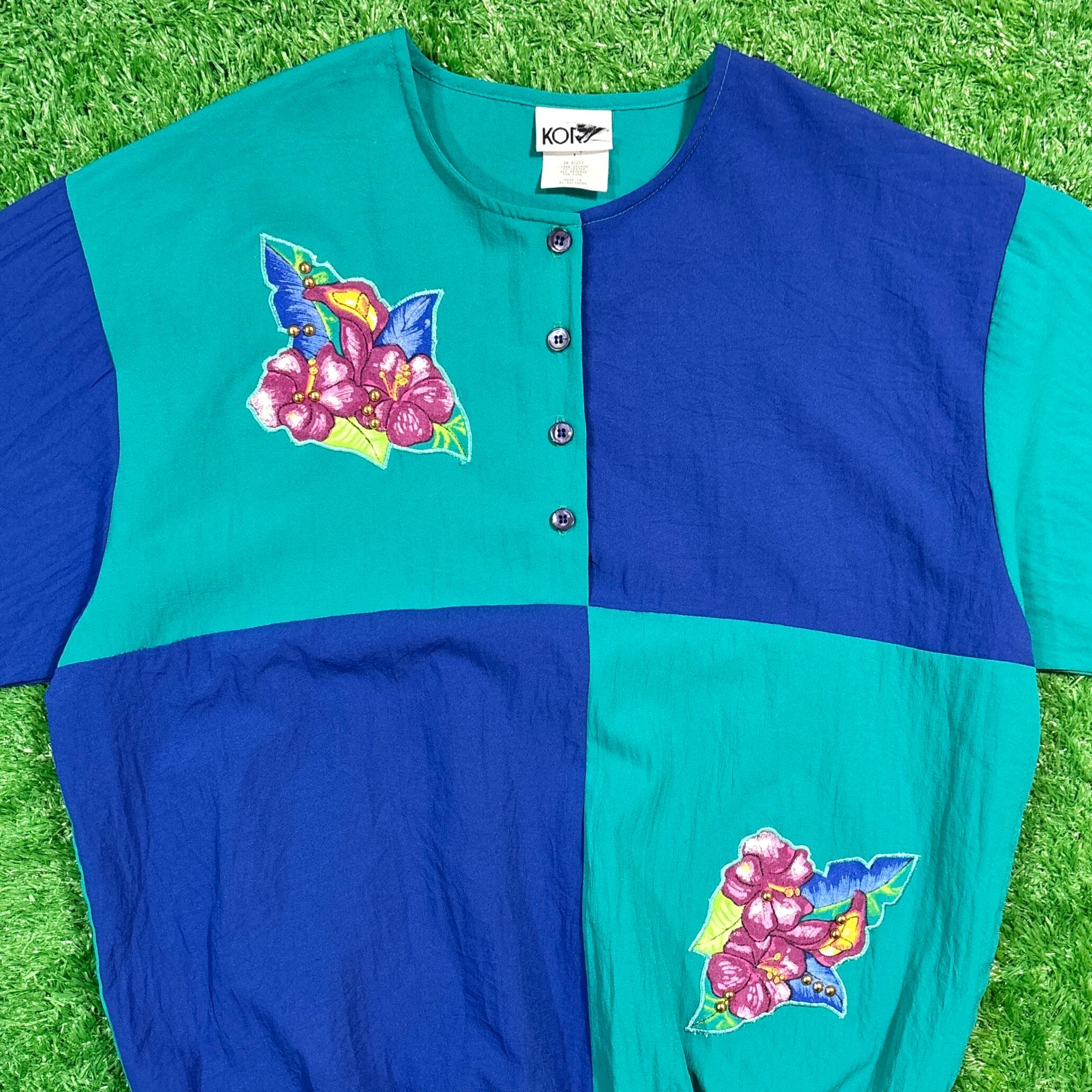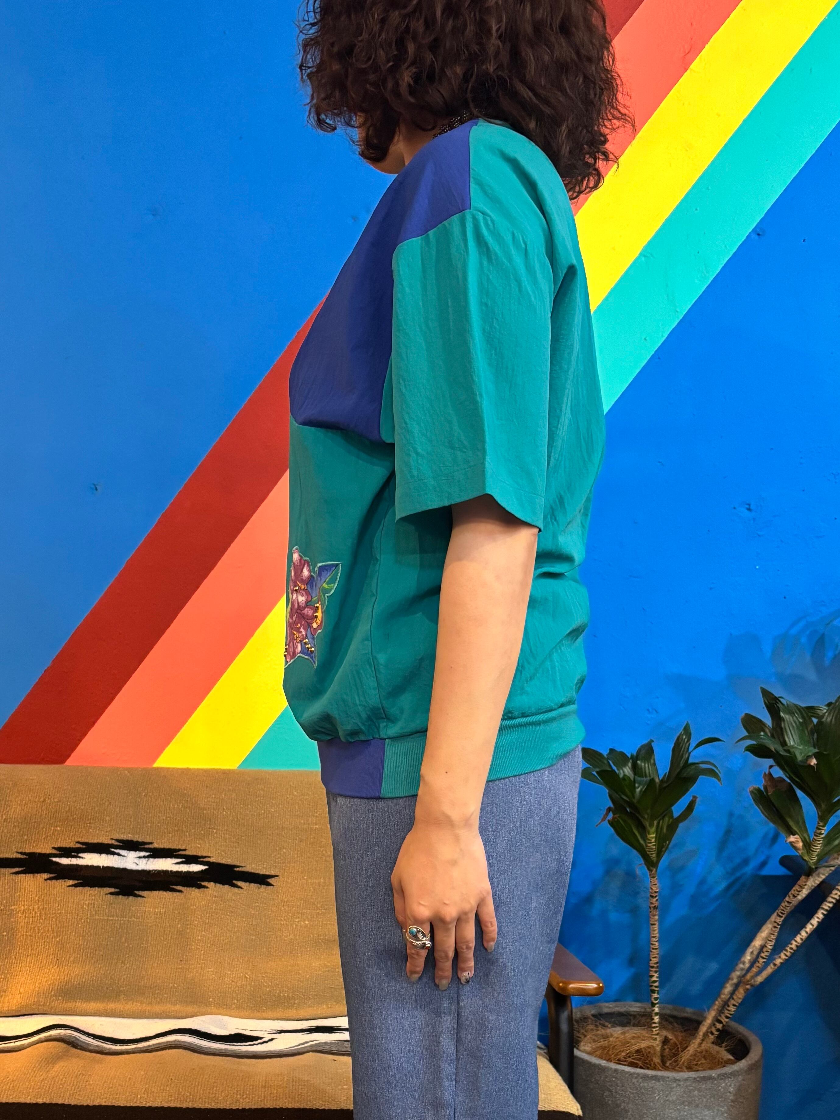 グリーン×ブルーのバイカラーデザインに、花のワンポイント刺繍が施された一着。軽やかなシャカシャカした素材感で、風通しもよく夏にぴったりのアイテムです。
