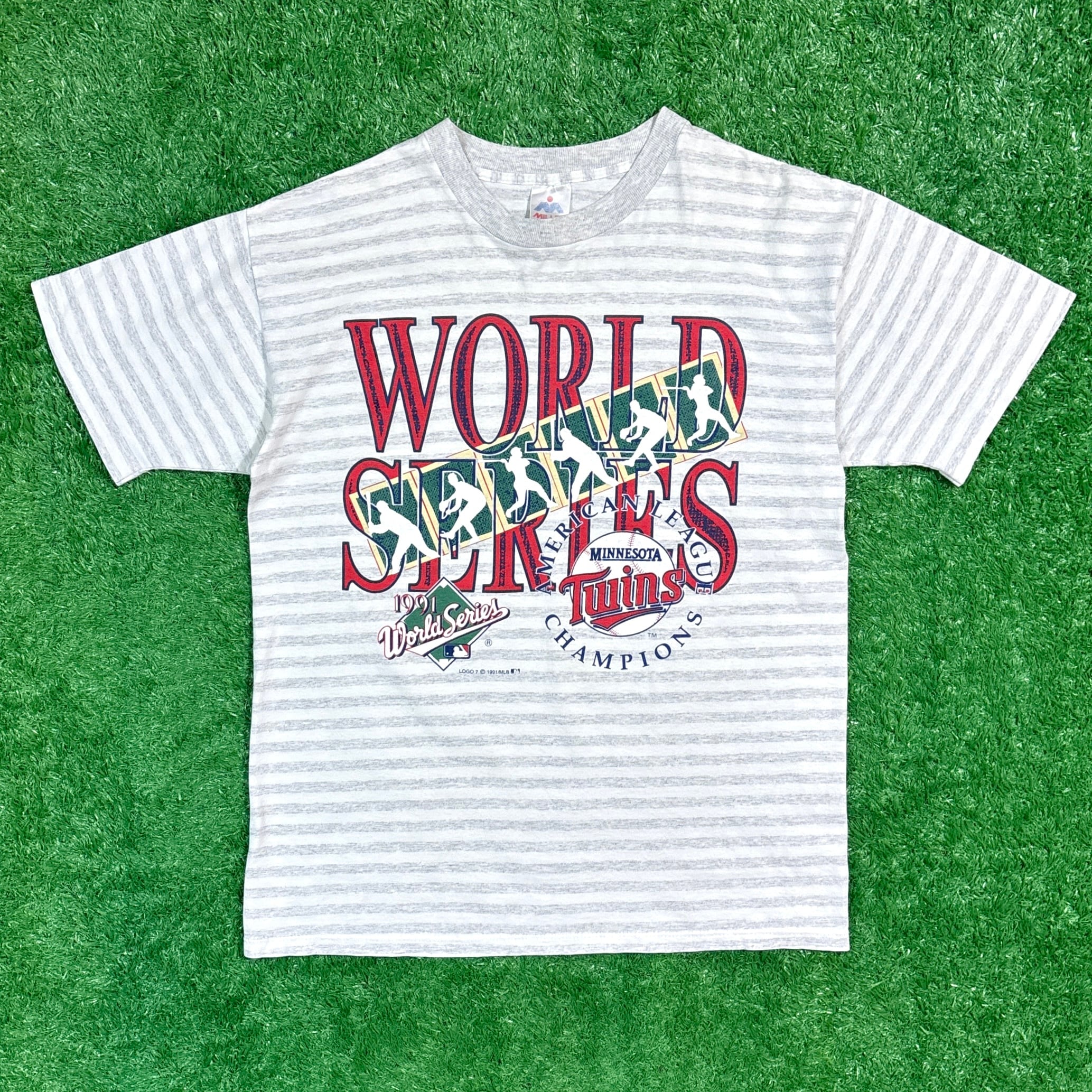 1991年のMLBワールドシリーズで優勝を果たした、ミネソタ・ツインズ(MINNESOTA TWINS)の記念Tシャツです。90年代アメリカ製らしい雰囲気が漂う一枚です。