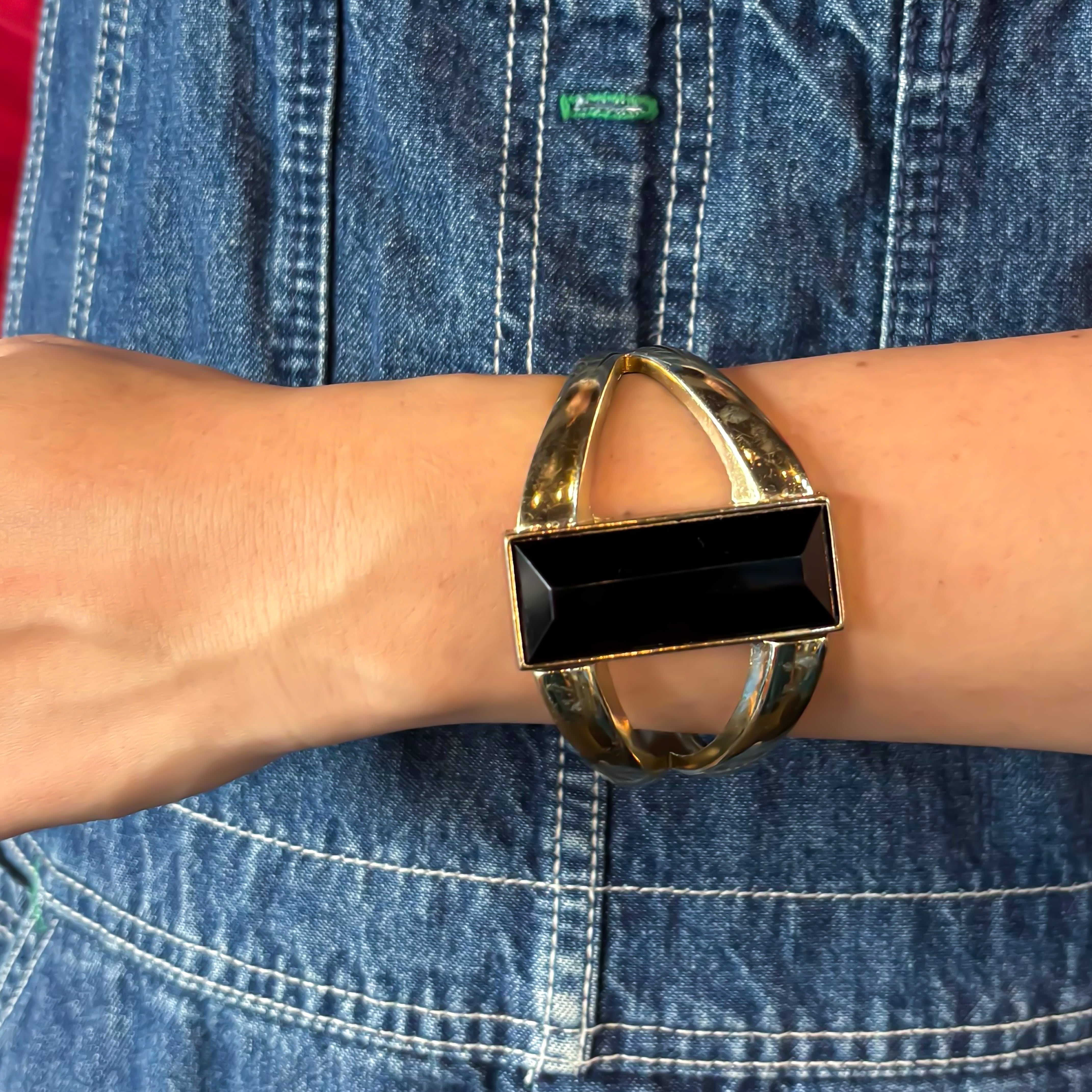 大ぶりなブラックパーツが印象的な、ゴールドカラーのブレスレットです。