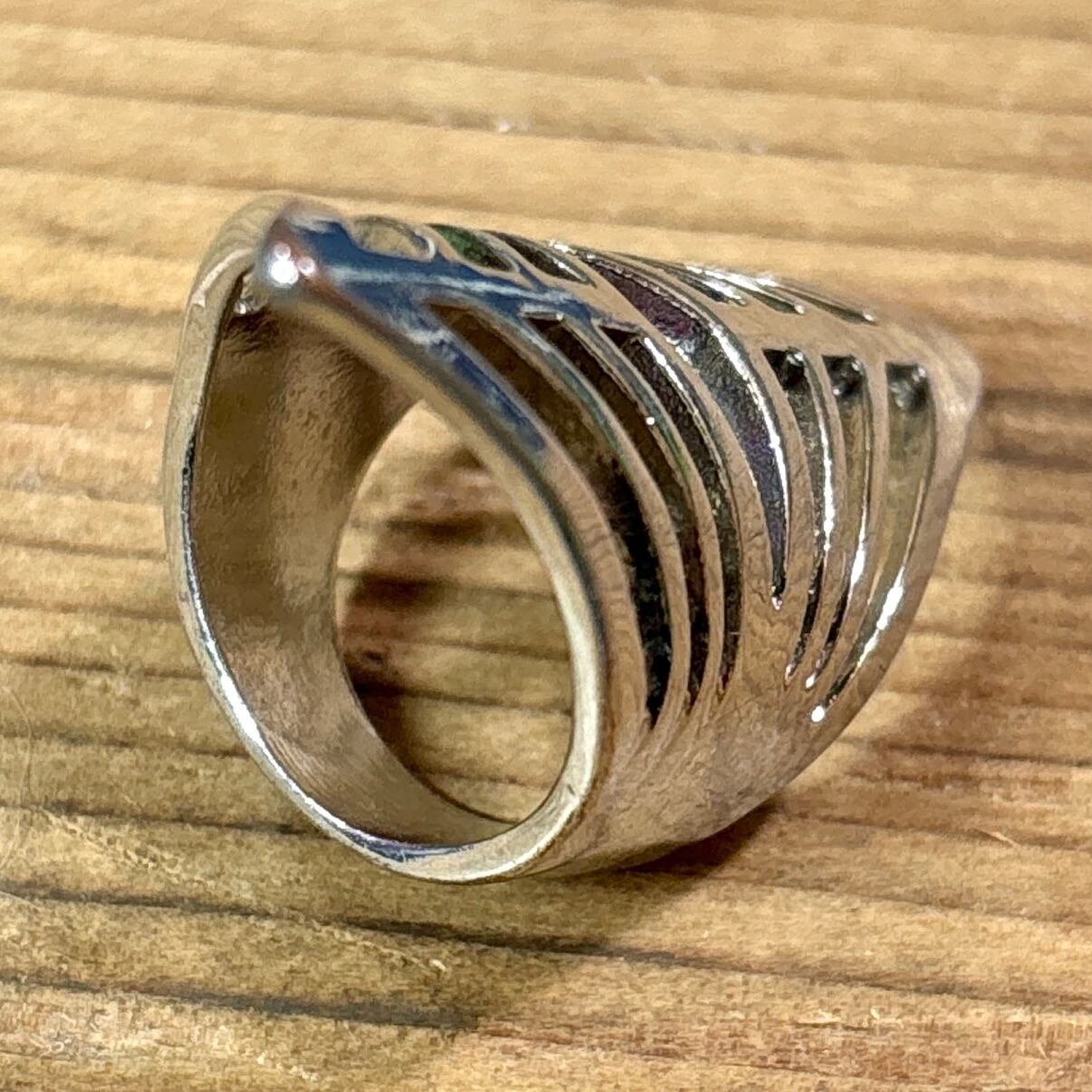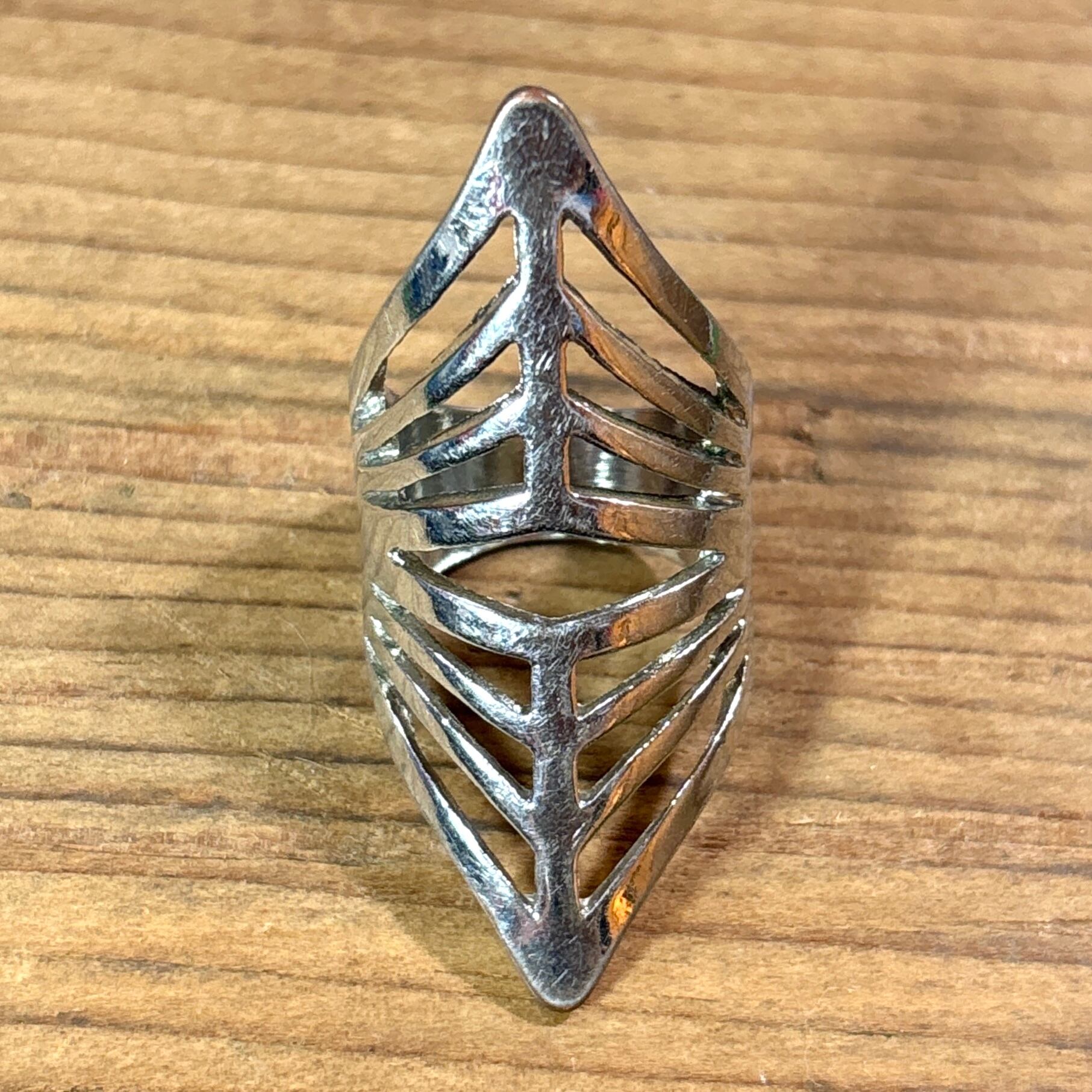 縦に長く伸びたシルエットに、リーフや骨格のようなデザインカットが施された独特の存在感ある一品。指のラインに沿うようにカーブしたデザインで、着けたときの立体感がとても美しく映えます。メンズ・レディース問わず、ユニセックスでお使いいただけます。