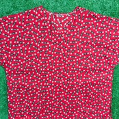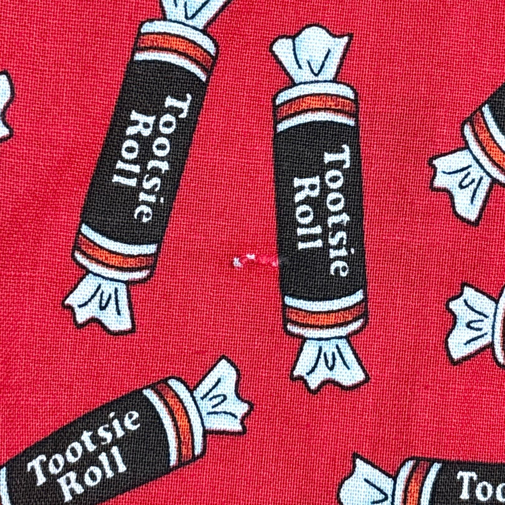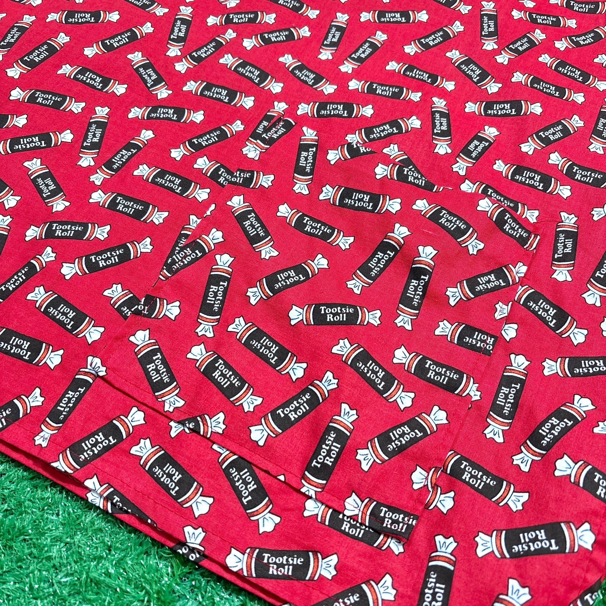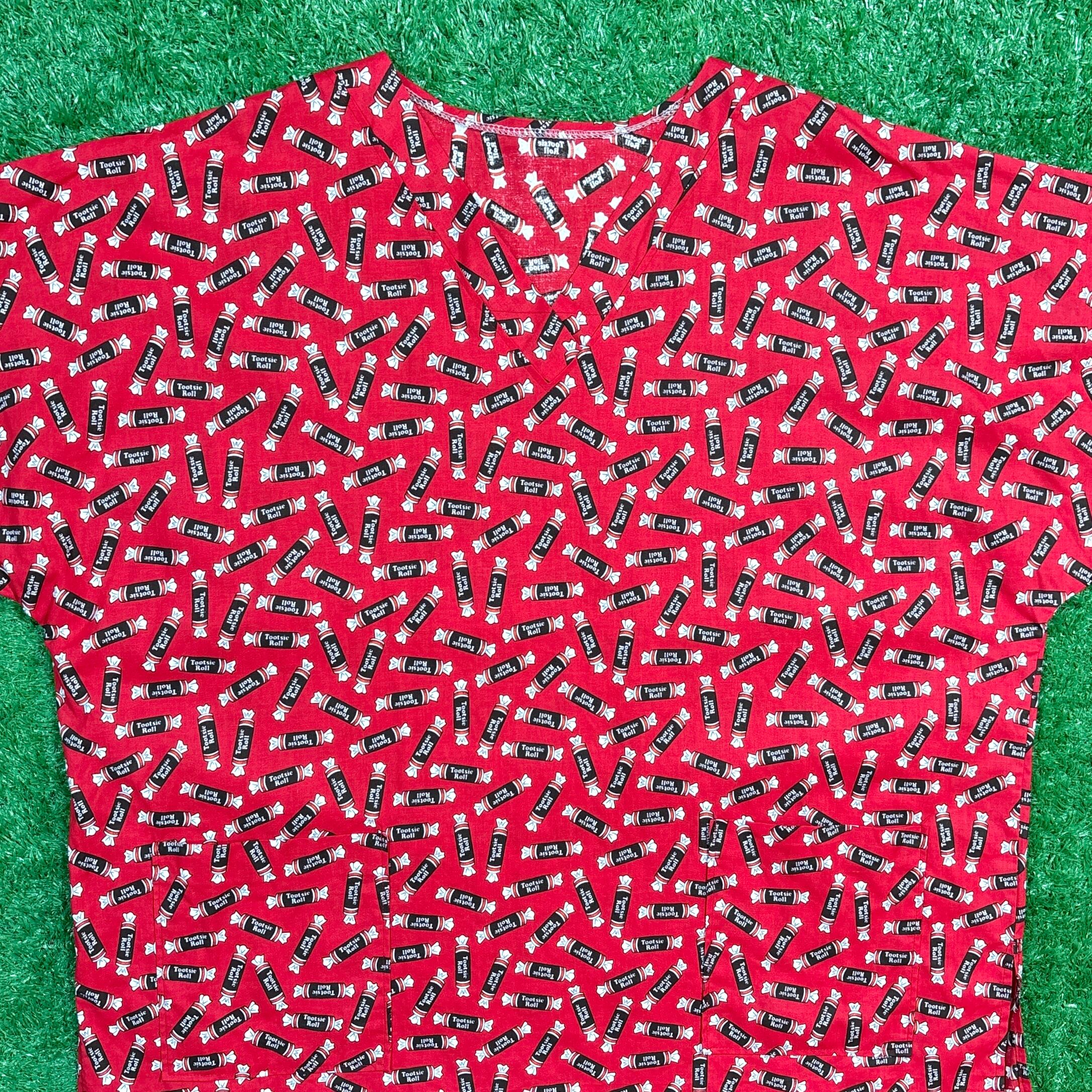 アメリカの人気キャンディ「Tootsie Roll」の総柄がユニークな、スクラブタイプのトップスです。