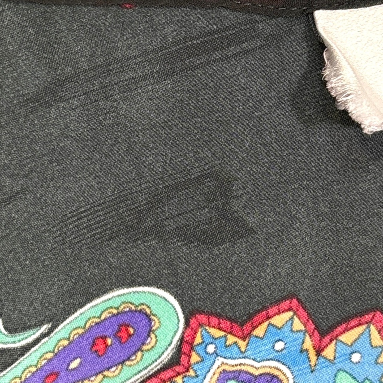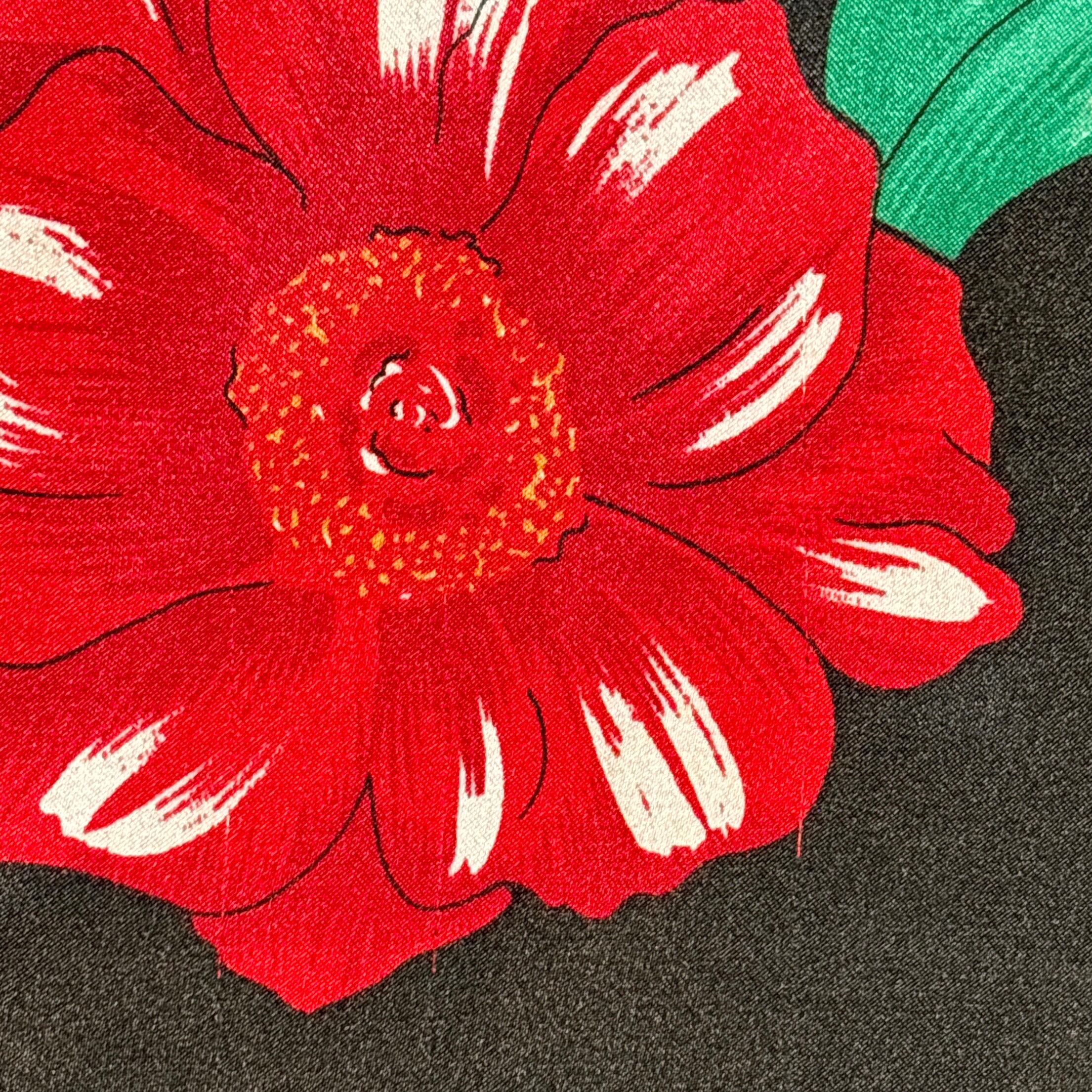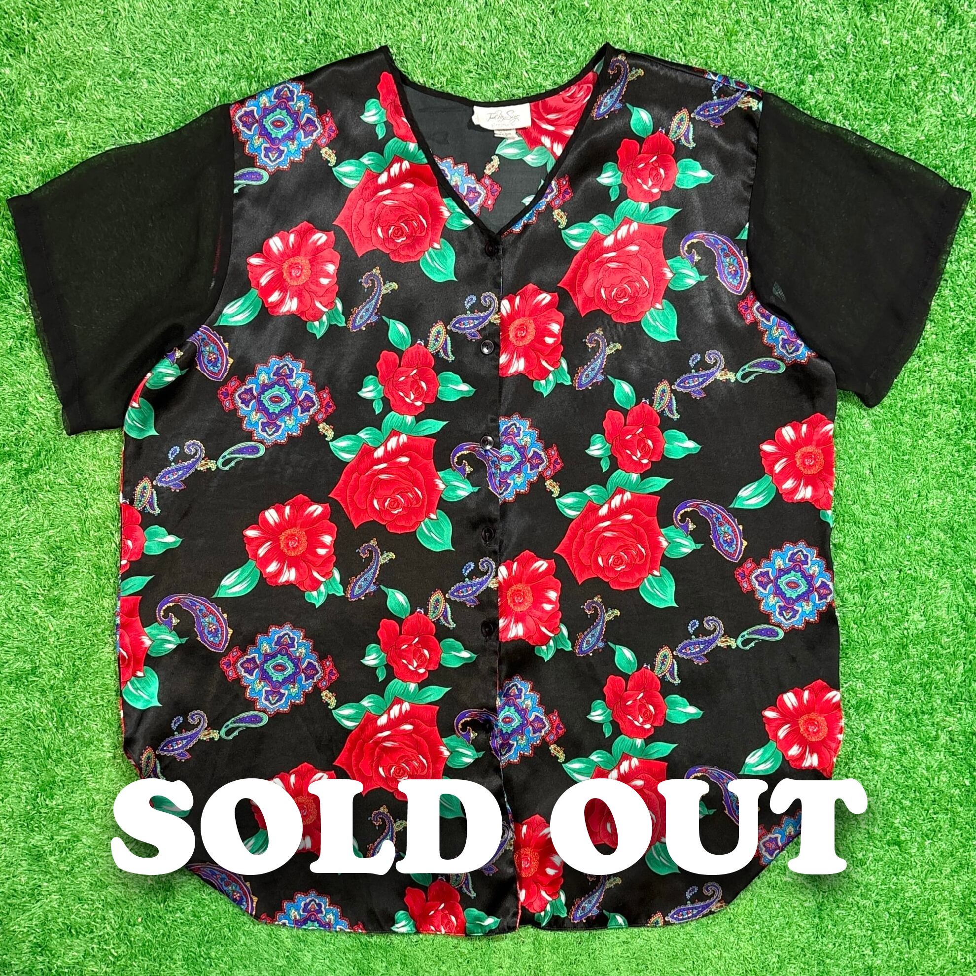 90年代らしい存在感のあるバラ柄が目を引く、オーバーサイズのデザインシャツです。フロントはボタン仕様で、つるっとした光沢感のある素材がレトロで上品な雰囲気。袖部分はほんのり透け感のあるシアー素材が使われており、軽やかで涼しげな印象です。