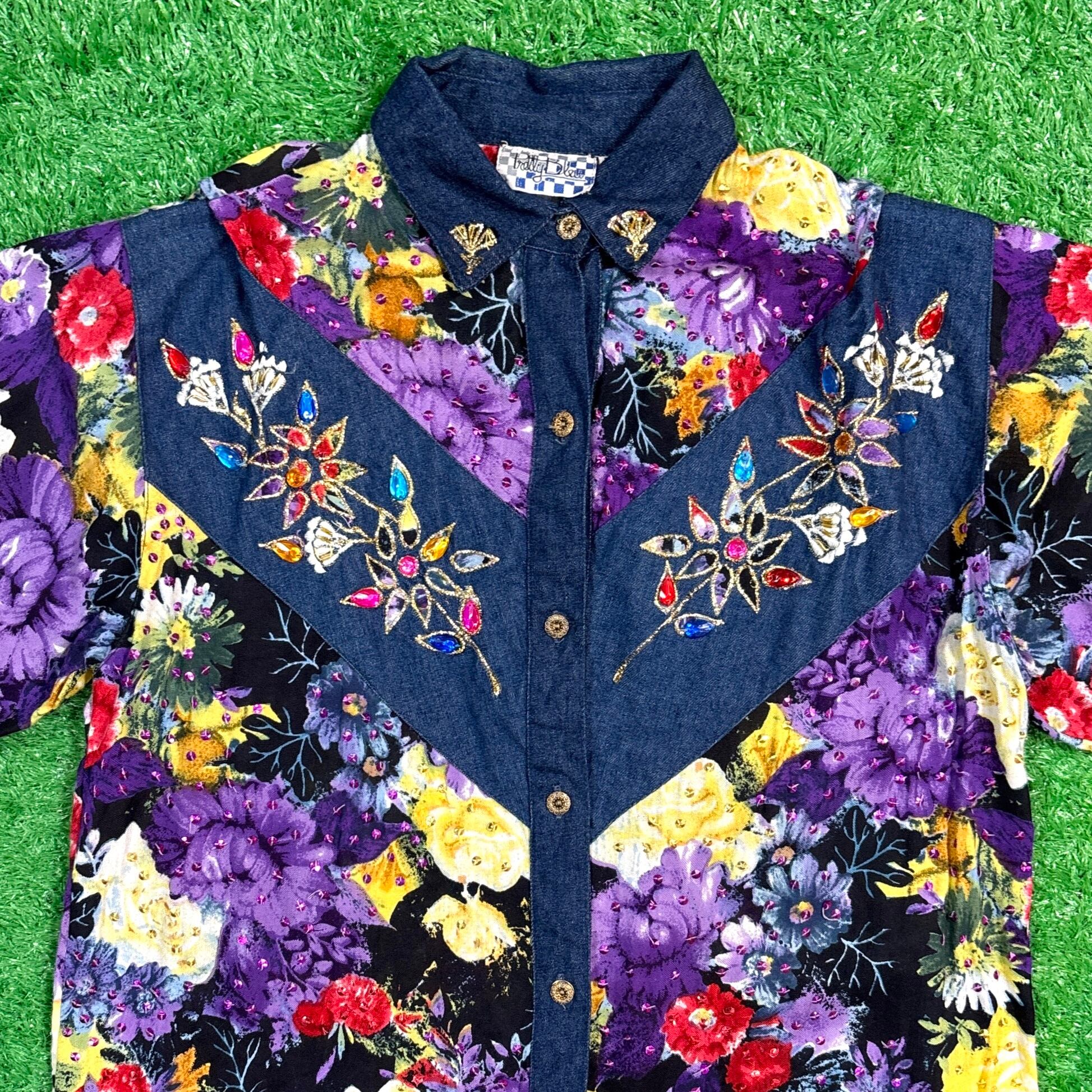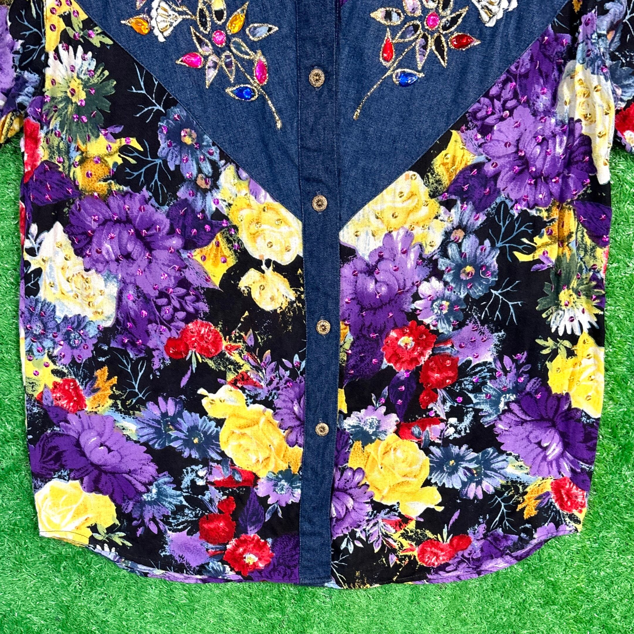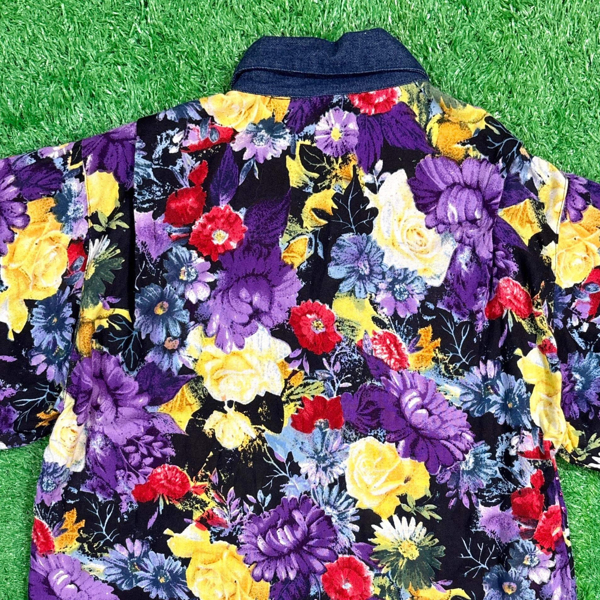 【Lady's】 90s 花柄 デニム レーヨン ミックス 半袖 シャツ / 90年代 総柄 柄シャツ レディース 夏 276