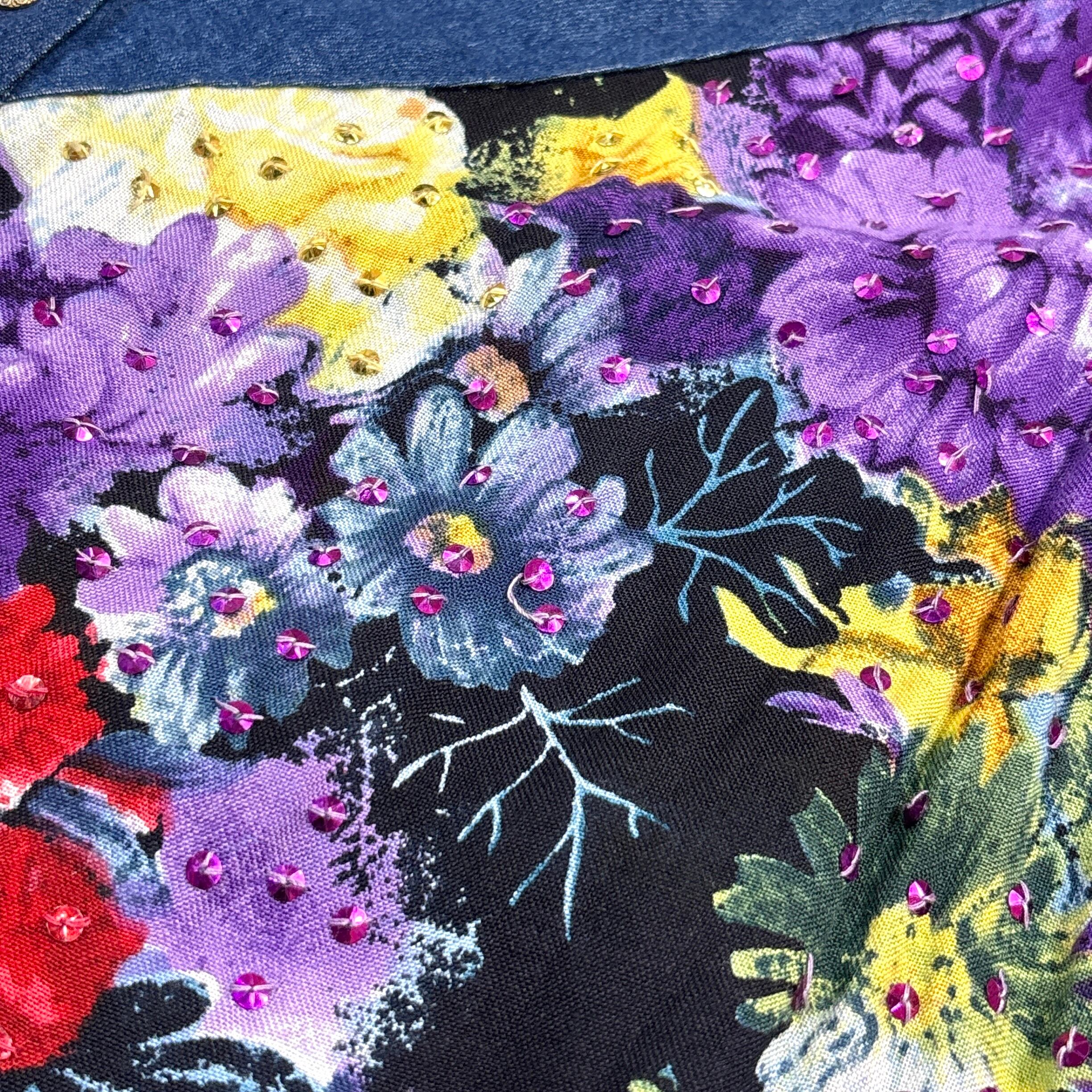 色鮮やかなフラワーパターンと、濃紺デニムの異素材ミックスが目を引く、インパクト抜群の一着。