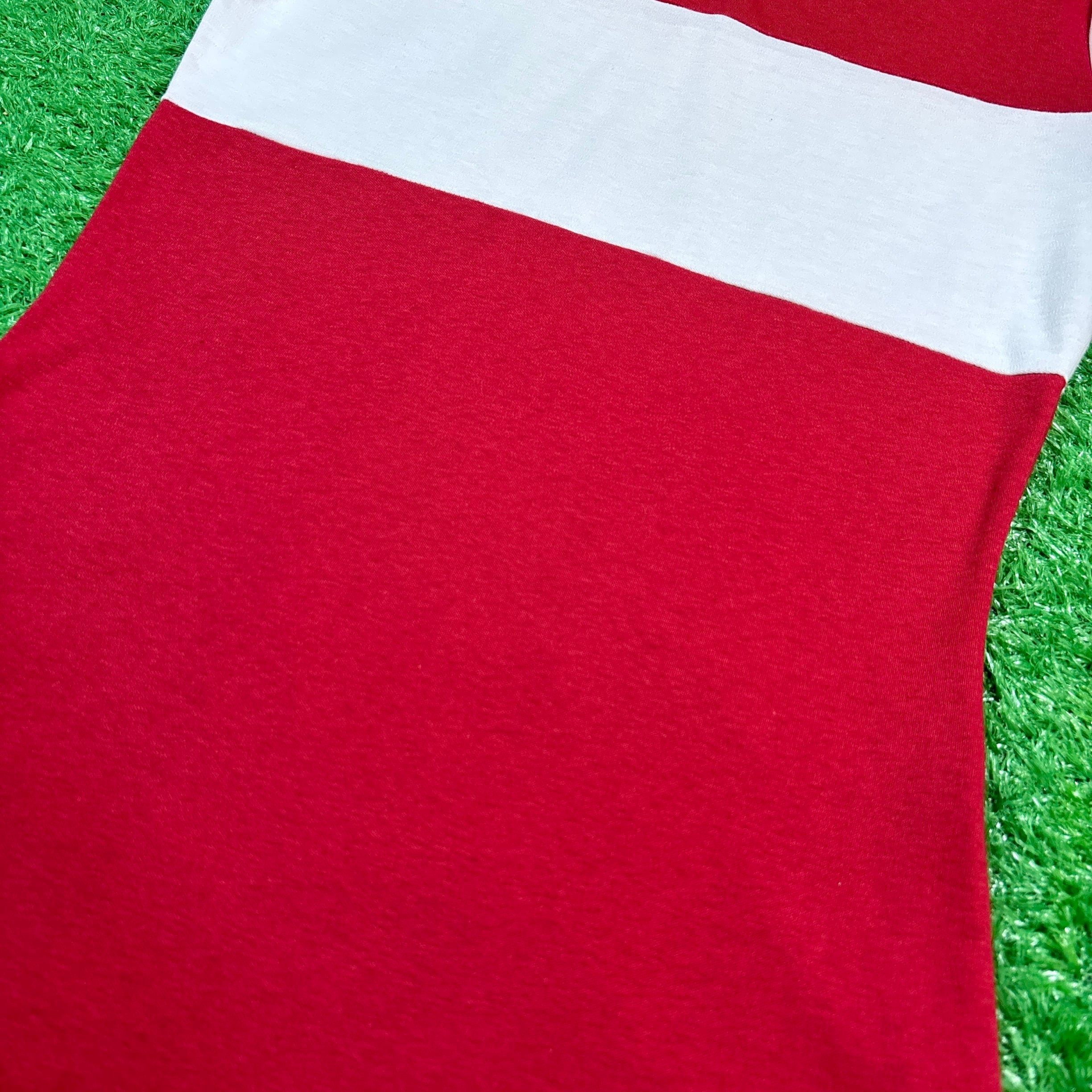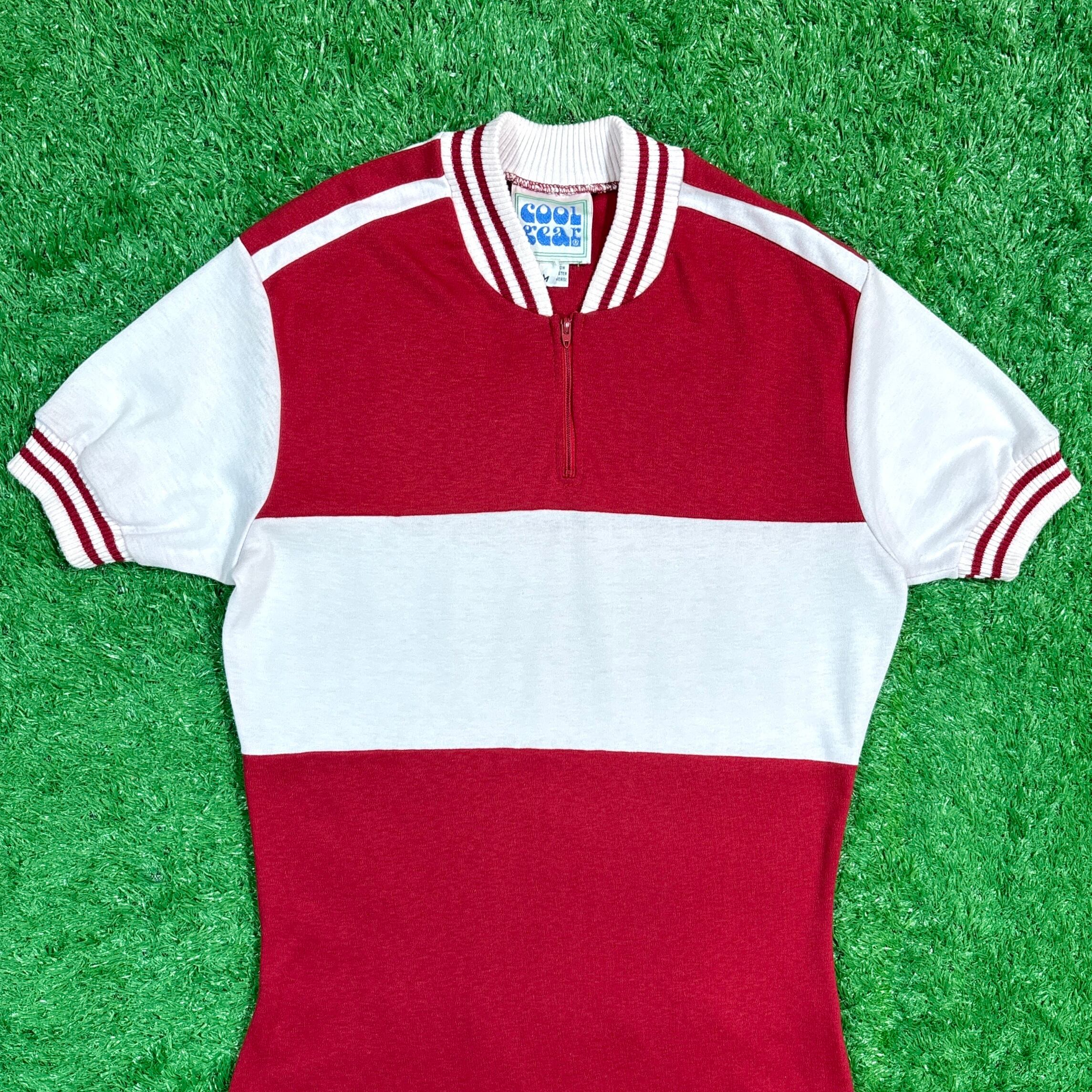 赤×白のバイカラーデザインに、ライン入りの襟&袖リブがアクセント。クラシックなディテールで、ボディはやや伸縮性のあるジャージ素材(ポリエステル系)を使用。タイトめのシルエットで、80sらしいスポーティな雰囲気が楽しめる1着です。