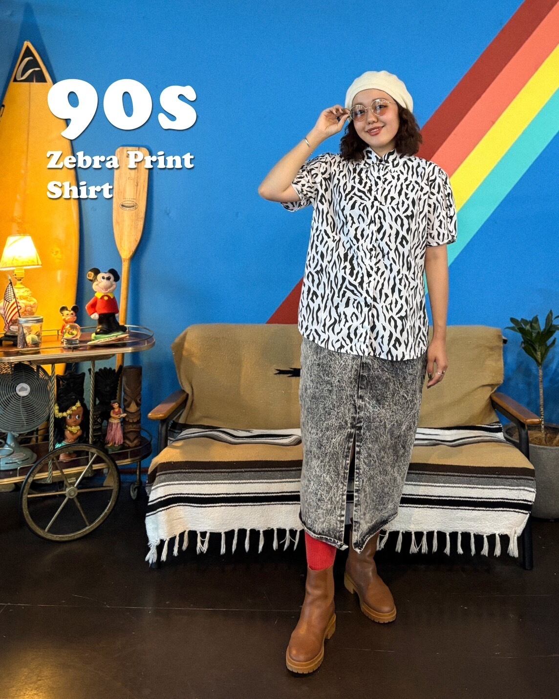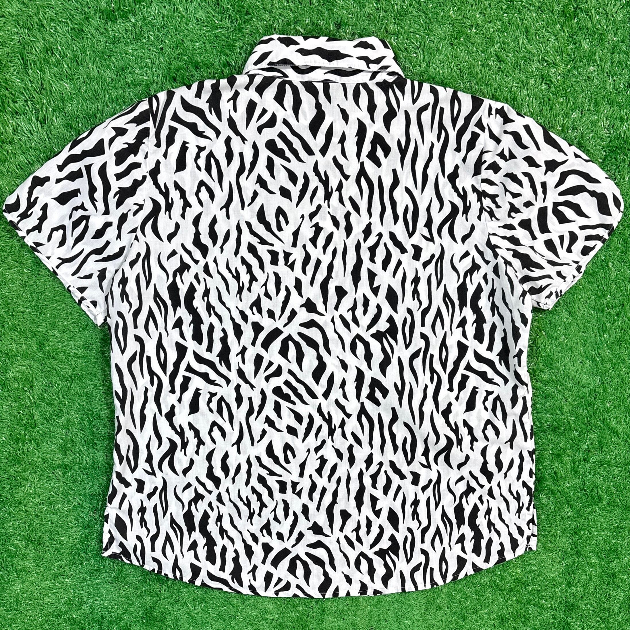 【Lady's】 90s ゼブラ柄 デザイン シャツ / 90年代 半袖 ゼブラ アニマル 動物 古着 レディース 夏 総柄 柄シャツ モノトーン 白黒 337