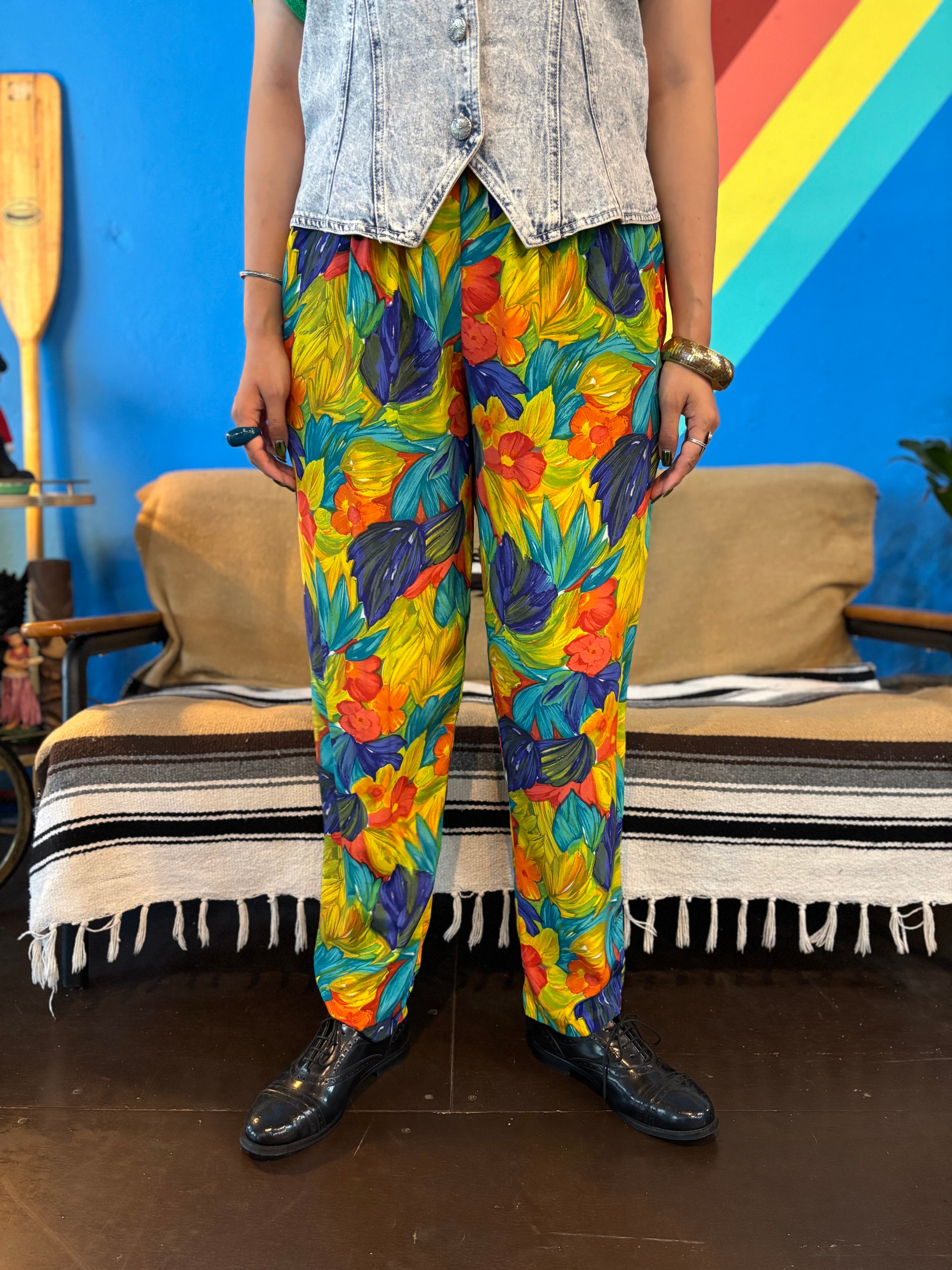 ビビッドなフラワー柄が目を引く1本。シャカシャカとしたポリエステル系の薄手でサラッとした素材感で、夏でも涼しく着られるパンツです。ウエストはゴム仕様で穿き心地も楽ちん。90sらしい華やかさが魅力のアイテムです。