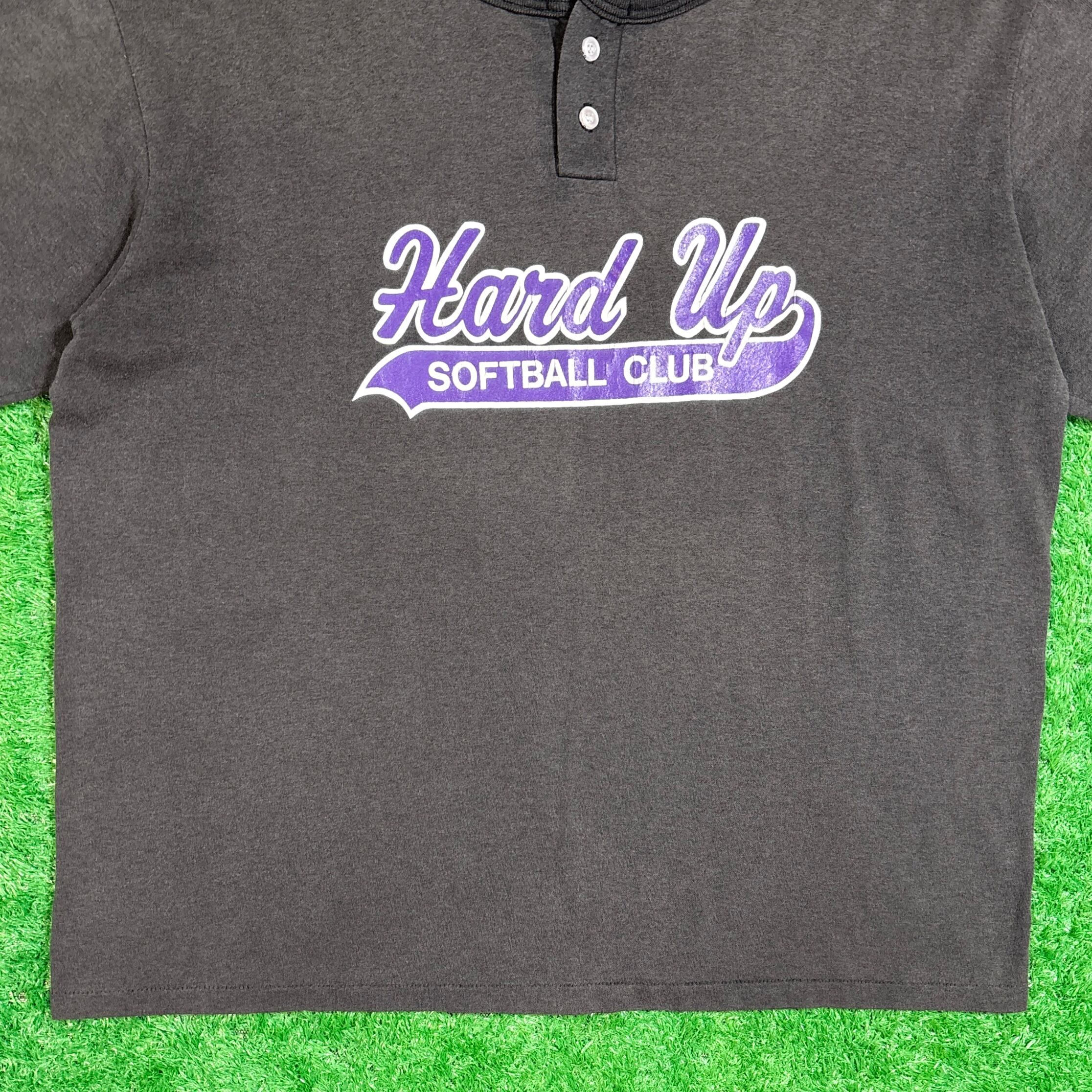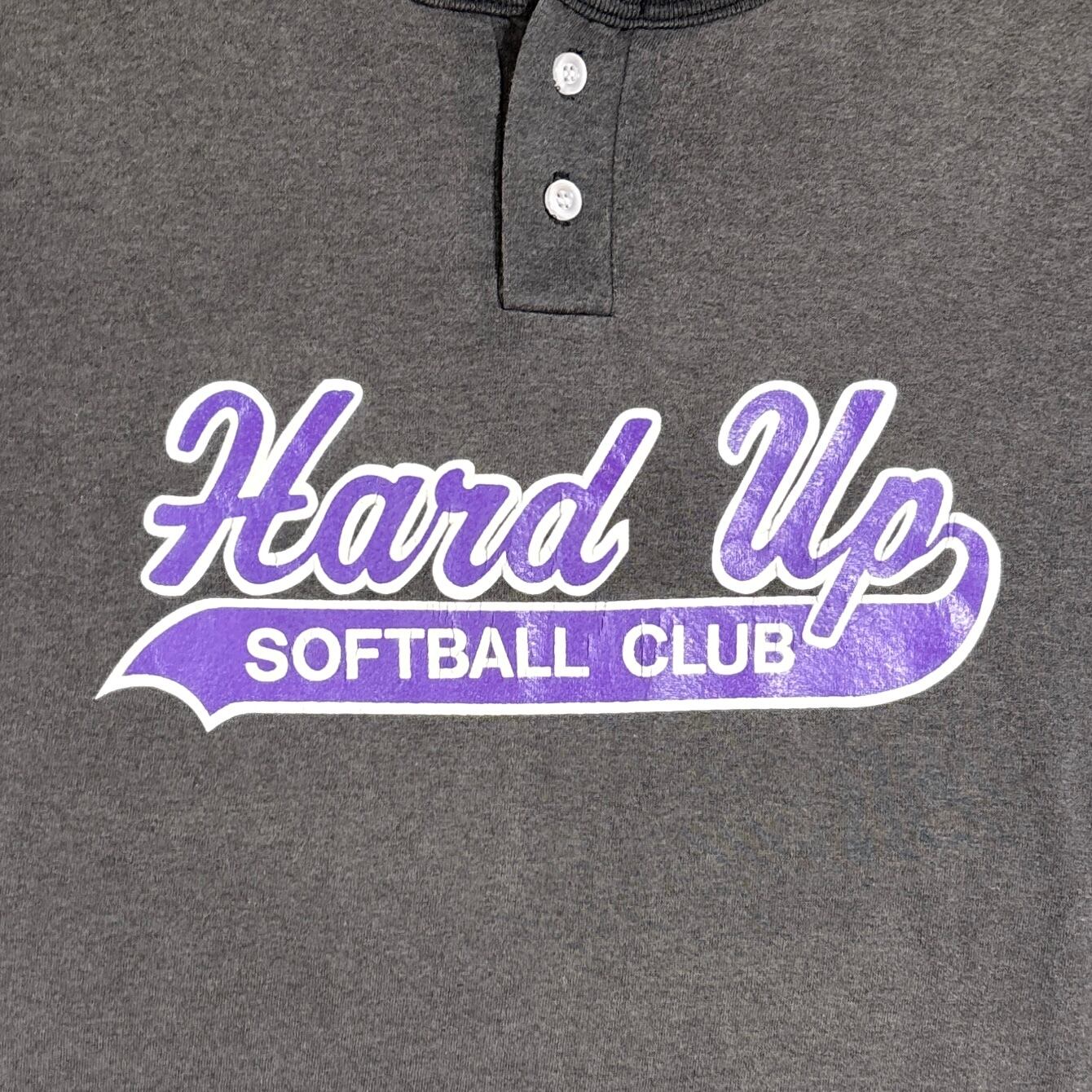 ブラックボディに、フロントにはパープルの「Hard Up SOFTBALL CLUB」ロゴが入った一枚。色落ちや薄くなった生地感がヴィンテージらしい味のある雰囲気を演出しています。首元はヘンリーネック仕様で、カジュアルながら程よいアクセントに。90sらしいゆるいシルエットも魅力です。