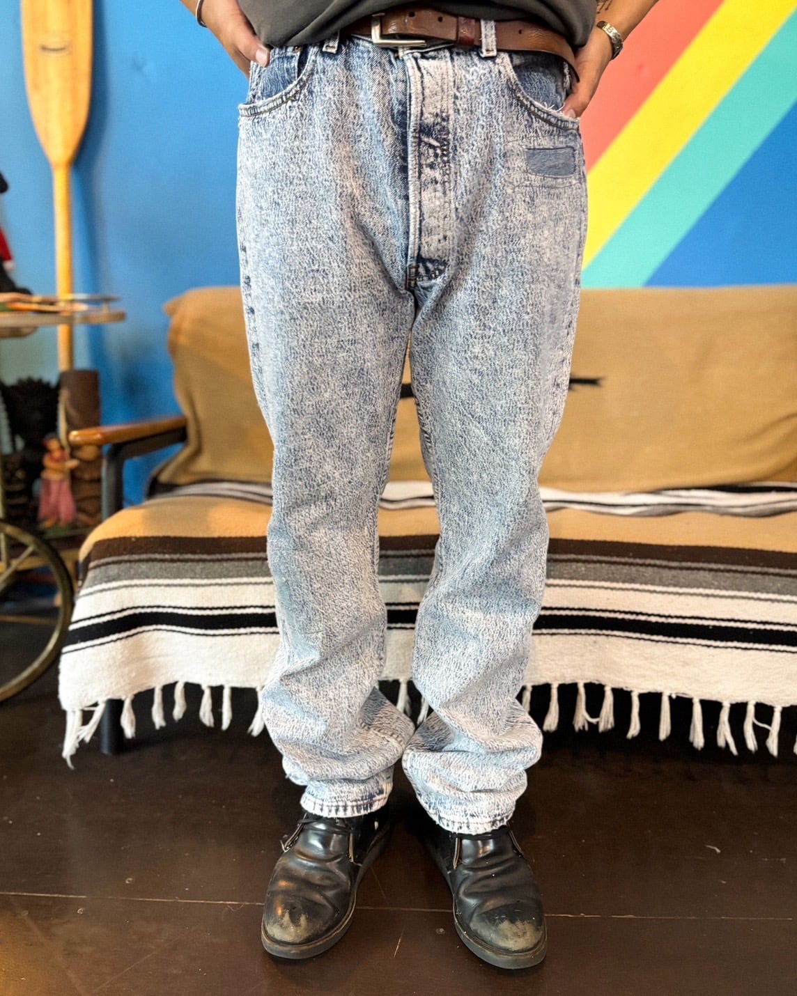 USA製ならではのタフな作りと、80年代らしい個性が詰まった一本。特徴は、全体に施されたケミカルウォッシュ加工による独特の表情と、ところどころに見られる補修跡。これらのリペアは、ただのダメージ補修にとどまらず、リメイクのようなデザインアクセントになっており、他にはない一点もの感を演出しています。