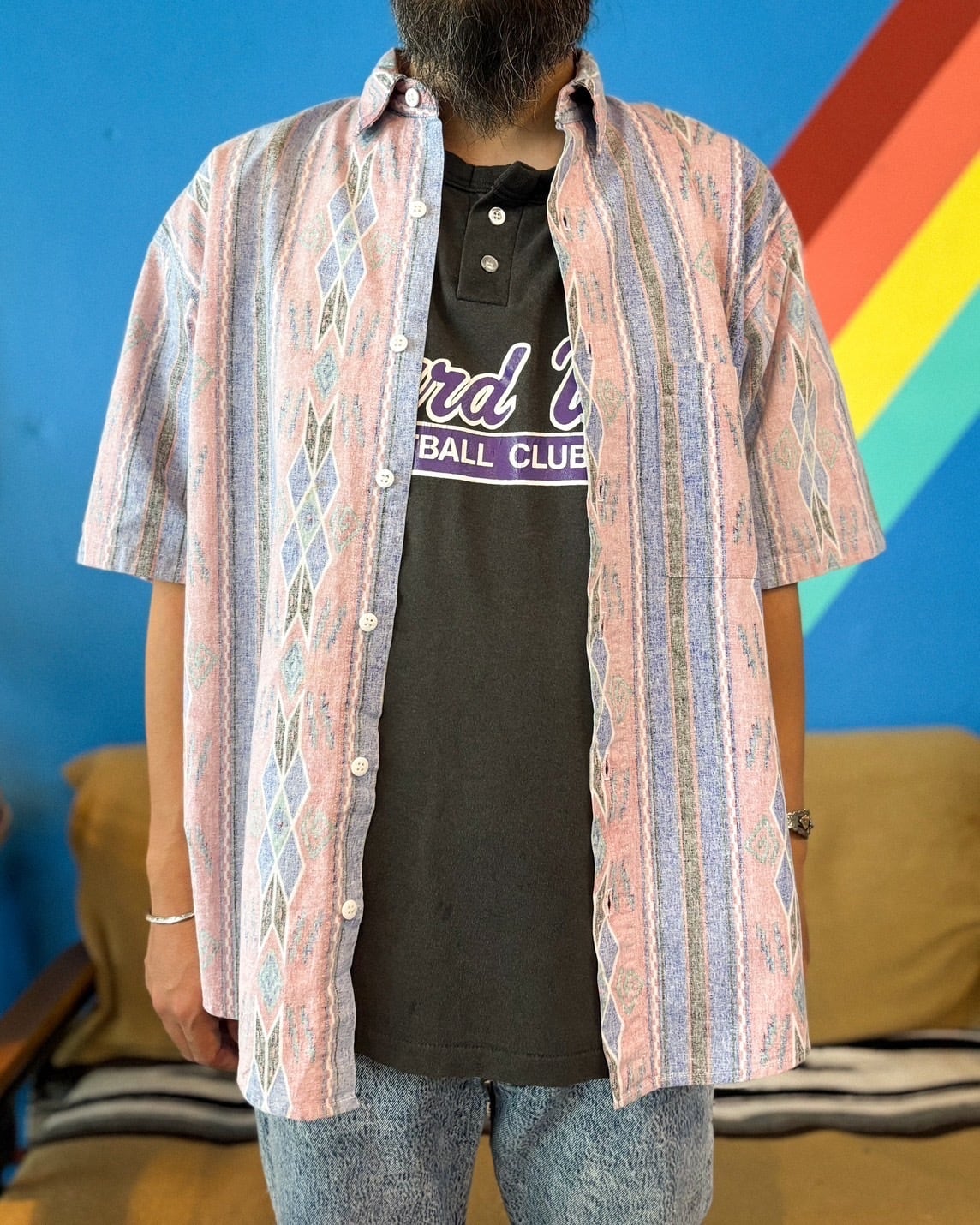 ピンクをベースにブルーやホワイトのトーンで構成された優しいカラーリングが印象的。リバースプリント特有の風合いと、ネイティブ調の幾何学模様がヴィンテージらしい一枚です。ボックス型のややゆったりとしたシルエットで、リラックス感もあります。軽やかな素材感で、真夏にも涼しく着られる半袖シャツです。