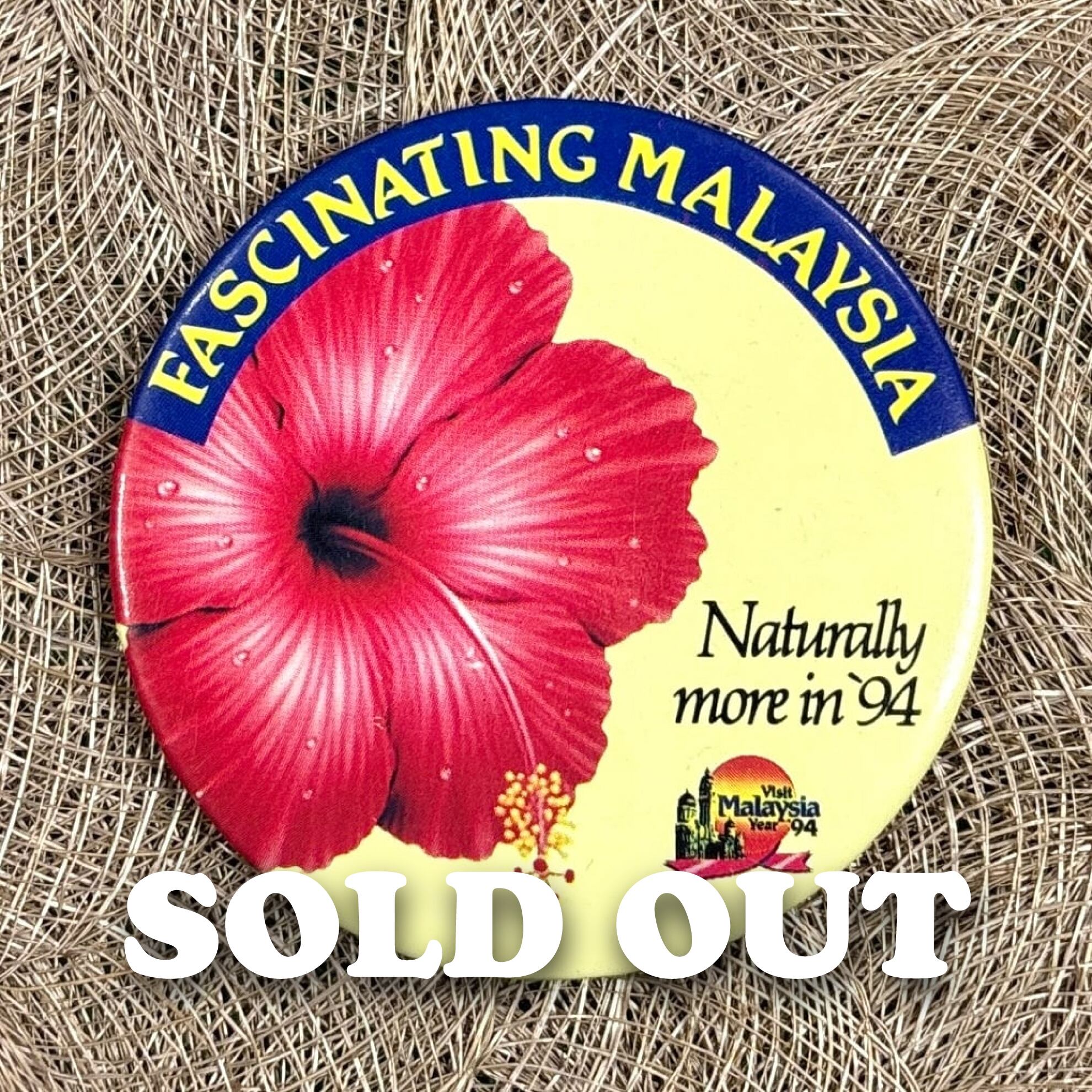 大ぶりな赤いハイビスカスのイラストが印象的で、「FASCINATING MALAYSIA(魅力的なマレーシア)」のメッセージが描かれた、観光キャンペーン用のアイテムと思われます。下部には「Visit Malaysia Year 1994(1994年 マレーシア観光年)」のロゴが入っており、当時のプロモーション用に配布されたものと推測されます。