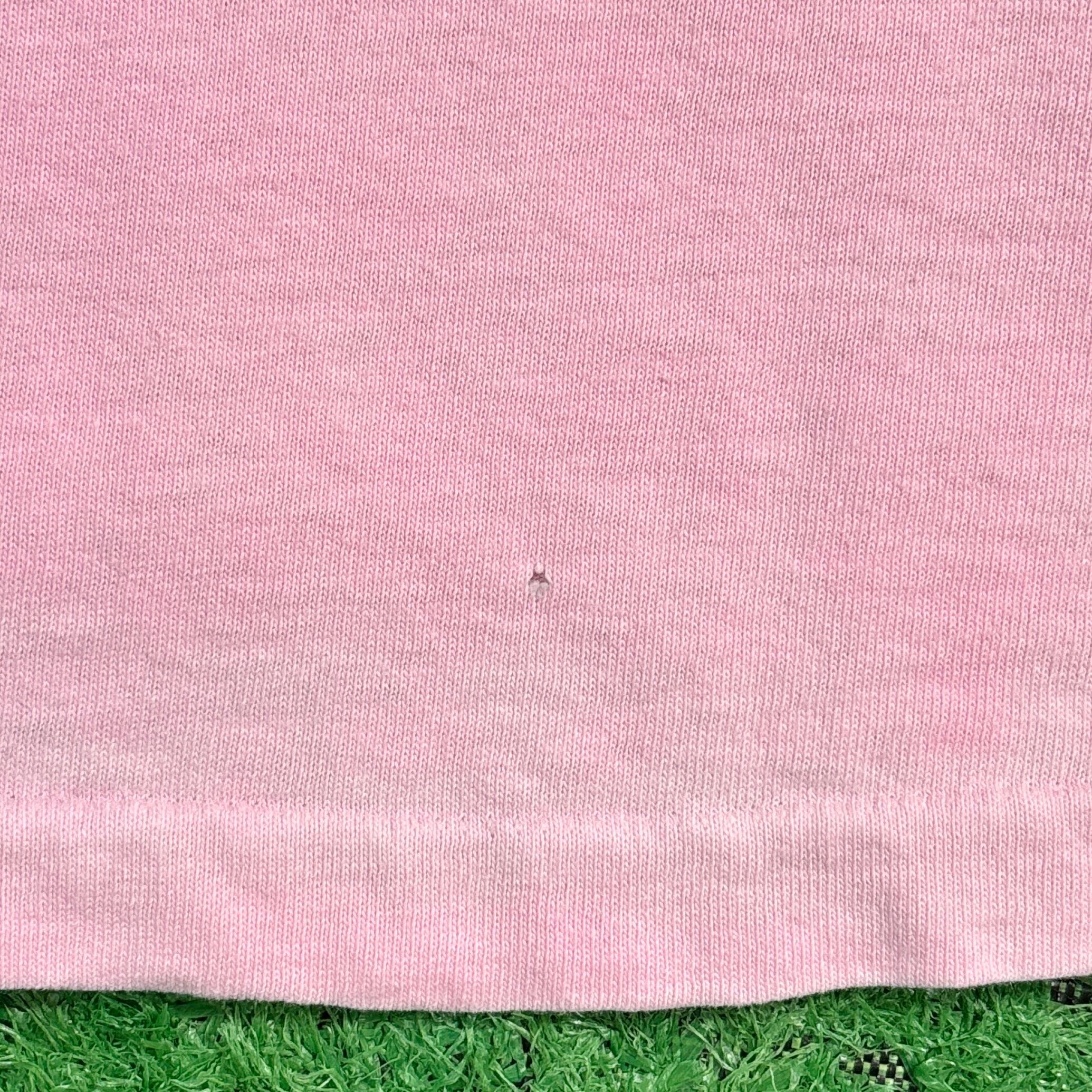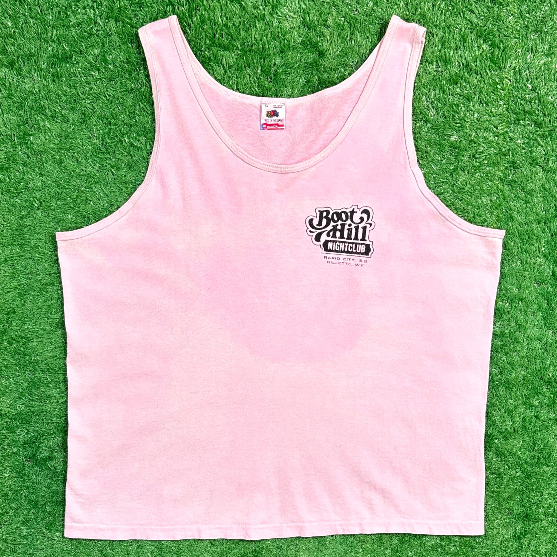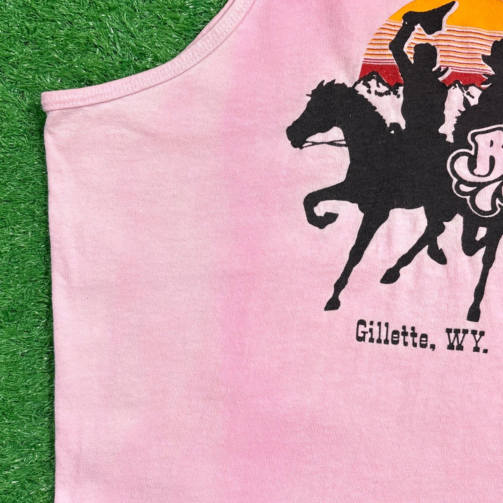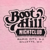 淡いピンクのボディに、カウボーイのシルエットと「BOOT HILL NIGHTCLUB」のロゴが印象的な一枚。Rapid City(サウスダコタ州)とGillette(ワイオミング州)という実在の街の名前もプリントされており、アメリカのカントリーカルチャーが感じられるウエスタンテイストなデザインです。