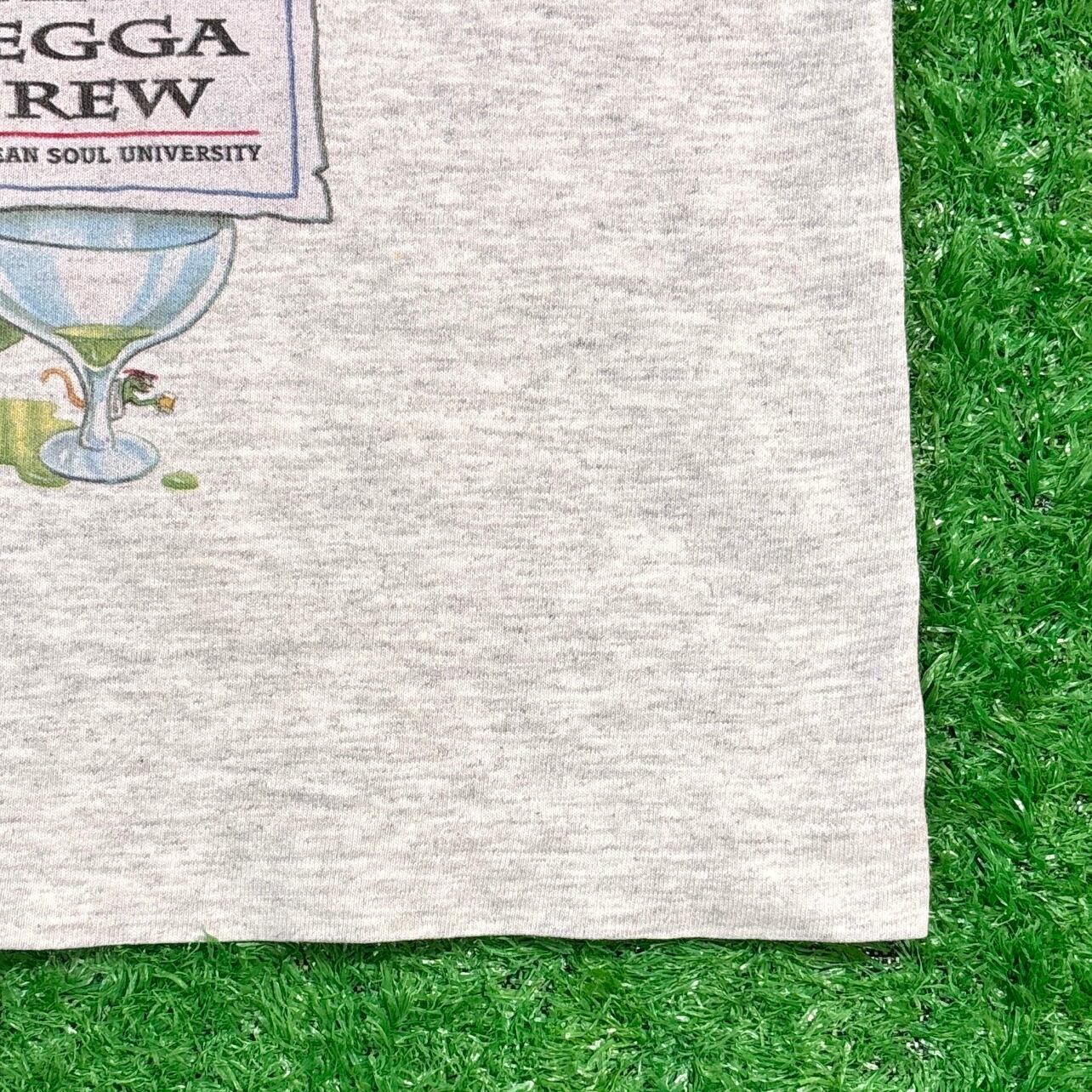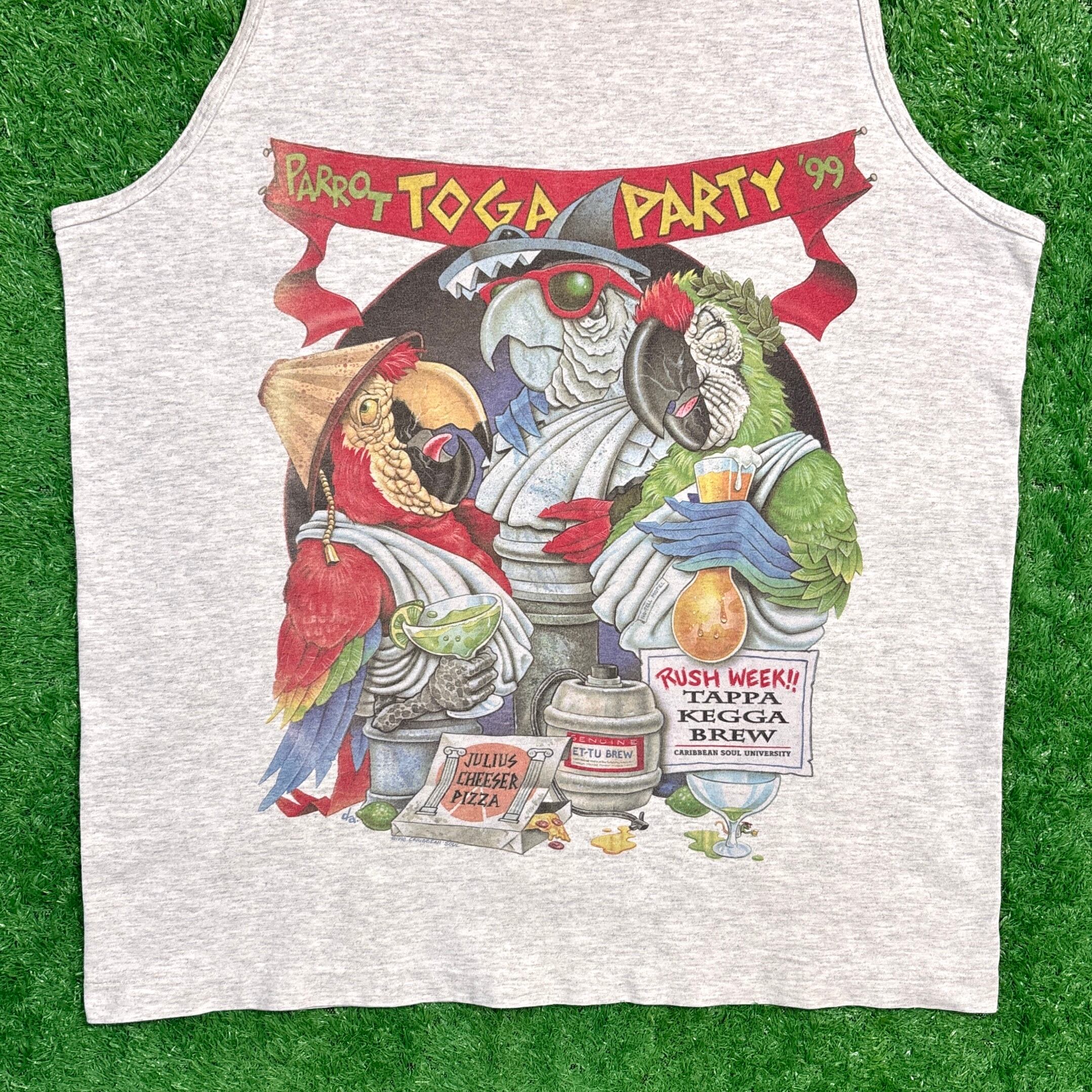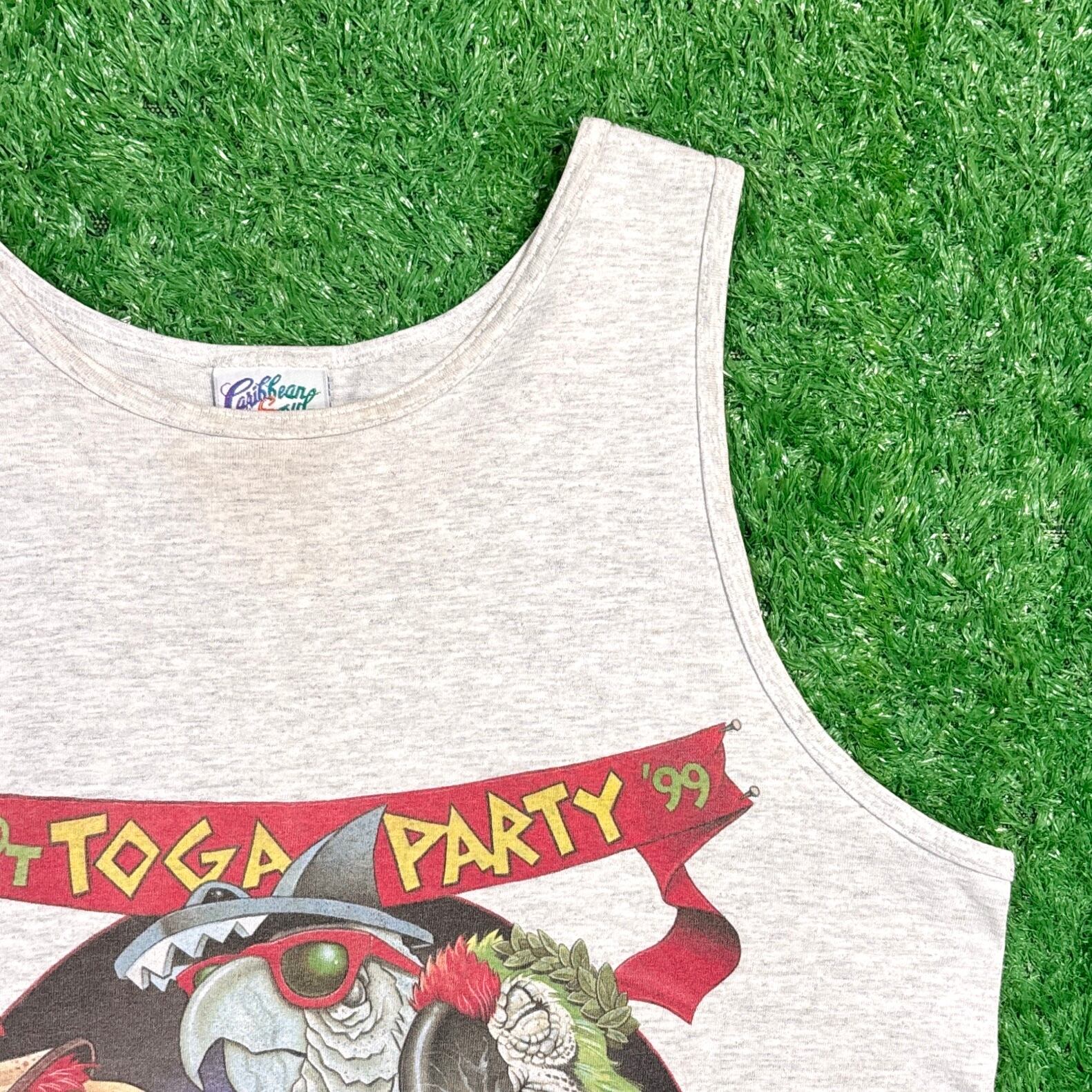 「TOGA PARTY」と題された陽気なパーティー風景がユーモアたっぷりに描かれており、リゾート気分を盛り上げてくれる一枚。ユニークなグラフィックが古着らしい味わいをプラスしています。