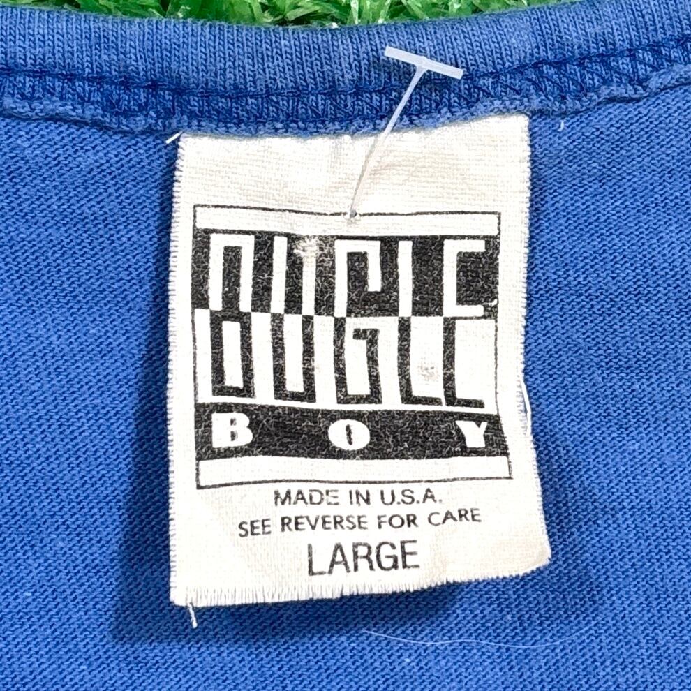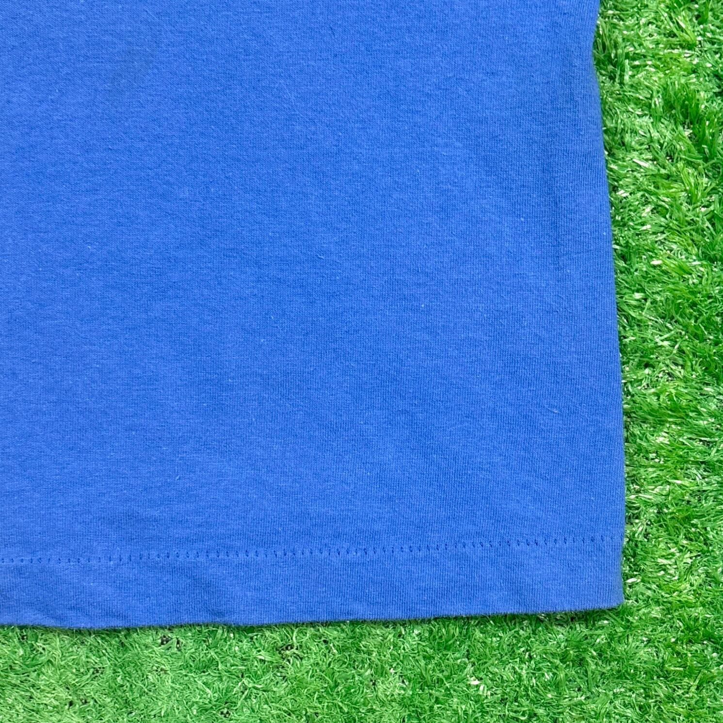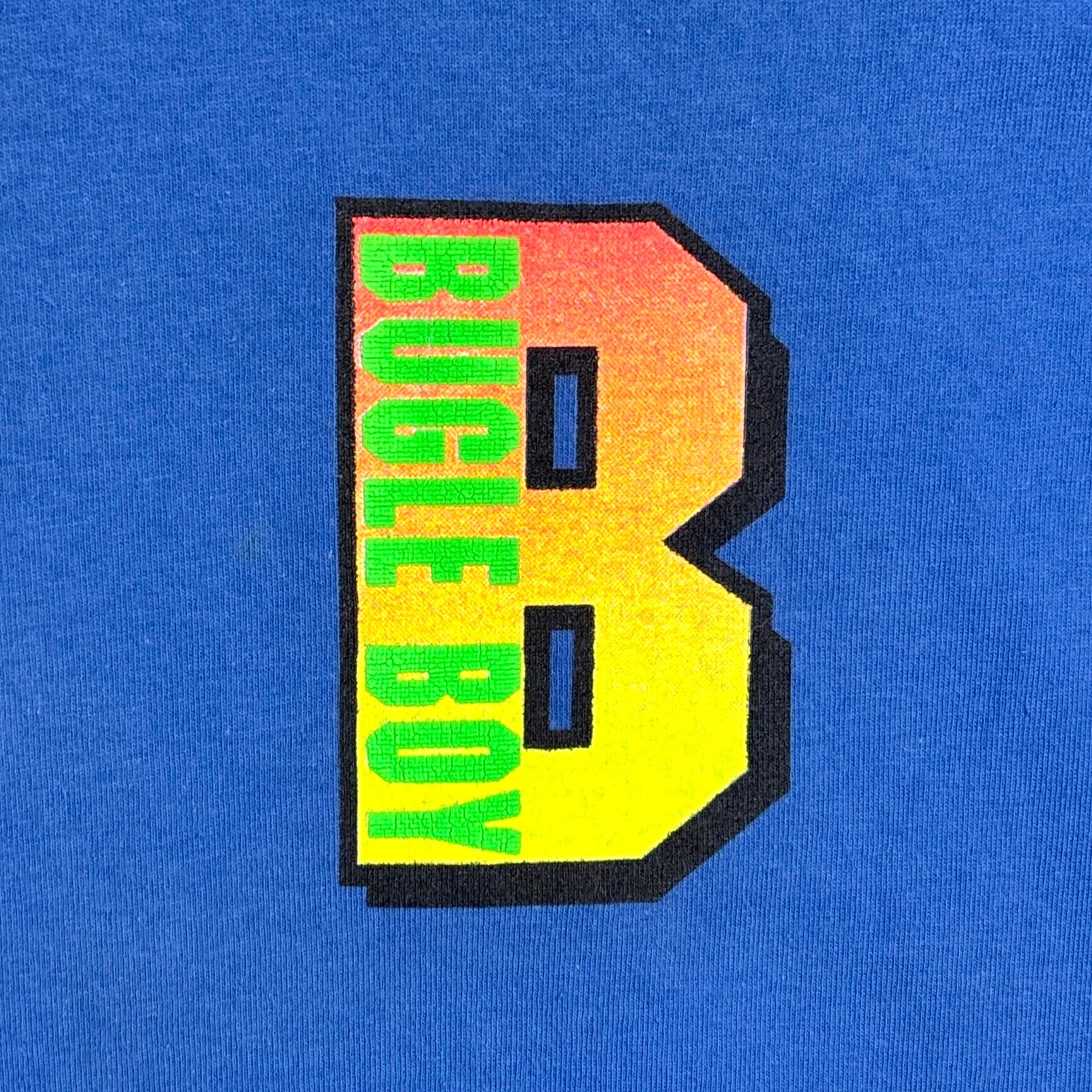 胸元と背中に大きく入った「B」ロゴとローラースケートのイラストが印象的で、当時らしいポップでカラフルなデザインが目を引きます。ブルーのボディに映えるプリントが、レトロな雰囲気とエネルギッシュな印象を与えてくれます。こちらも襟ぐりは広めで、ラフに着られるデザインです。