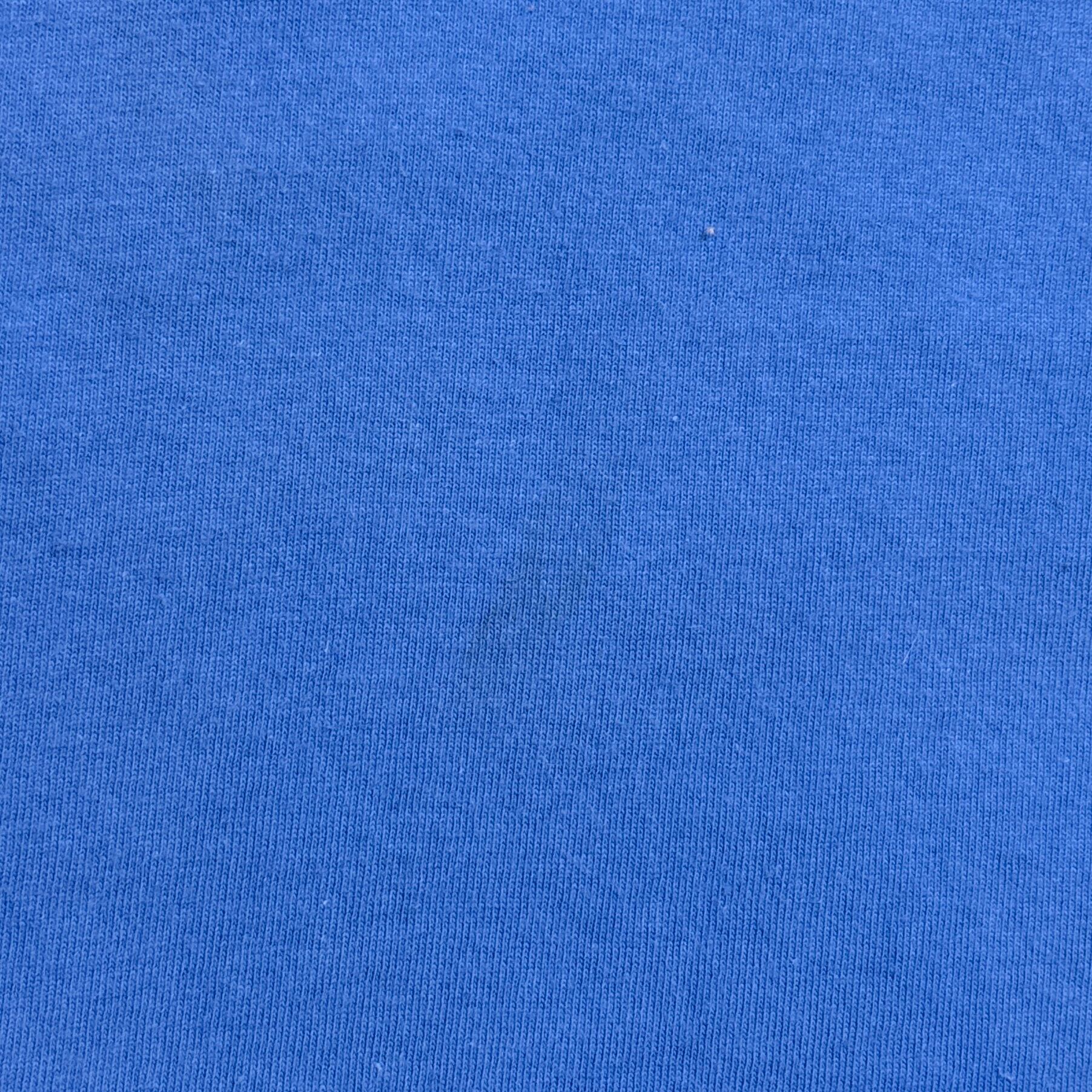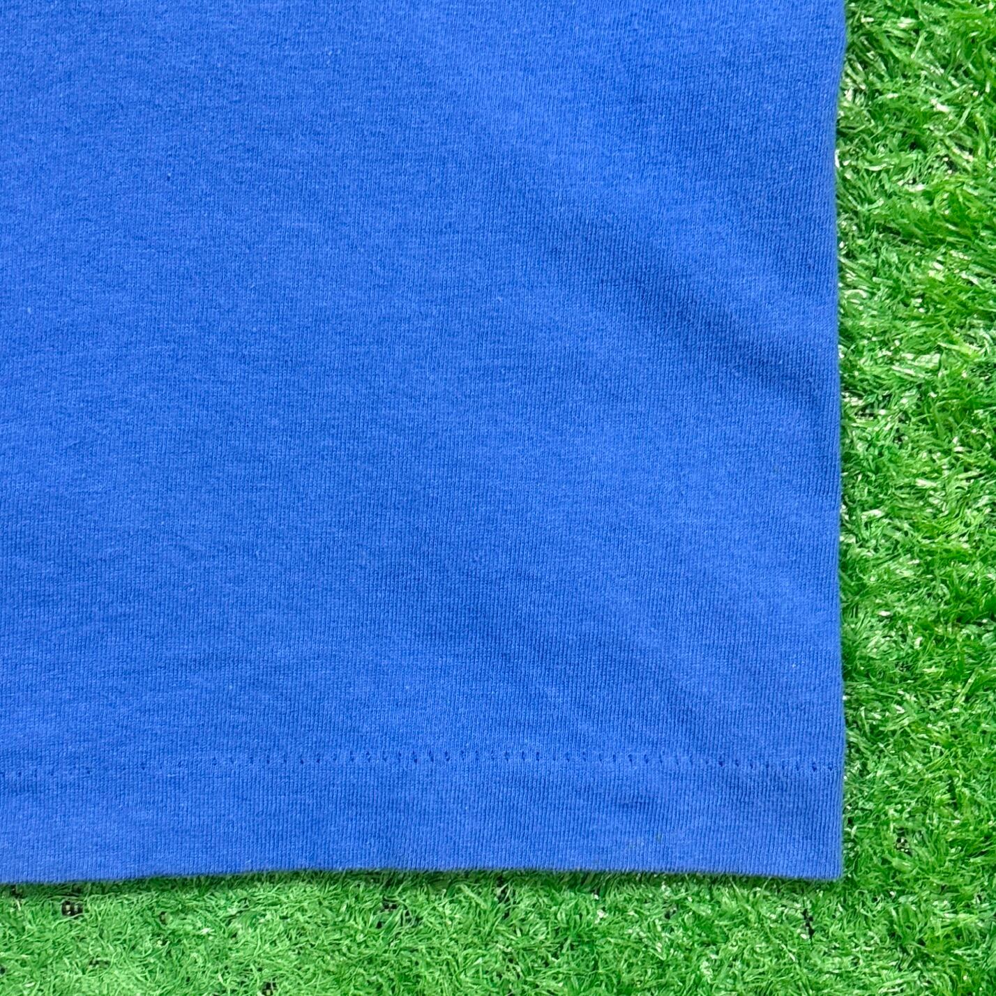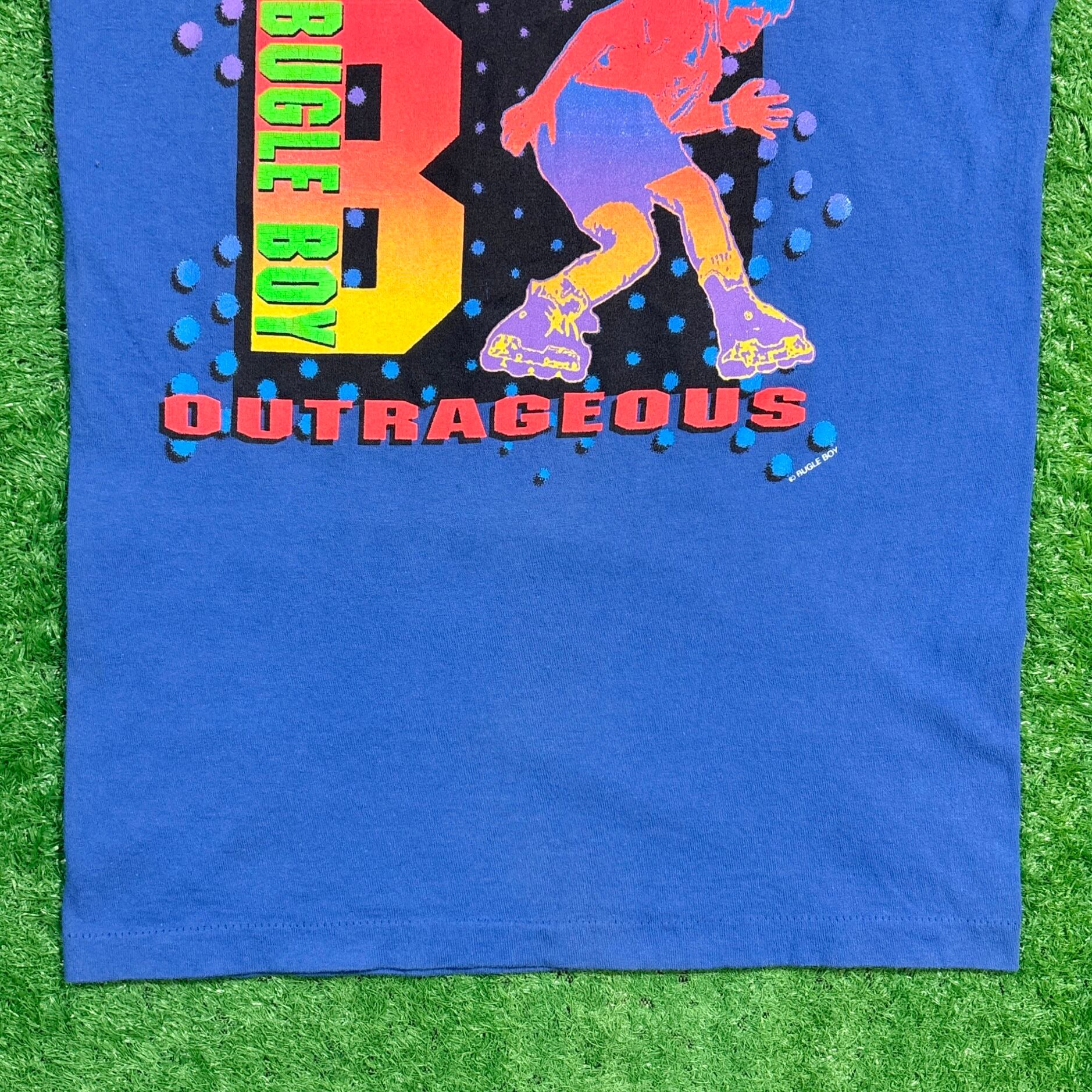 胸元と背中に大きく入った「B」ロゴとローラースケートのイラストが印象的で、当時らしいポップでカラフルなデザインが目を引きます。ブルーのボディに映えるプリントが、レトロな雰囲気とエネルギッシュな印象を与えてくれます。こちらも襟ぐりは広めで、ラフに着られるデザインです。
