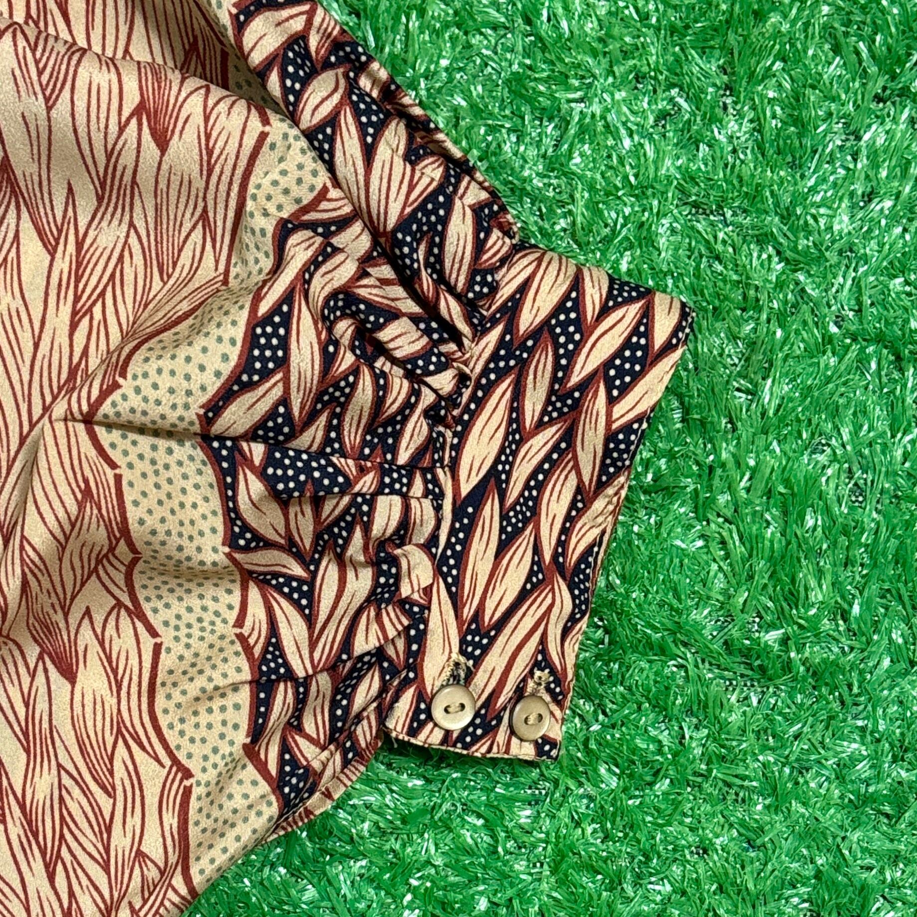 落ち着いたトーンのボタニカルパターンが縦に配置された印象的な総柄デザイン。開襟とスタンドカラーがミックスされたユニークな襟元がアクセントになっています。ウエスト部分にはゴムが入っており、自然なフィット感と女性らしいシルエットを演出。前開きのボタンタイプで羽織りとしても使える便利な1枚。素材はサラッとした柔らかなポリエステル系で、夏場も快適に着られます。ロング丈。