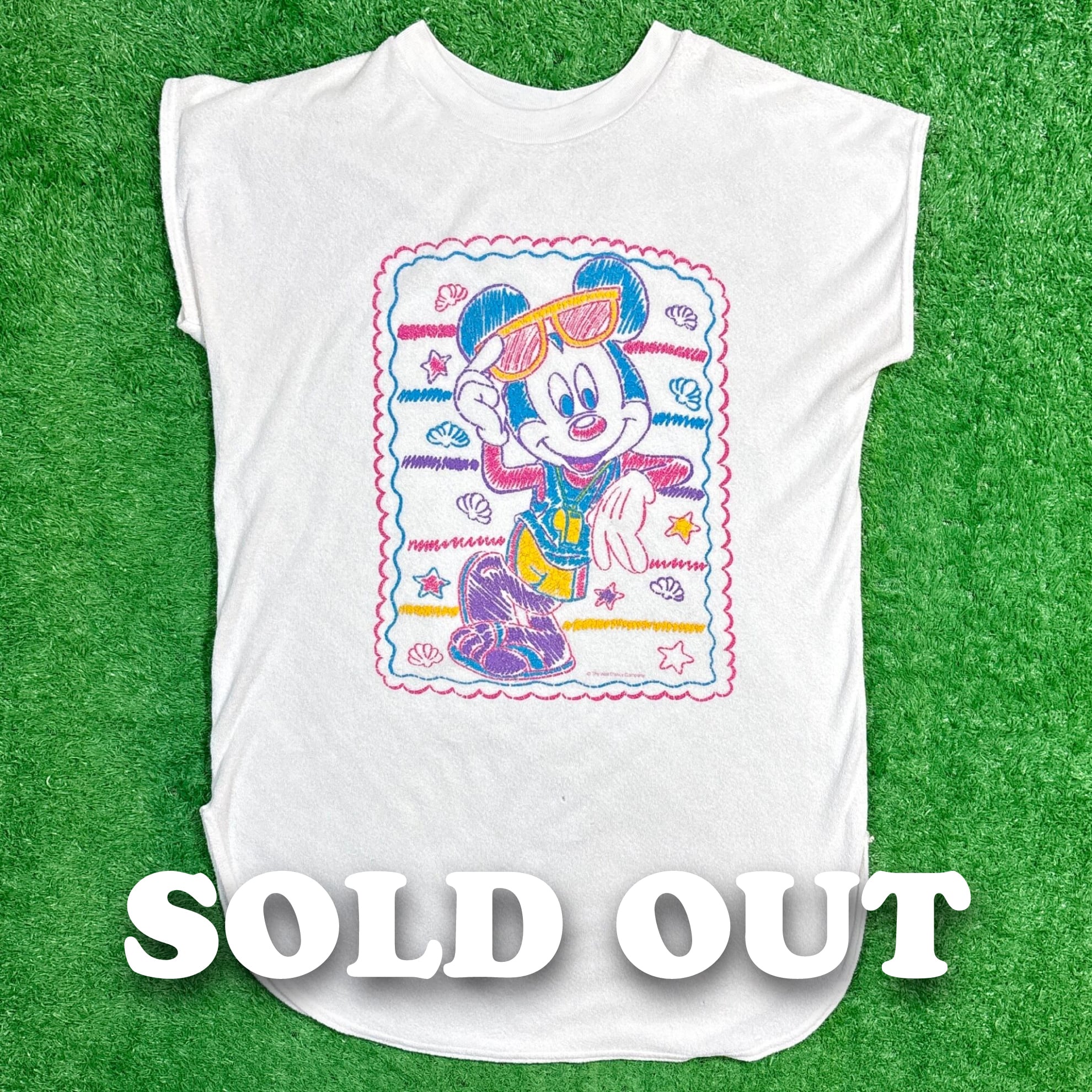 1990年代のミッキーイラストがプリントされた、タオルのようなパイル地素材のトップスです。