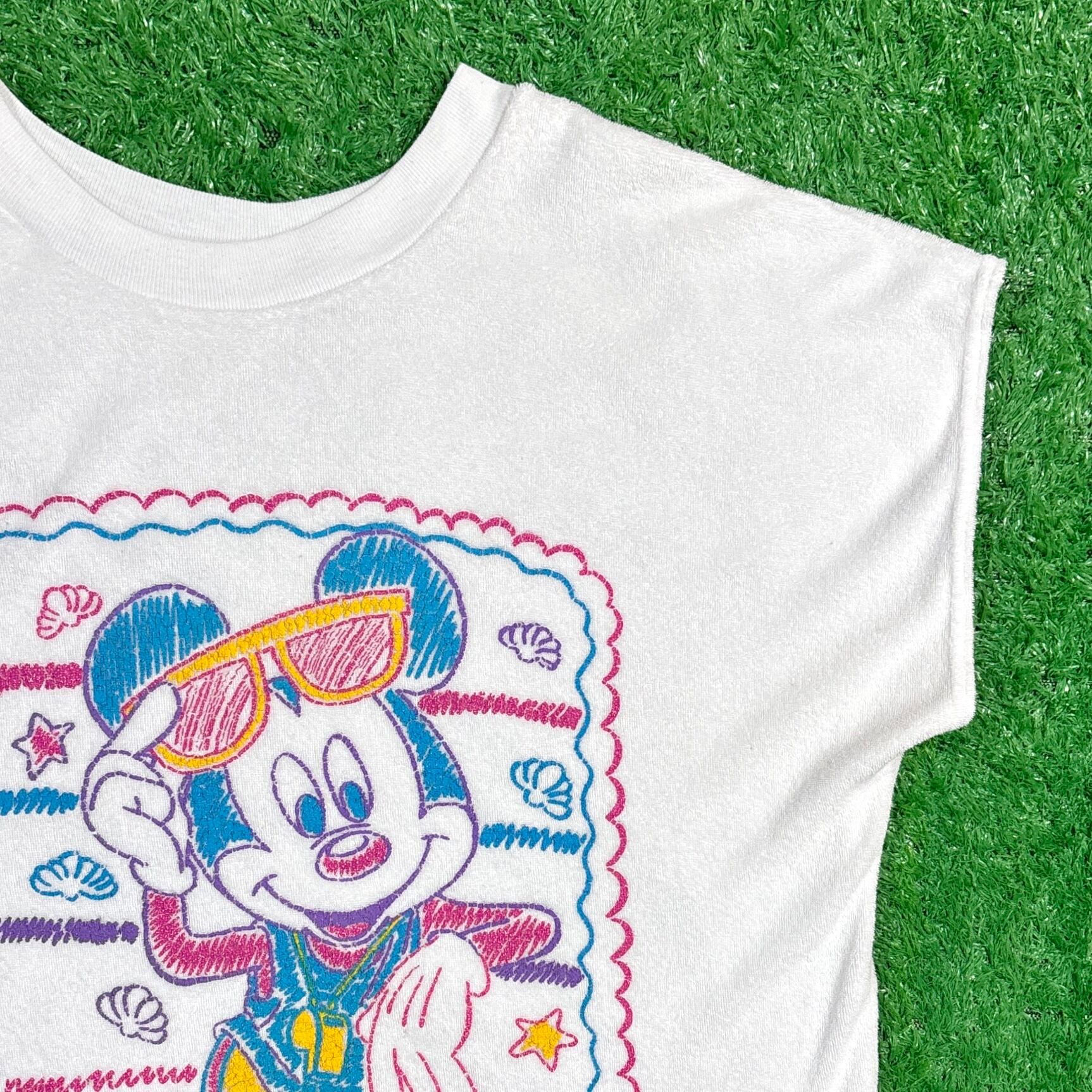 【Lady's】 90s パイル地 Disney Mickey イラスト トップス / 90年代 ミッキー ディズニー タオル地 白 レディース 554