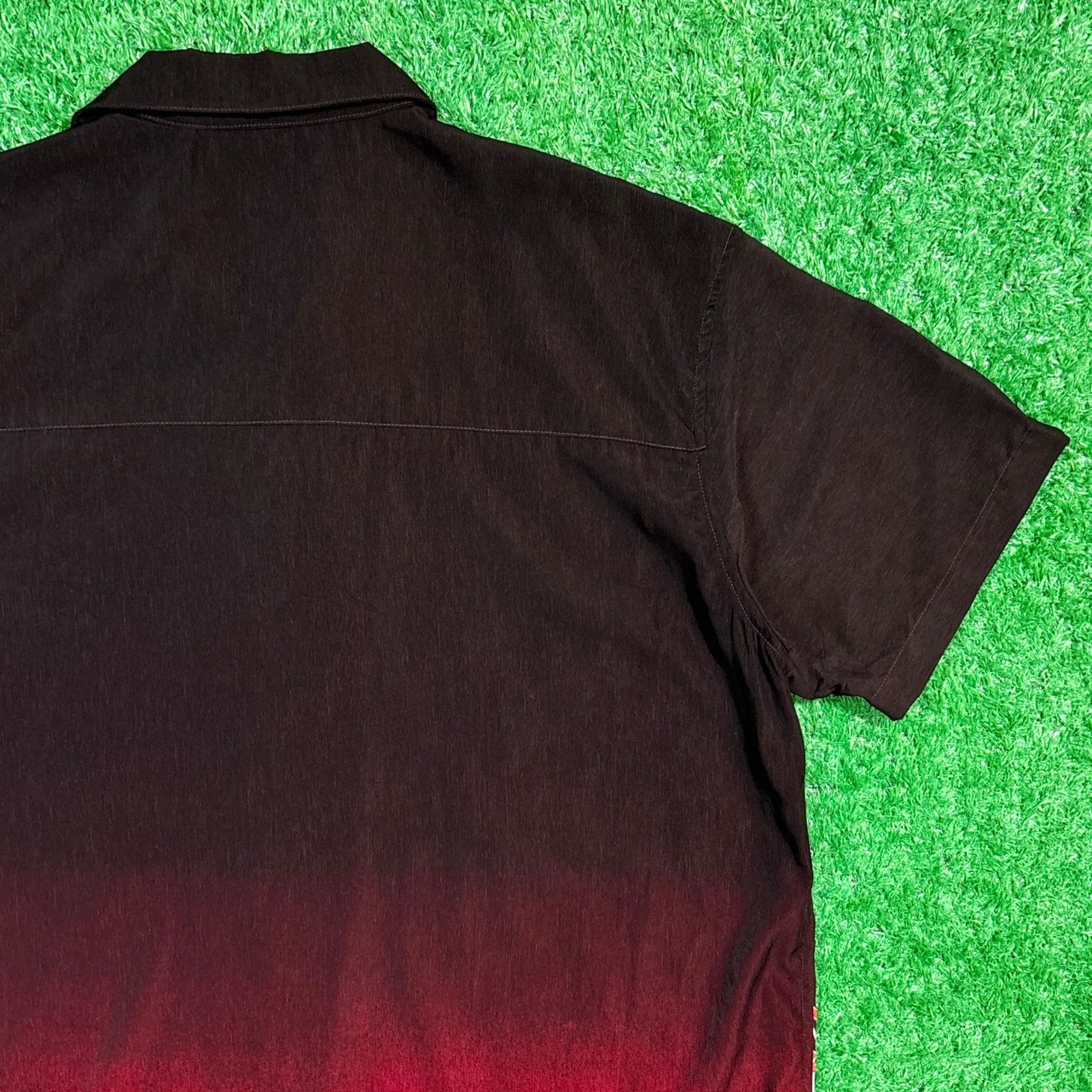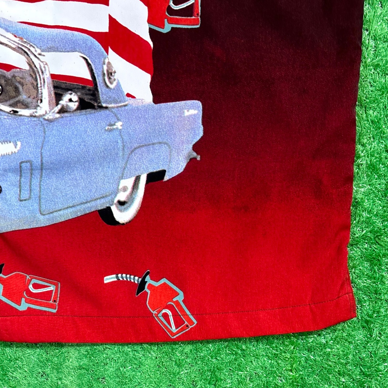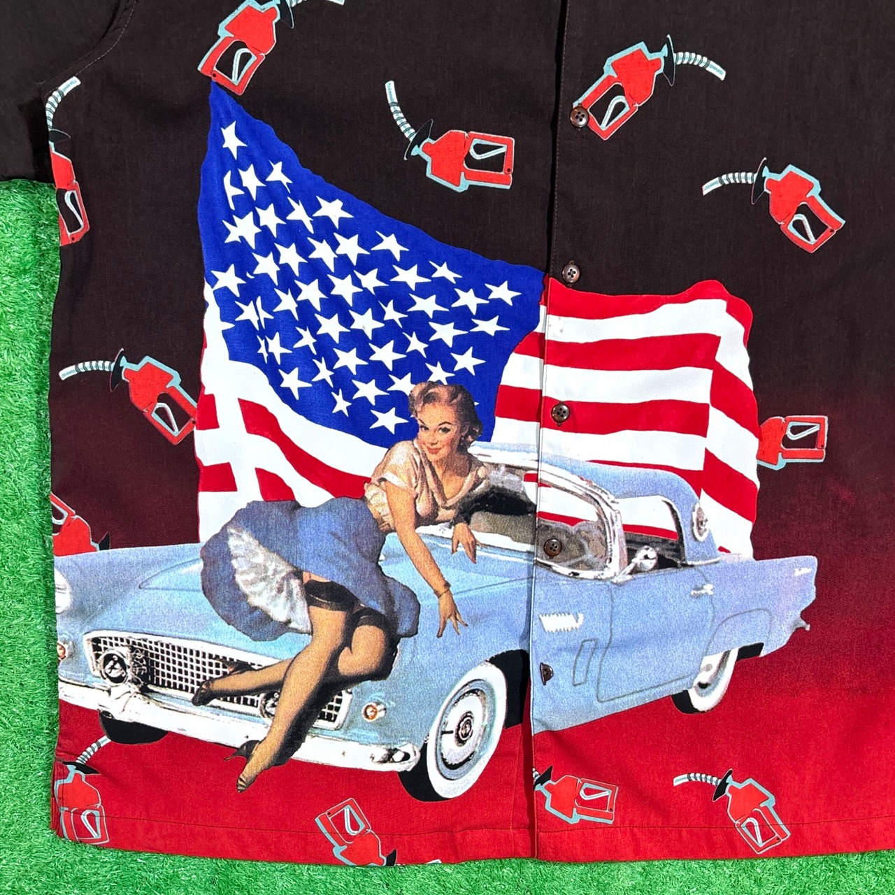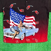 ブラックからレッドへのグラデーションボディに、ピンナップガール、星条旗、クラシックカーが大胆に描かれた、アメリカンカルチャー全開のグラフィックが印象的な一枚。小さなガスポンプ柄も全体に散りばめられ、遊び心のあるデザインに仕上がっています。さらっとしたポリエステル素材で、夏でも軽やかに着られます。