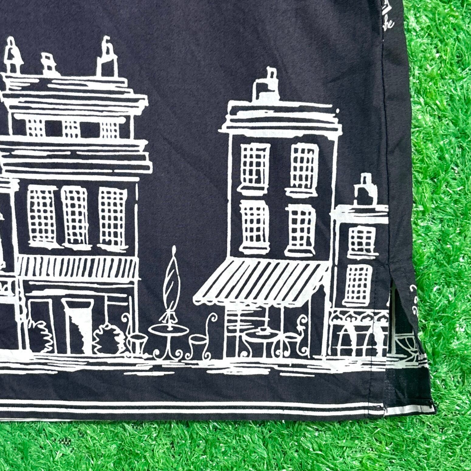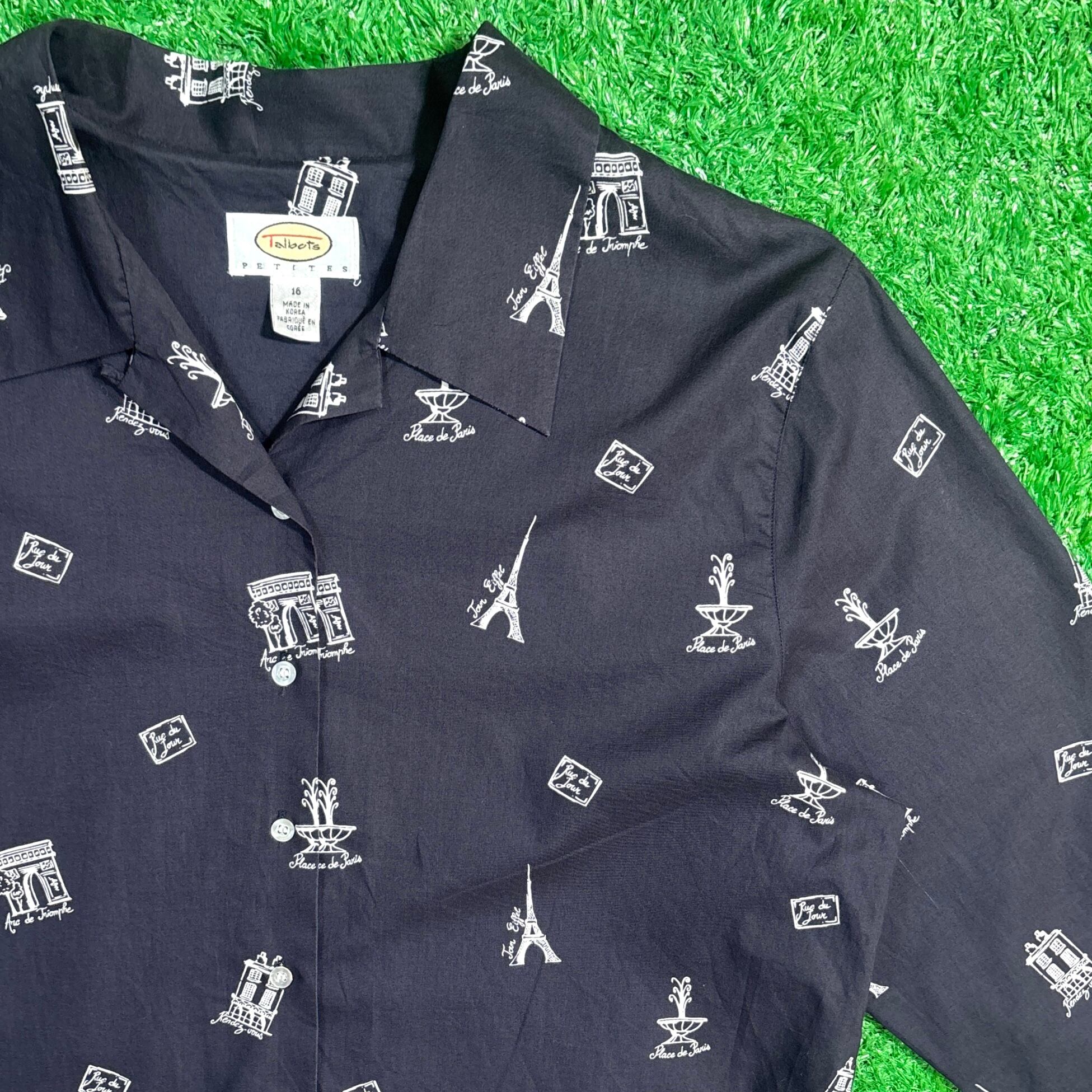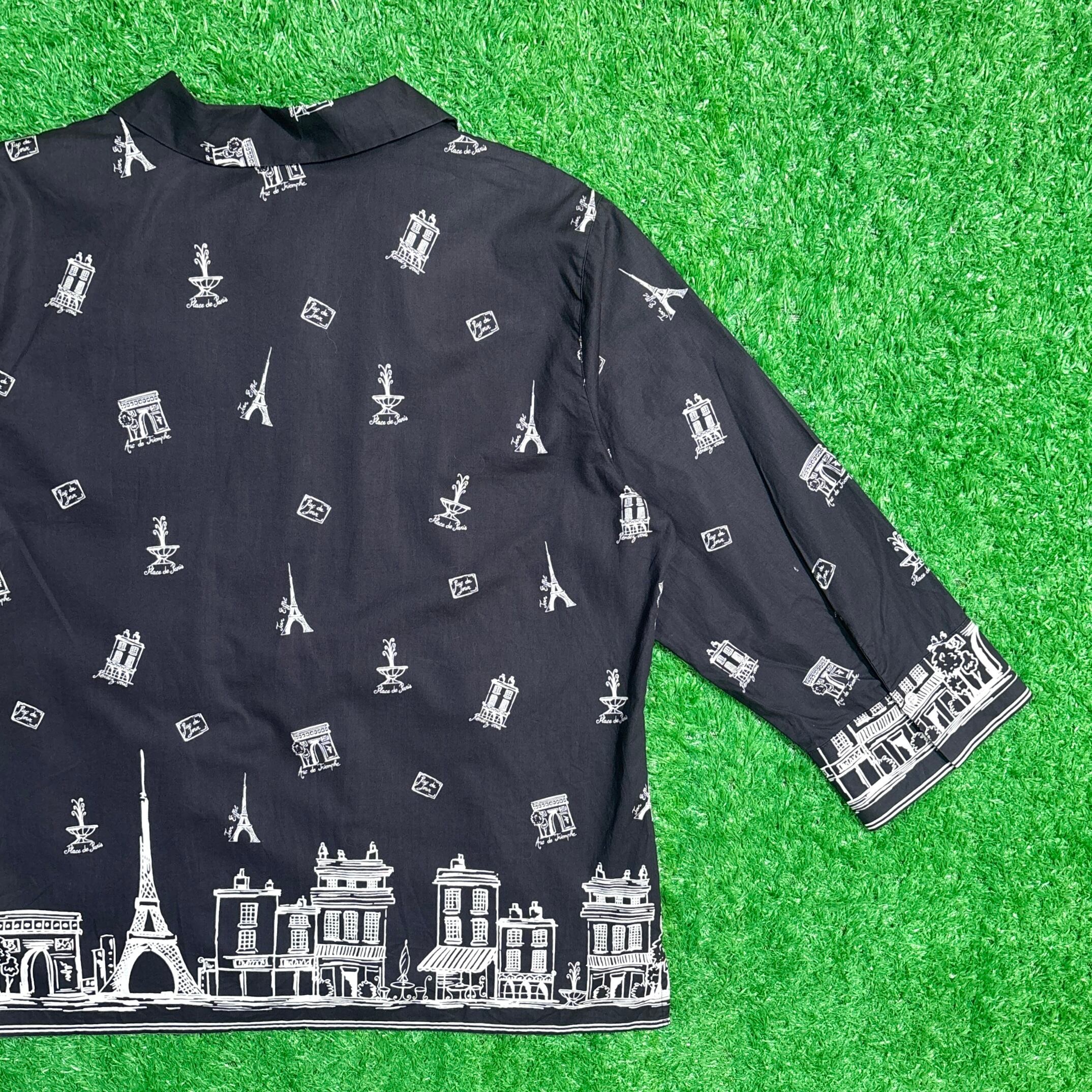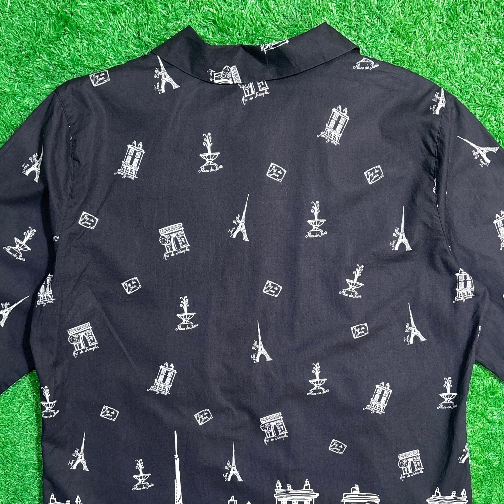 【Lady's】 90s パリ イラスト 7分袖 開襟 シャツ / 90年代 シャツ 黒 ブラック 総柄 レディース 565